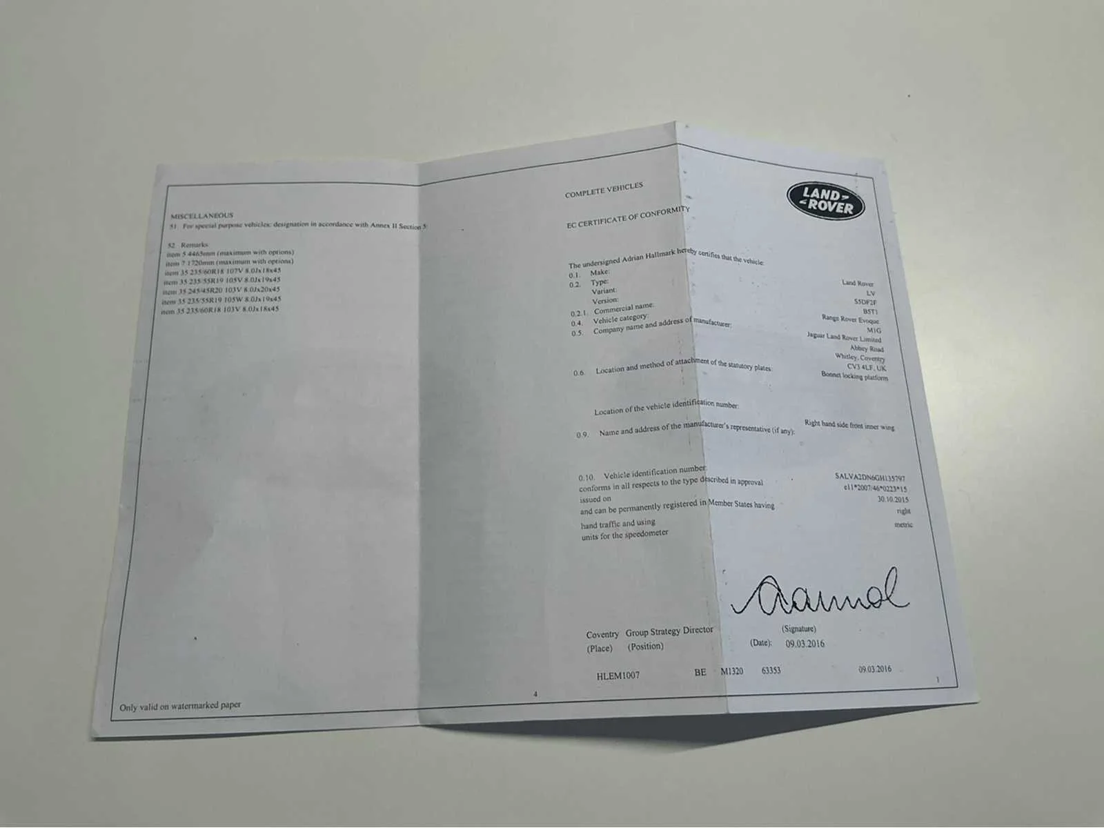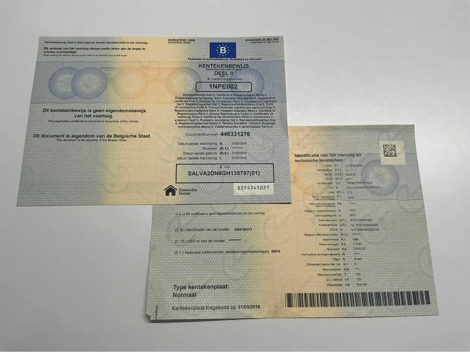 No Kenteken: 1NPE002 Merk: Land Rover Model: Range Rover Evoque Bouwjaar: 2016 Afgelezen kilometerstand: 115642km Cilinderinhoud: 1999cc Vermogen (kW): 110kW Brandstof: diesel Chassisnummer: SALVA2DN6GH135797 Datum eerste toelating: 31/03/2016 Aantal zitplaatsen: 5 Transmissie: Handgeschakeld Emissieklasse: Euro 6b Nationaliteit documenten: Belgische Gelijkvormigheidsattest aanwezig: true Start en rijdt: Ja Vavato voert geen technische keuring uit.: true Inschrijvingsbewijs - deel 1 : Aanwezig Inschrijvingsbewijs - deel 2: Aanwezig
