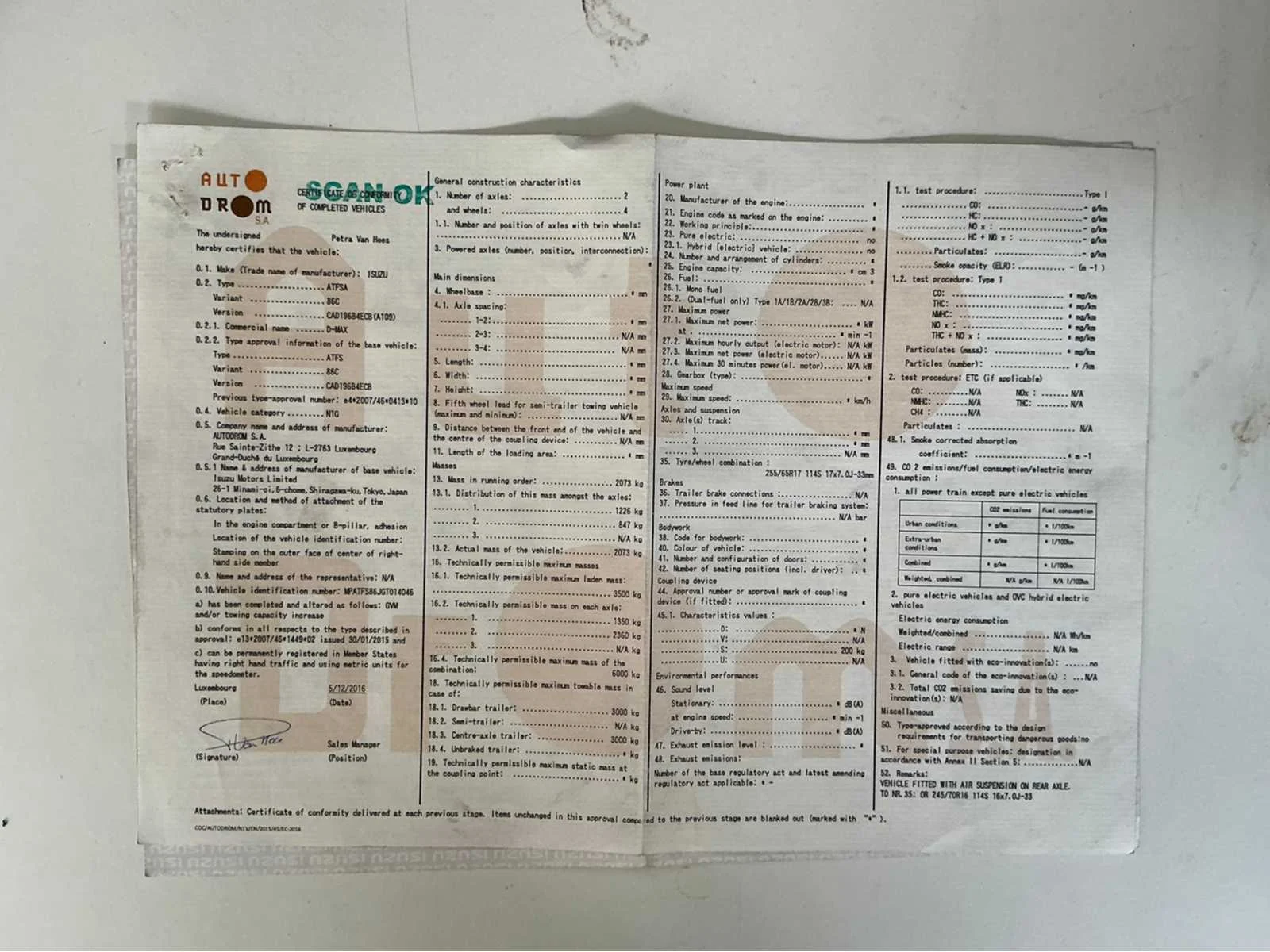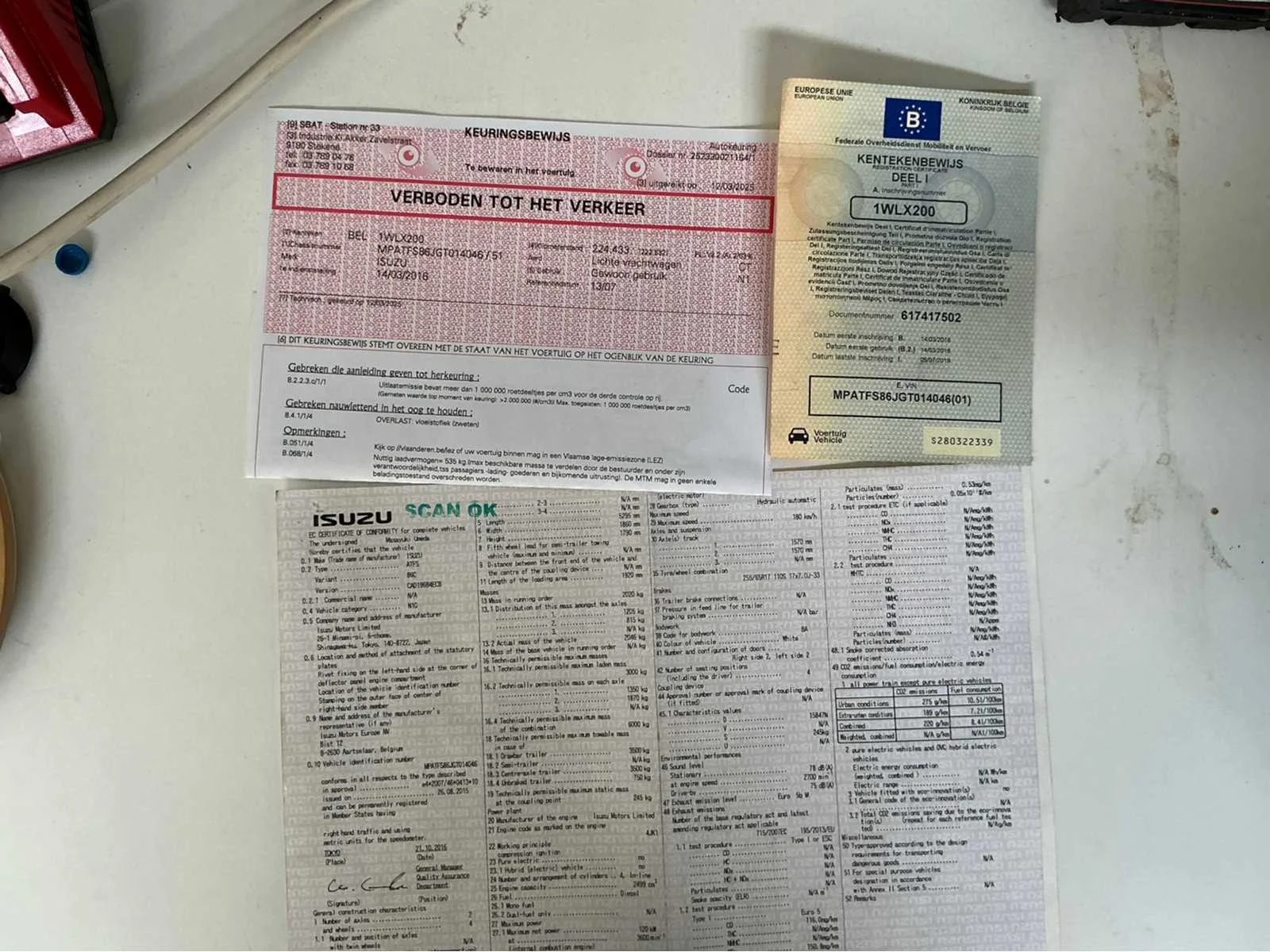 Nee Merk: Isuzu Model: D-max Type: CO.ME.AR Bouwjaar: 2016 Afgelezen kilometerstand: 224661km Cilinderinhoud: 2499cc Vermogen (kW): 120kW Brandstof: diesel Chassisnummer: MPATFS86JGT014046 Laadvermogen: 3500kg Datum eerste toelating: 14/03/2016 Transmissie: Automaat Emissieklasse: Euro5b Aantal deuren: 2 Aantal sleutels: 2 Nationaliteit documenten: Belgisch Gelijkvormigheidsattest aanwezig: true Start en rijdt: Ja Vavato voert geen technische keuring uit.: true Airconditioning: true Inschrijvingsbewijs - deel 1 : Aanwezig Inschrijvingsbewijs - deel 2: Aanwezig