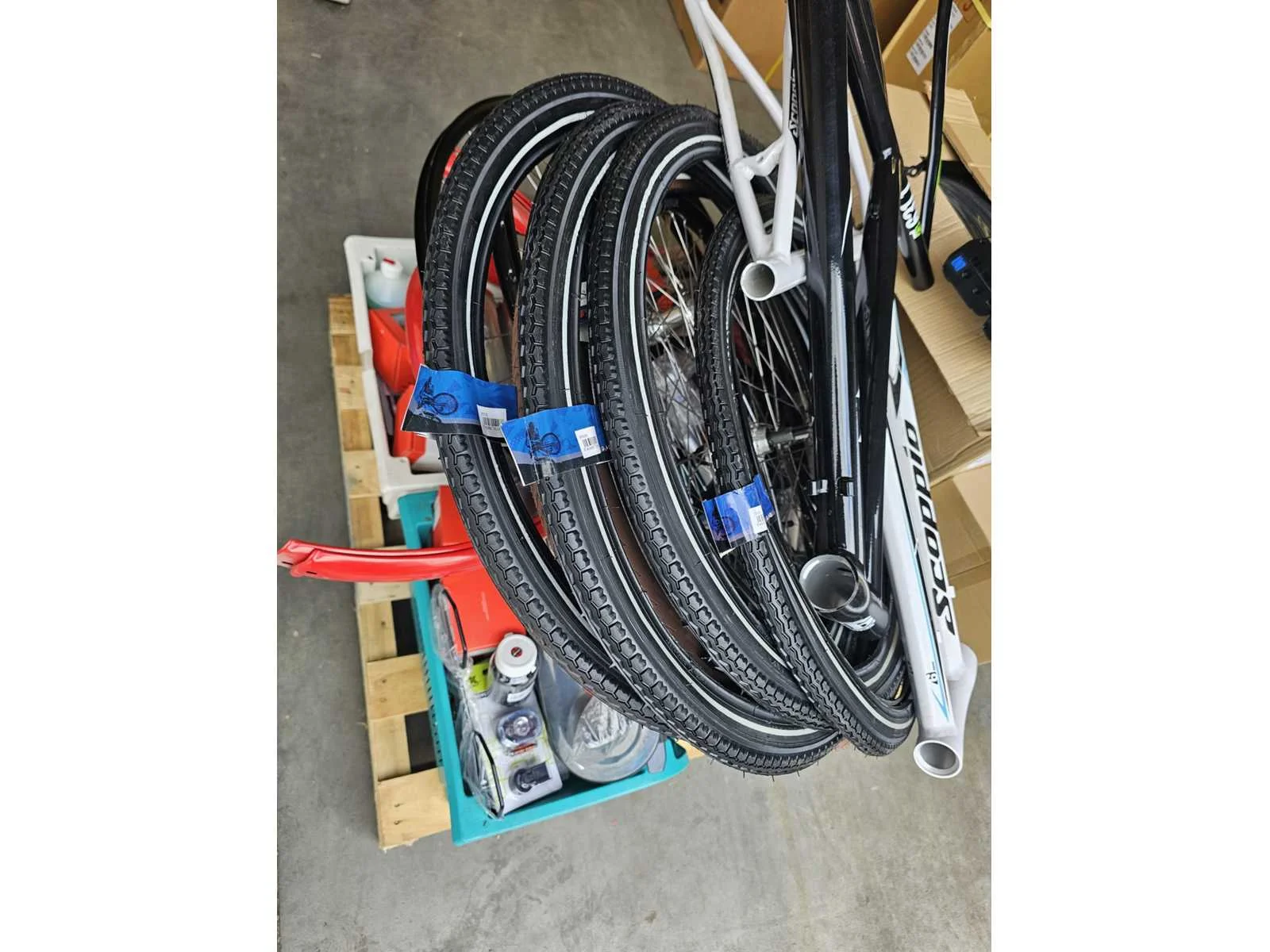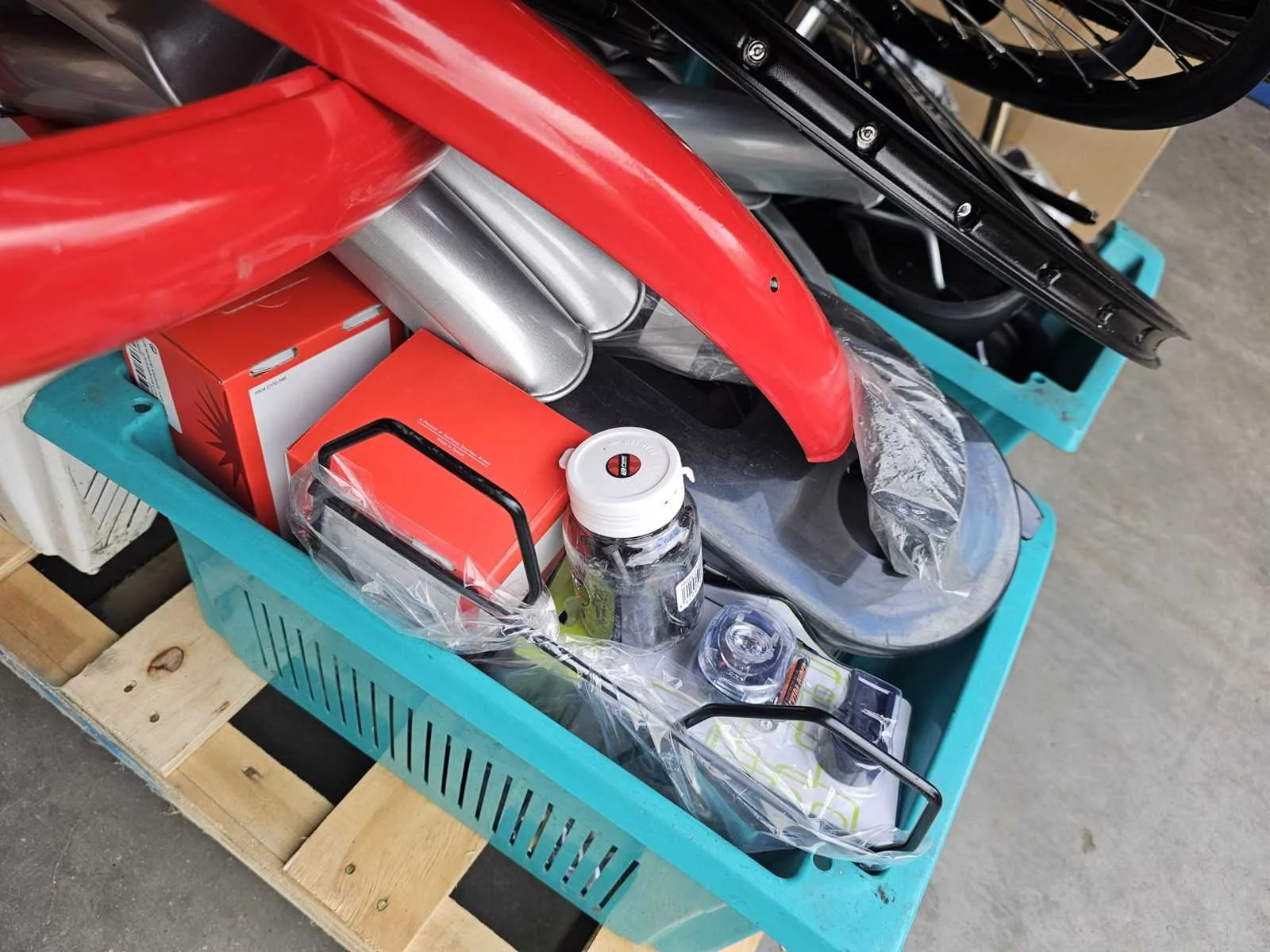 Verschillende fietsonderdelen en accesoires waaronder banden, wielen, versnellingen en nog meer. Inclusief pallet! Nee