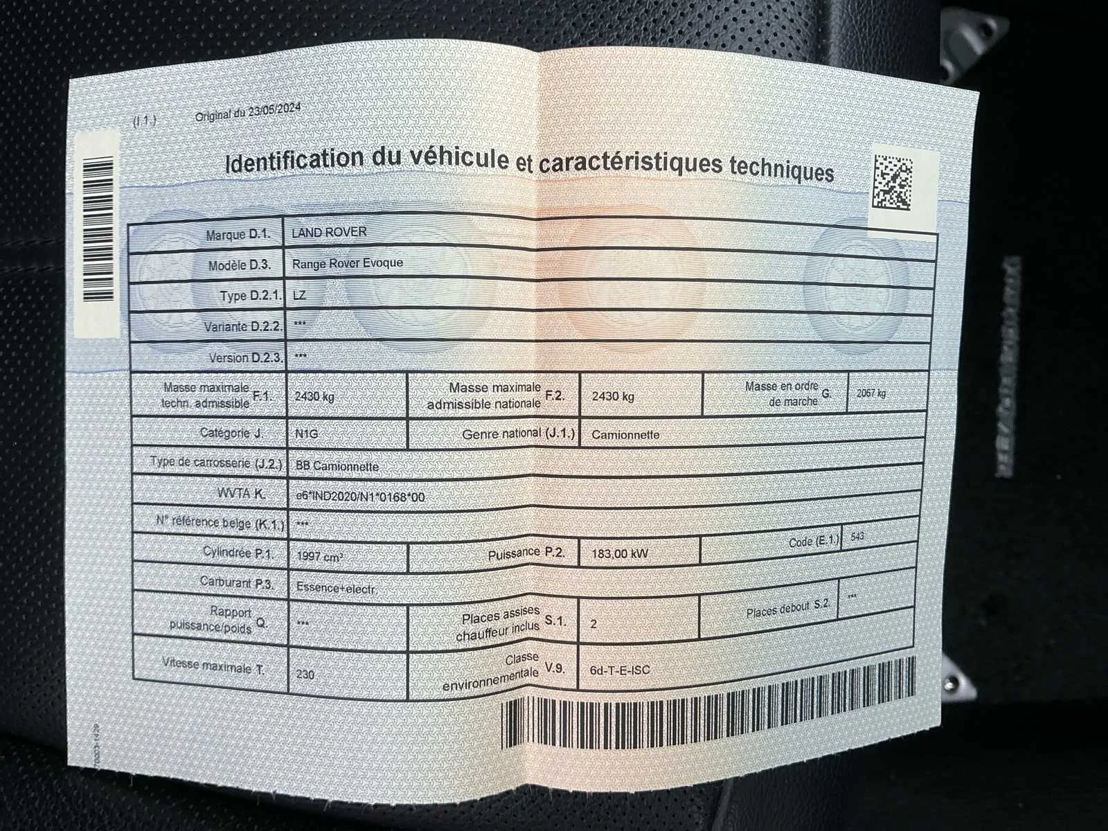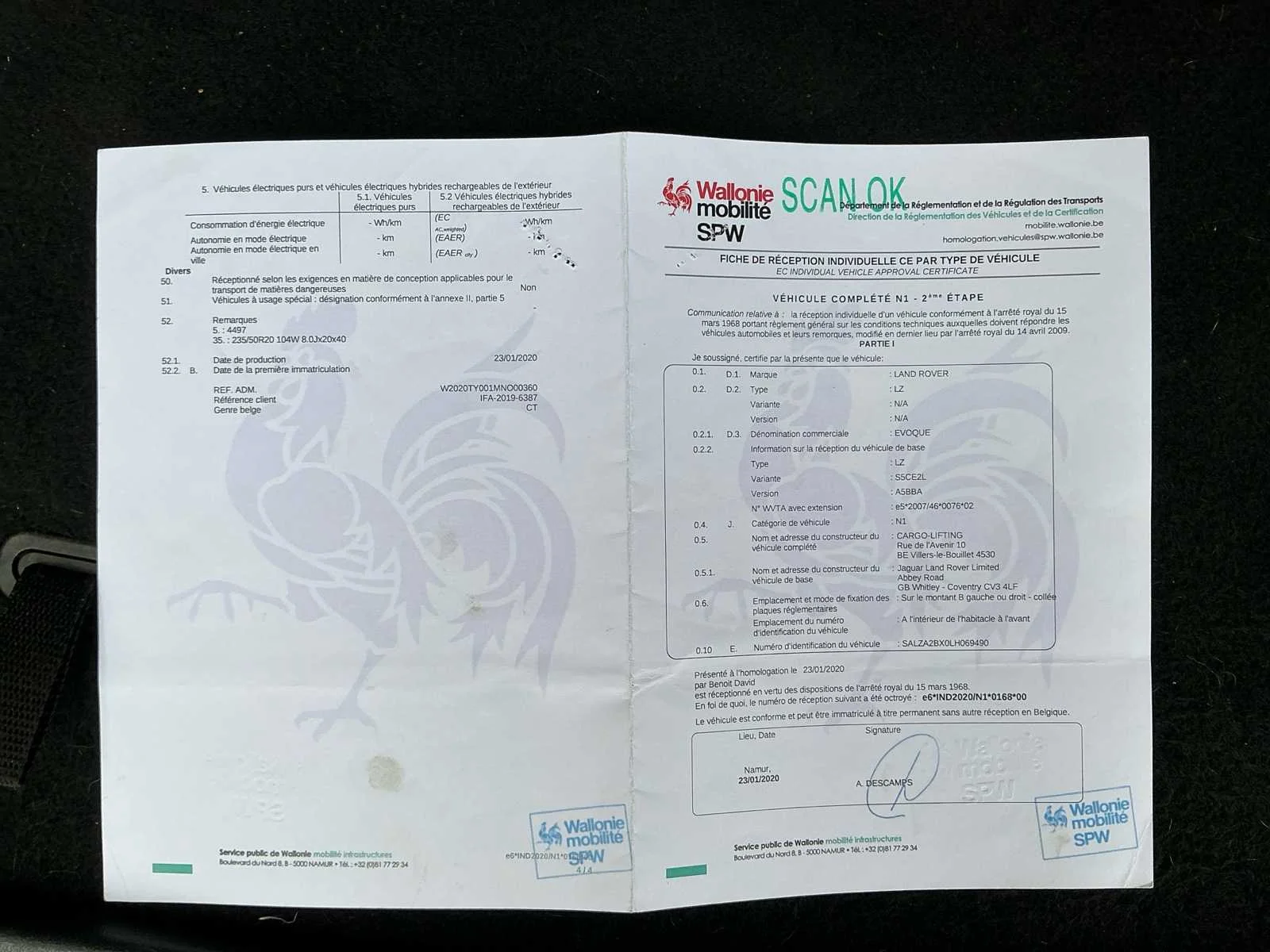 Land Rover Range Rover Evoque R-Dynamic 4WD P250 SE 2020, SUV premium transformé en utilitaire léger. À 59 097 km, état excellent, entretenu exclusivement chez Range Rover Liège. Toit panoramique, navigation, sièges électriques avec mémoire, caméra de recul, et puissance impressionnante de 183 kW sur essence malgré le poids. Avantage fiscal : 100% déductible pour votre société, avec sièges d'origine pour un confort luxe ; sièges arrière neufs jamais installés, montage en quelques tours de vis car très légers. Style, performance et économies No Merk: Land rover Model: Range Rover Evoque R-Dynamic 4WD P250 SE Type: SUV Bouwjaar: 2020 Afgelezen kilometerstand: 59097km Cilinderinhoud: 1997cc Vermogen (kW): 183kW Brandstof: Benzine Chassisnummer: SALZA2BX0LH069490 Datum eerste toelating: 31/01/2020 Aantal zitplaatsen: 2 Kleur: Silver Transmissie: Autmaat Emissieklasse: Euro 6d Aantal deuren: 5 Aantal sleutels: 2 Nationaliteit documenten: Belgisch Gelijkvormigheidsattest aanwezig: true Carpass: true Vavato voert geen technische keuring uit.: true Airconditioning: true Navigatie: true LED-koplampen: true Leder bekleed: true Vierwielaandrijving 4x4: true