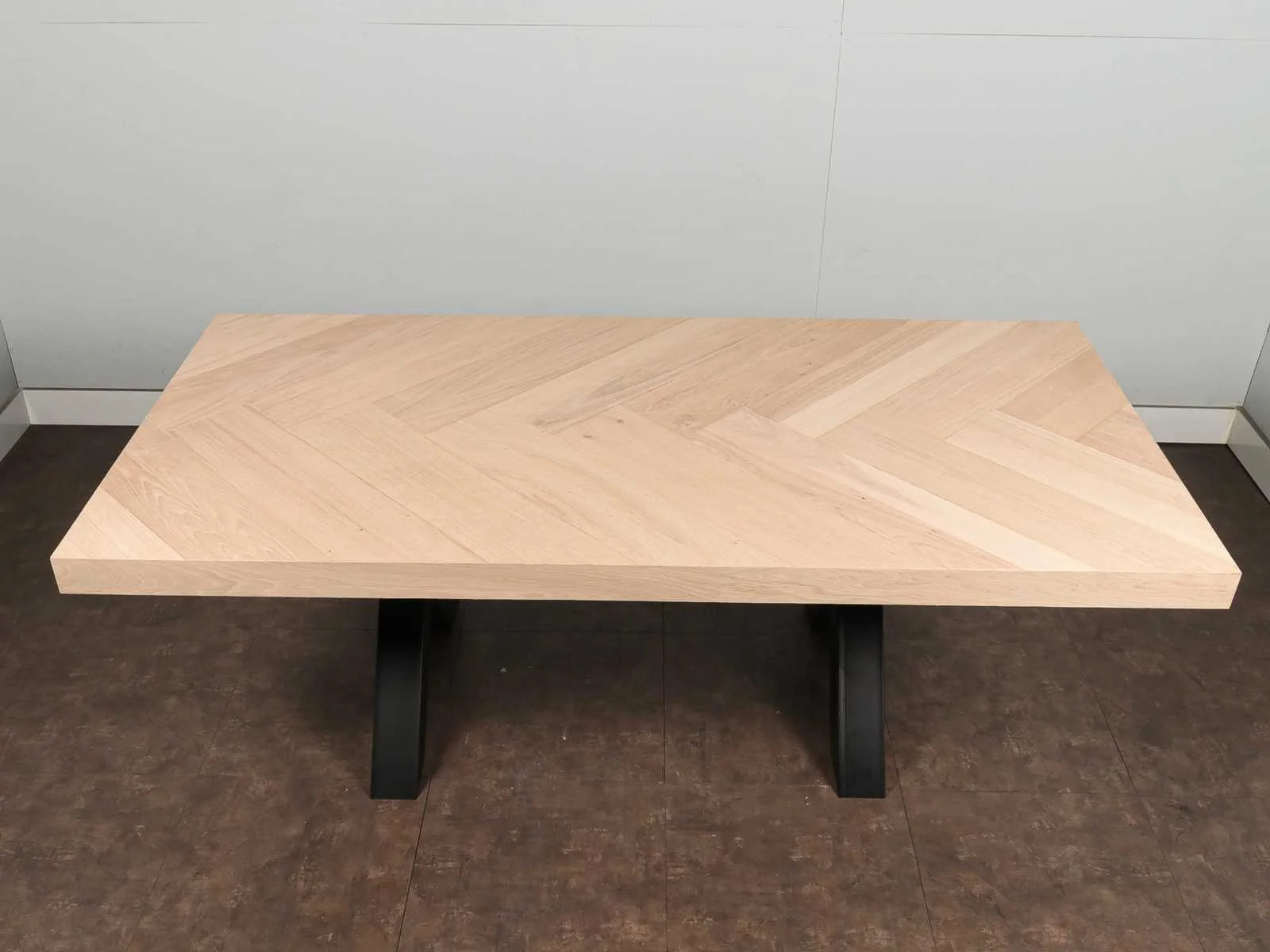 Eettafel, Eiken visgraat op MDF, let op betreft enkel blad, onbehandeld, bevat 1 coli Nee Merk: Roma Product type: Eettafel Kleur: Onbehandeld Gewicht: 30kg Lengte: 1800cm Breedte: 980cm Materiaal: Eiken - MDF