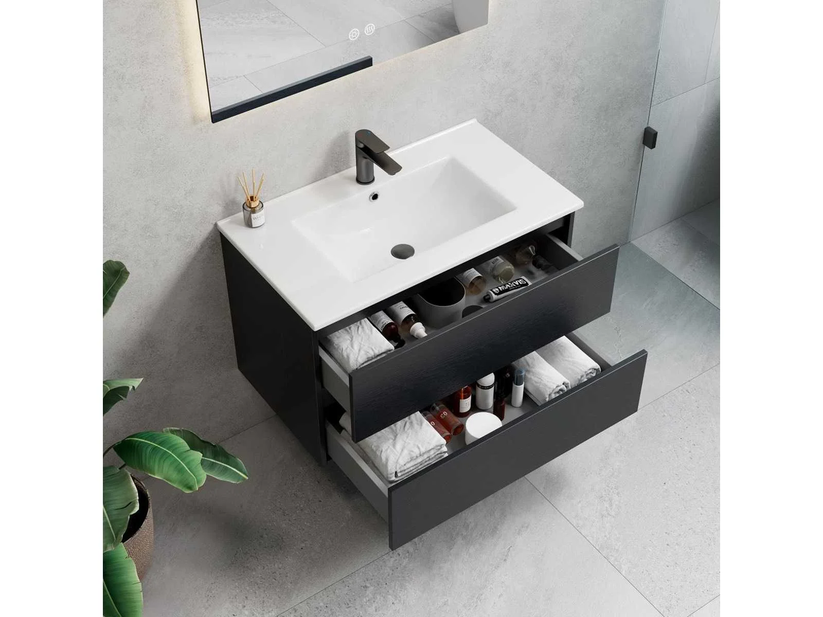 Kraan, krepin sifon en kolomkast niet inbegrepen. No Merk: Lavinno Model: Roma 80-06 Hoogte: 50cm Lengte: 80cm Breedte: 46cm Materiaal: Melamine Kleur: Zwart Eik Wastafel: Mineraalmarmer Spiegel met verlichting: 80x70cm Softclose: true
