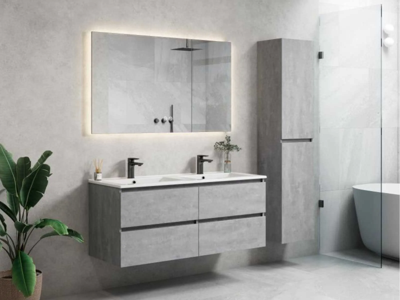 De onderbouwkast van het badkamermeubel bevat 4 laden en is uitgevoerd met een soft close systeem - Kraan, krepin, sifon en kolomkast niet inbegrepen No Merk: Lavinno Model: Roma 120-05 Hoogte: 50cm Lengte: 120cm Breedte: 46cm Materiaal: Melamine Kleur: Beton Grijs Wastafel: Mineraalmarmer Spiegel met verlichting: 120x70cm Softclose: true