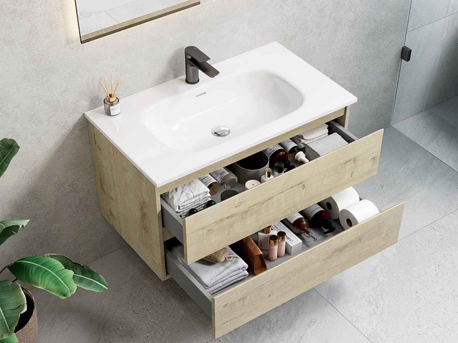 Kraan, krepin sifon en kolomkast niet inbegrepen. No Merk: Lavinno Model: Roma 80-07 Hoogte: 50cm Lengte: 80cm Breedte: 46cm Materiaal: Melamine Kleur: Licht Eik Wastafel: Mineraalmarmer Spiegel met verlichting: 80x70cm Softclose: true