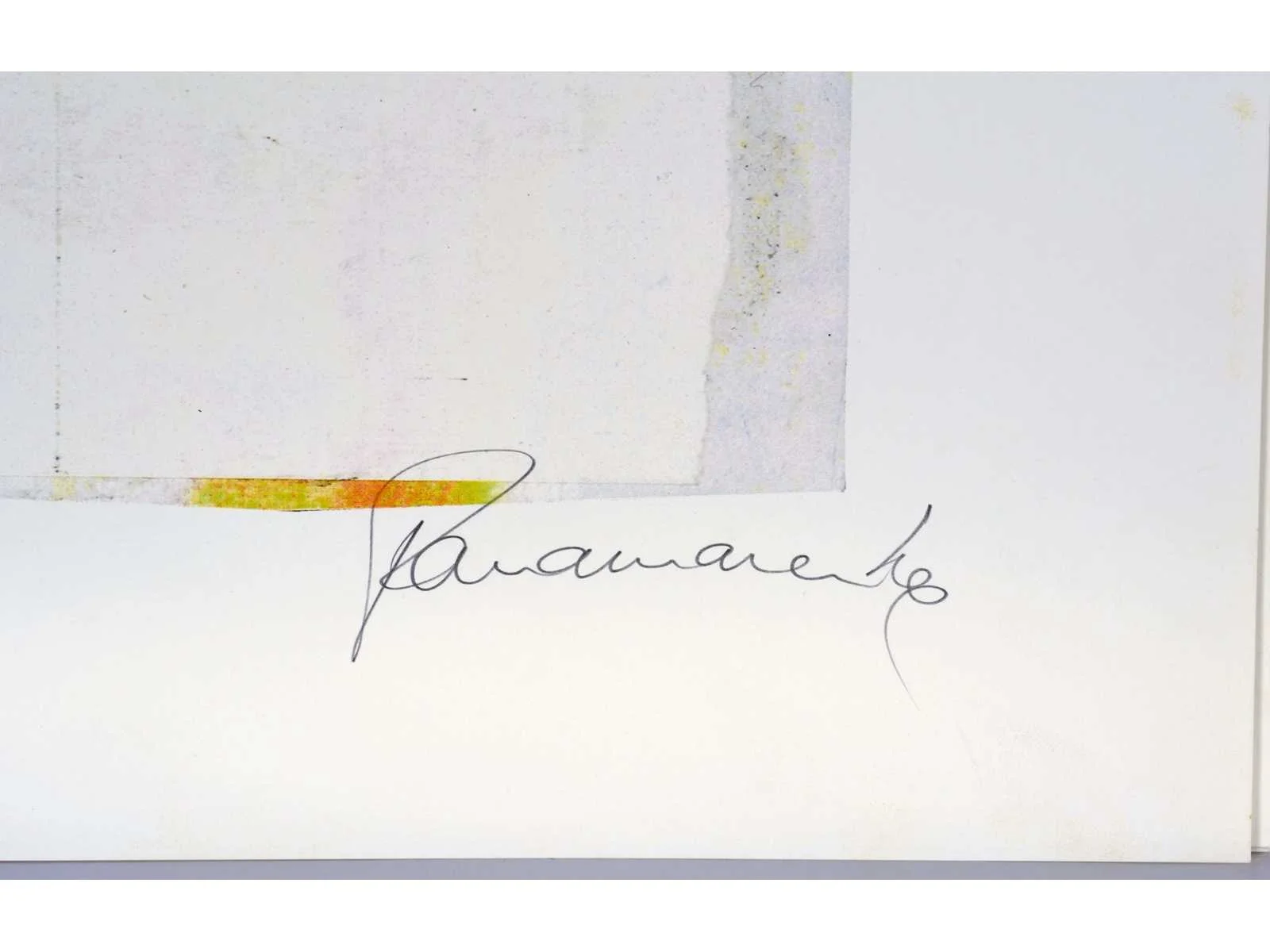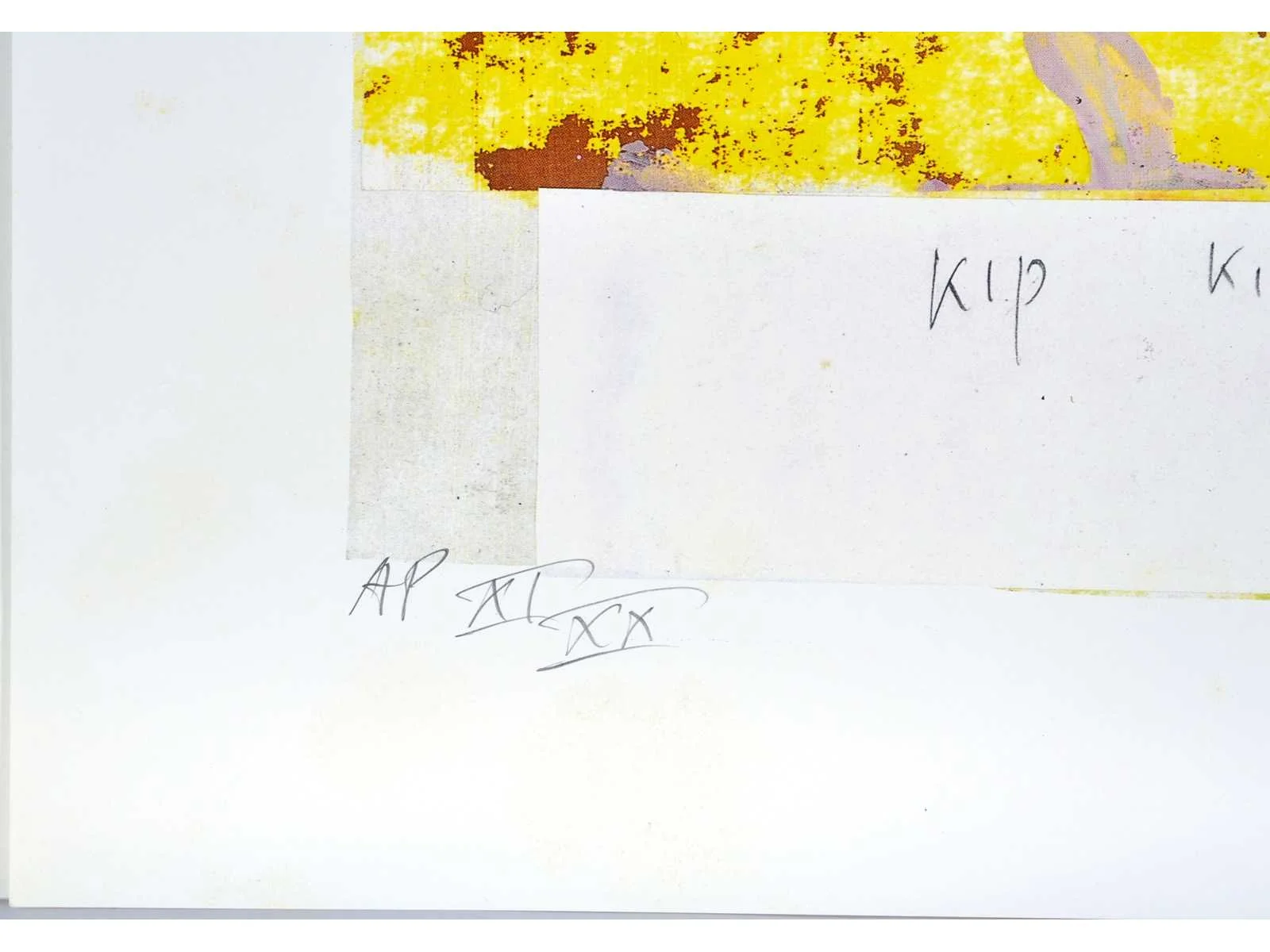 Originele zeefdruk van Panamarenko - licht bevlekt in de witte marge links boven (volledig weg te werken met passe-partout) - Bijgevoegd: de originele map van de uitgave (bevlekt) - galerieprijs: 3.000 € Nee Kunstenaar: Panamarenko (Antwerpen 1940-2019) Titel van werk: De kip Periode: 1990 Techniek: zeefdruk Handtekening/oplage: true Oplage: AP XI/XX Gesigneerd: gesigneerd, genummerd en gedateerd Hoogte: 54cm Breedte: 38cm