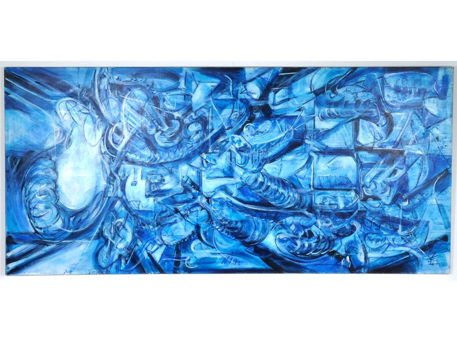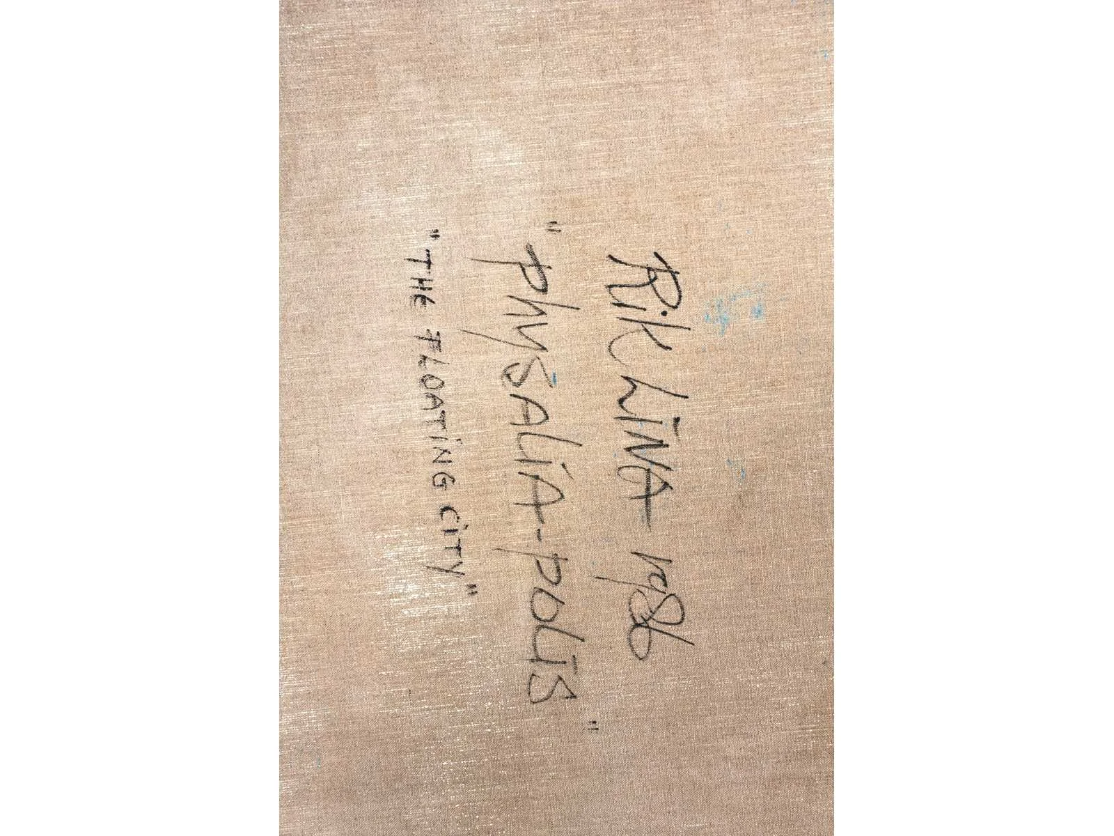 Rechtsonder gesigneerd én verso gesigneerd, betiteld en gedateerd - Galerieprijs: 6.000 € - Een monumentaal werk uit Rik Lina’s iconische onderwaterperiode, waarin de kunstenaar zijn fascinatie voor de oceaan vertaalde naar visionaire, organische werelden vol licht, beweging en diepte. Lina’s werk uit deze periode is sterk beïnvloed door zijn duikervaringen in het Caribisch gebied en zijn betrokkenheid bij de Caribische surrealistische groep “Gruppo Surrealista Internacional”. Nee Kunstenaar: Rik Lina (1942) Titel van werk: Phaysalia-polis "The floating city" Datering: 1986 Techniek: olie op doek Handtekening/oplage: true Oplage: Origineel Gesigneerd: Gesigneerd Hoogte: 300cm Breedte: 140cm Frame: true