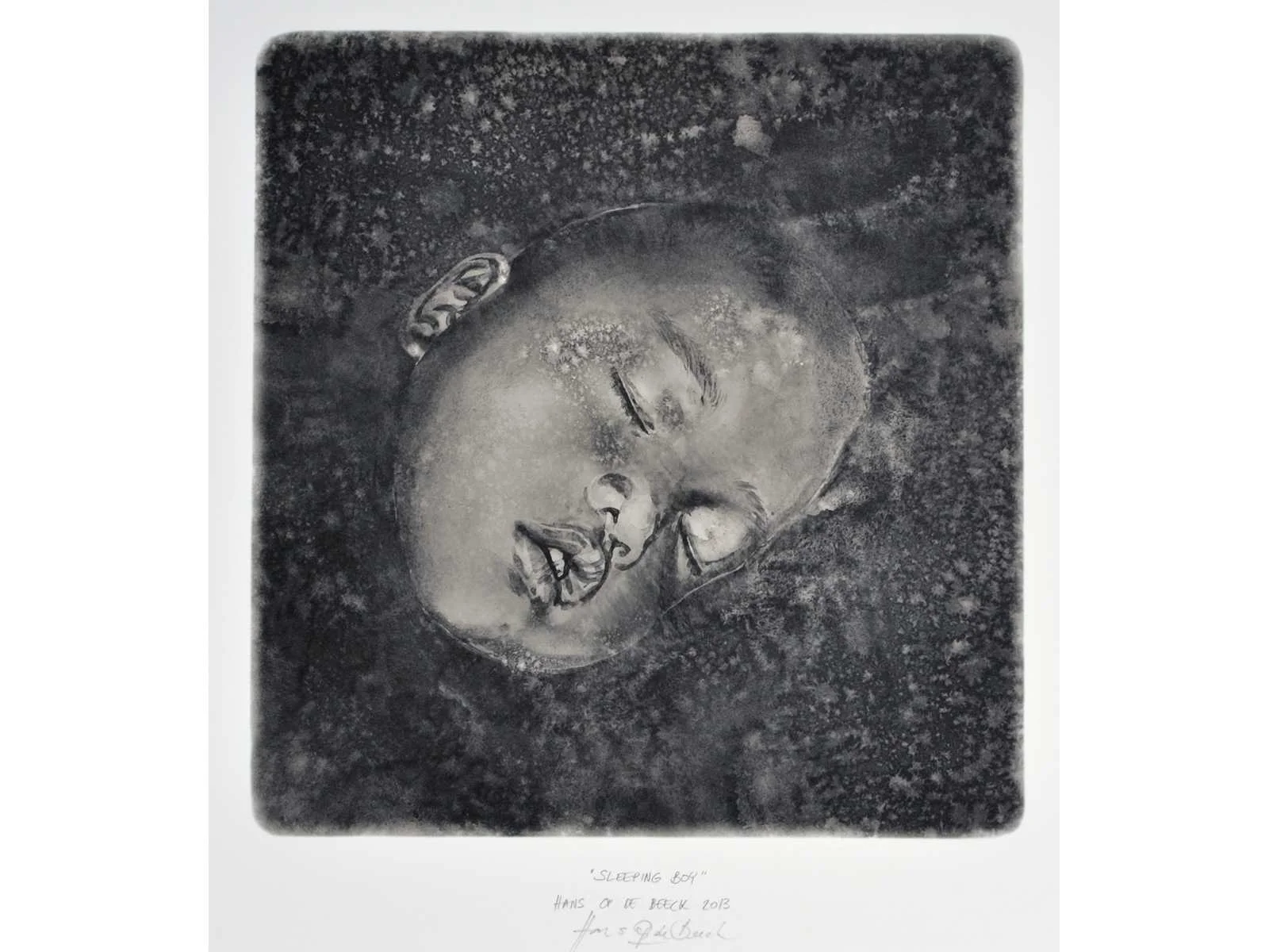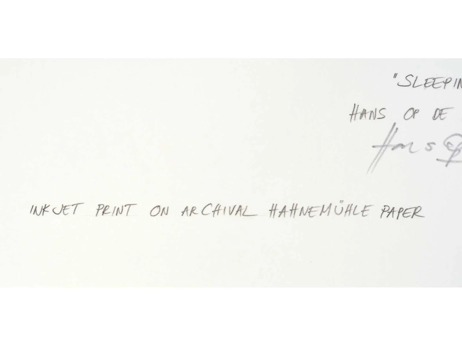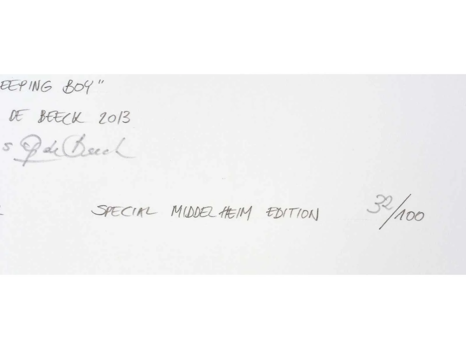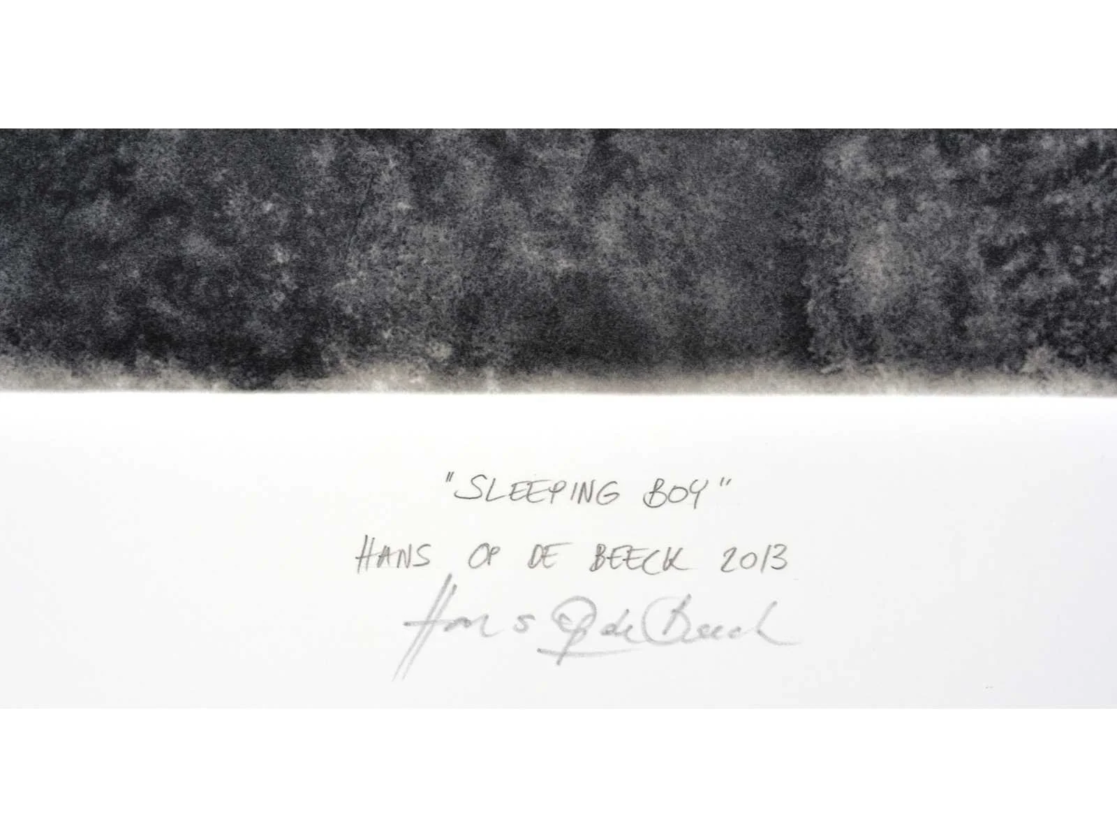 Uitgever: Middelheim Promotors (Antwerpen) Nee Kunstenaar: Hans Op de Beeck (Turnhout, 1969) Titel van werk: Sleeping boy Datering: 2013 Techniek: inkjet print Materiaal: op Archival Hahnemülhe papier Handtekening/oplage: true Oplage: 32/100 Gesigneerd: Gesigneerd en genummerd Hoogte: 30cm Breedte: 21cm Frame: false