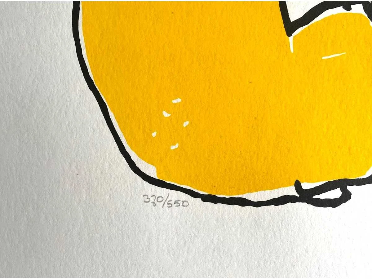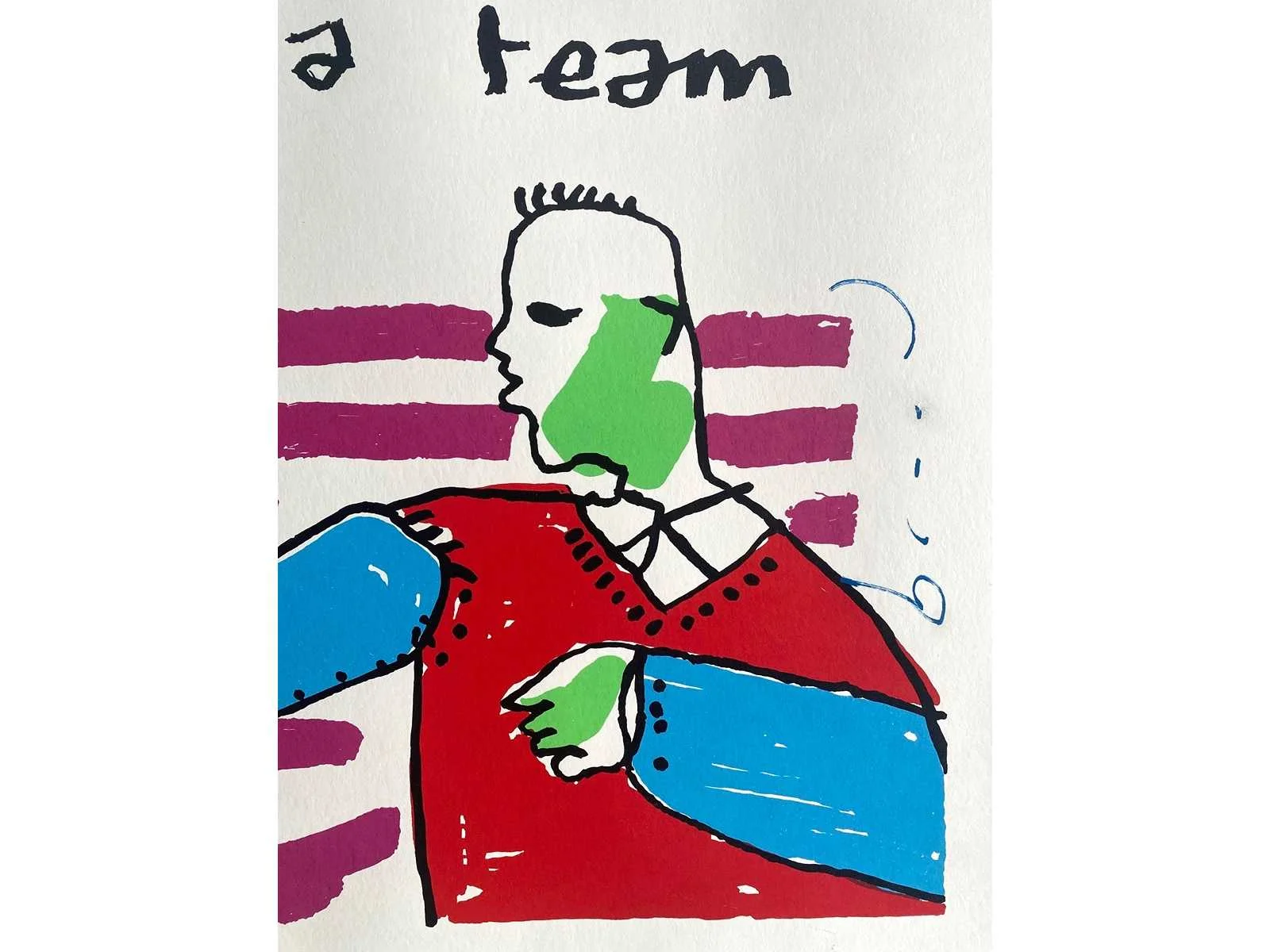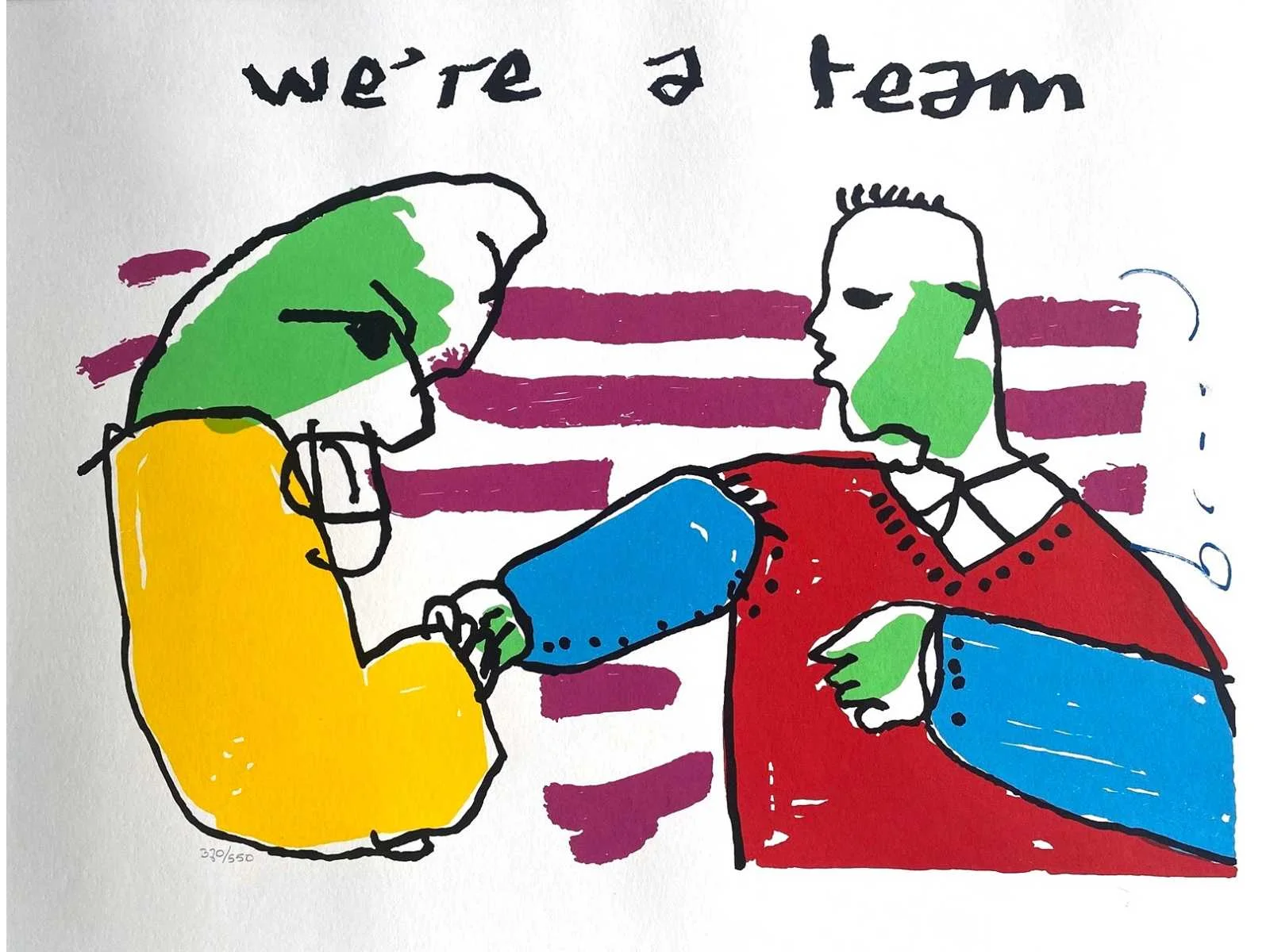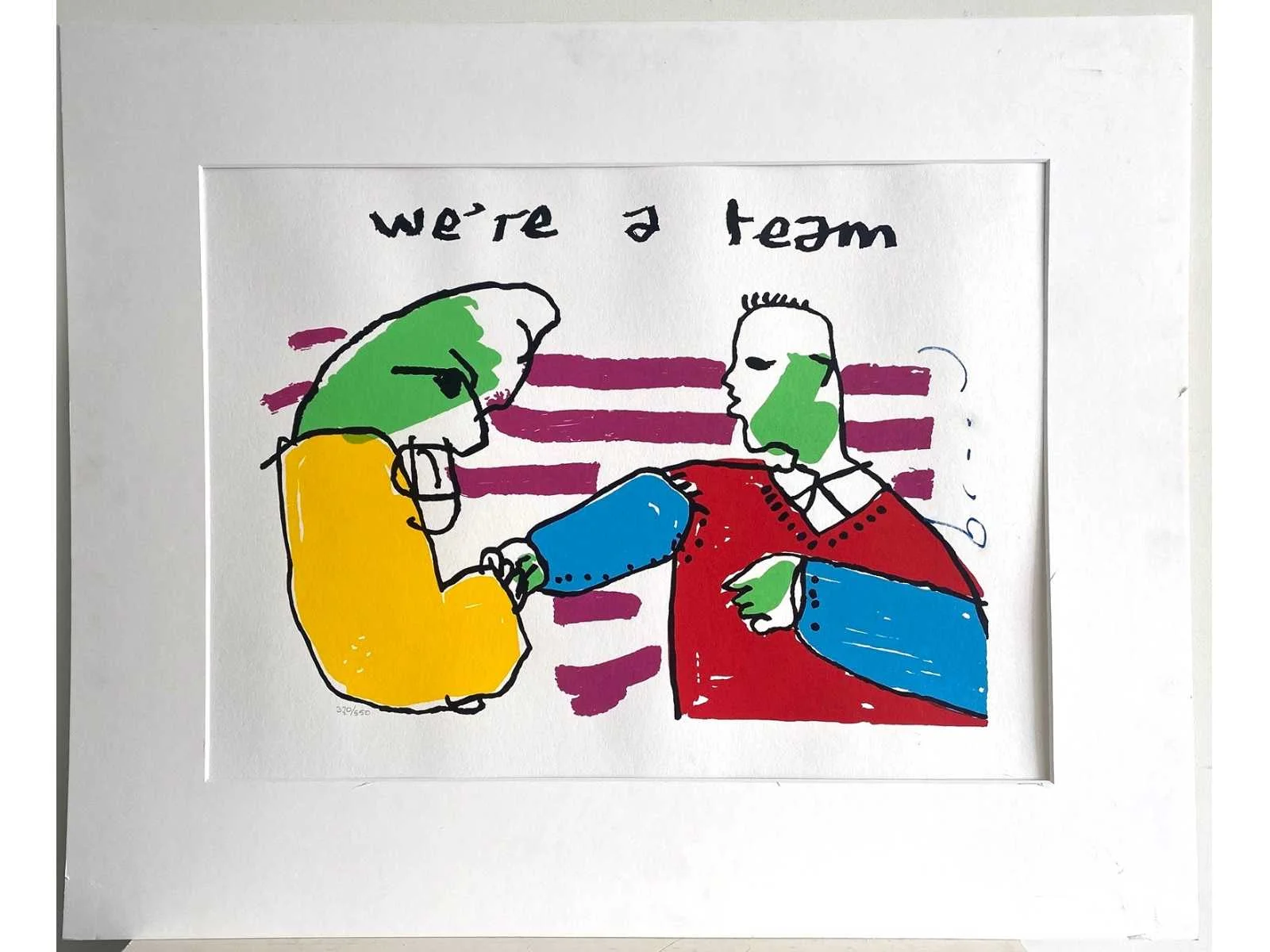 Mooie kleurenzeefdruk gemonteerd in passe-partout (passe-partout met lichte gebruikssporen) - galerieprijs: 500 euro No Kunstenaar: Herman Brood (Zwolle 1946 - 2001) Titel van werk: We're a Team Techniek: Zeefdruk Handtekening/oplage: true Oplage: 550 Gesigneerd: getekend Hoogte: 60cm Breedte: 80cm