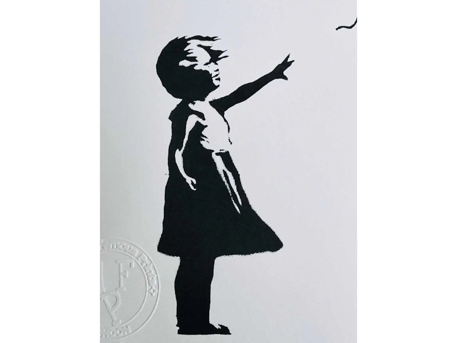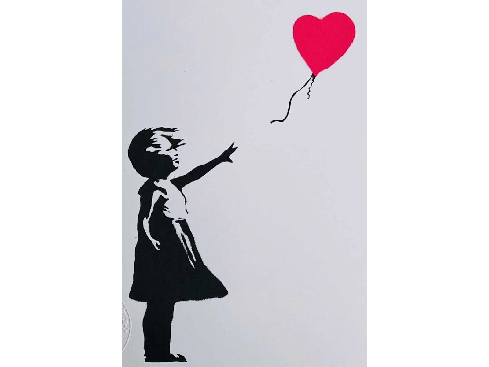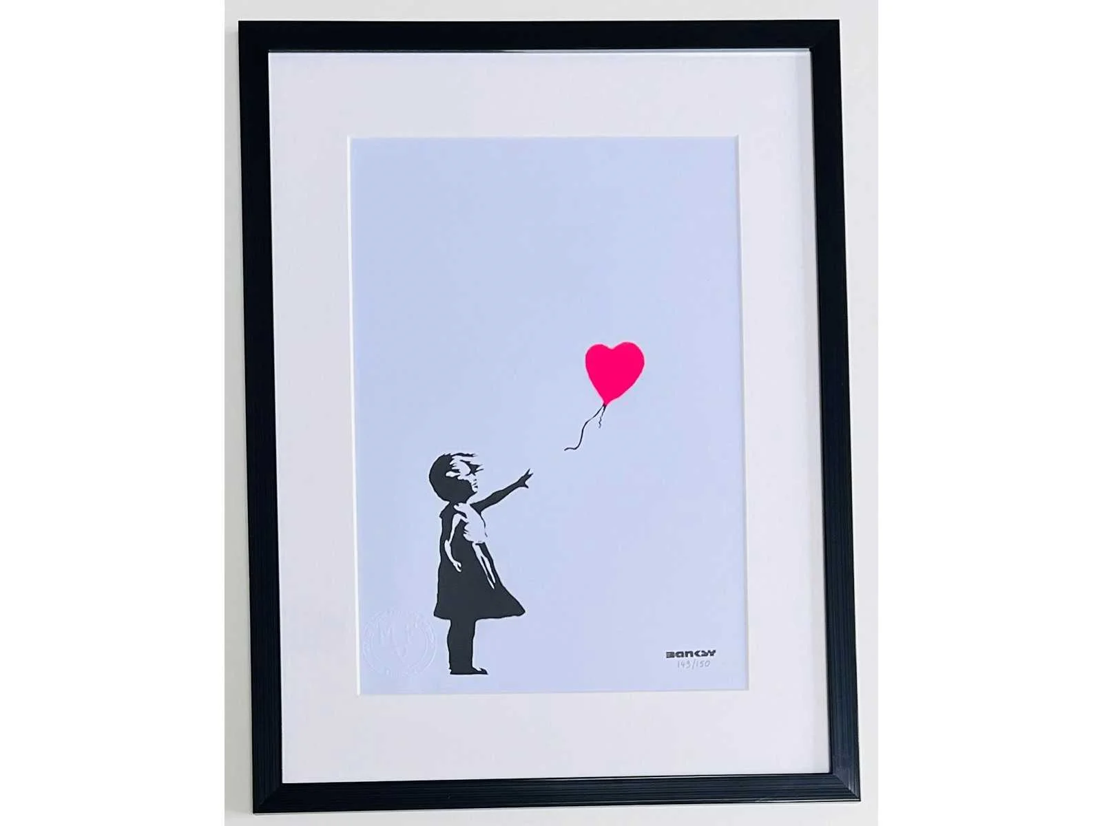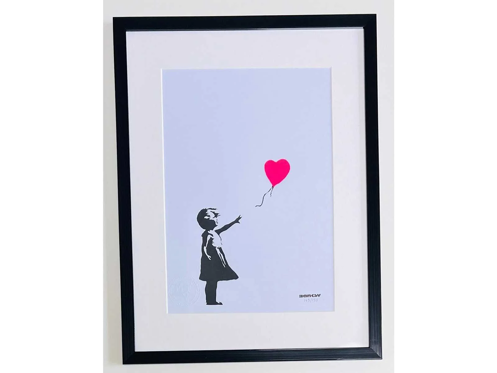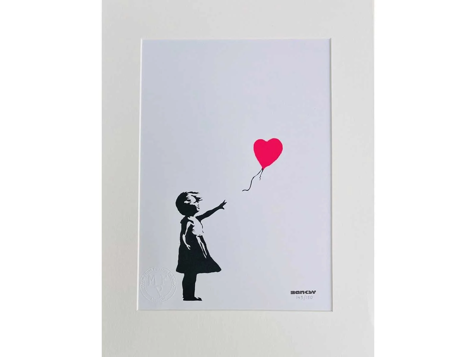Uitgegeven door MF Prints London – getekend in druk - met certificaat van de uitgever – met droogstempel - ingelijst met passe-partout No Kunstenaar: (naar) Banksy Titel van werk: girl with balloon Techniek: print Oplage: 150 Hoogte incl. lijst: 30cm Breedte incl. lijst: 21cm Frame: true