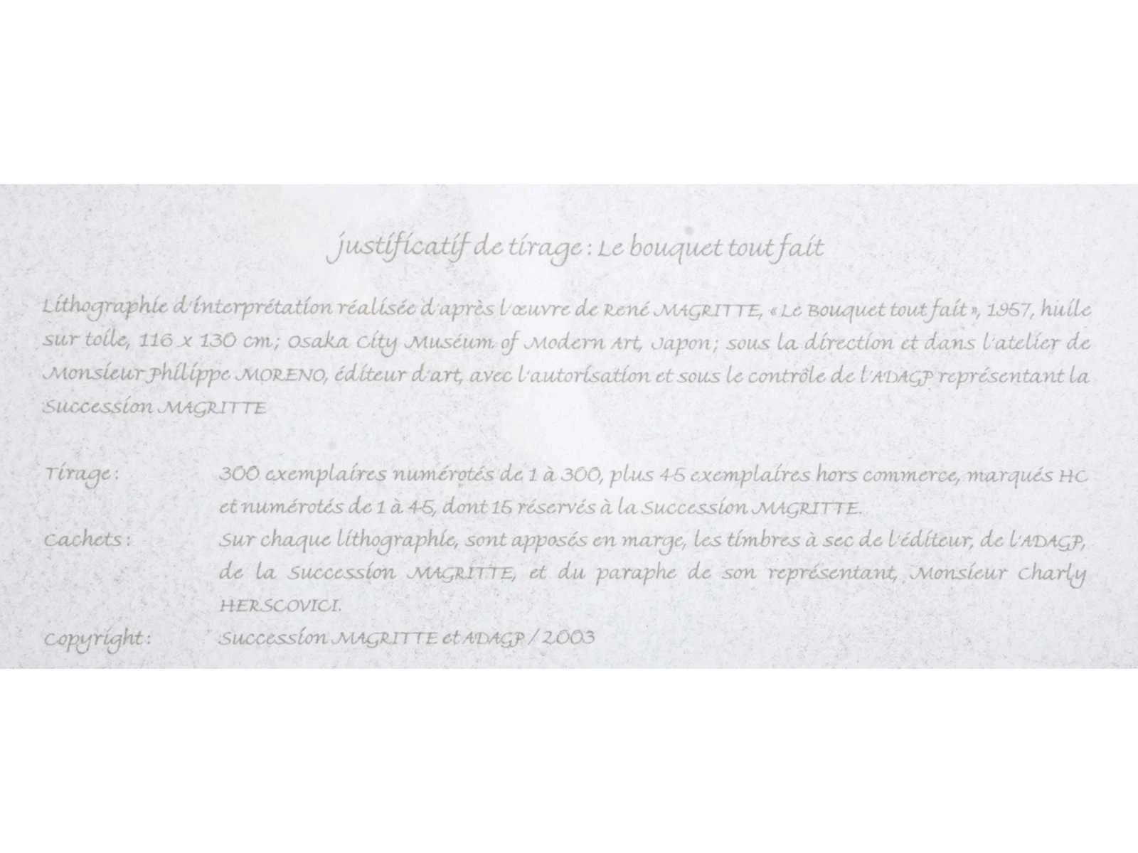 Lithografie naar het werk van René Magritte 'Le bouquet tout fait’ uit 1957 - Voorzien van de droogsptempel van ADAGP en van de Succession Magritte alsook de paraf van Charly Herscovice - Betreft het grootste uitgegeven formaat van de reeks naar Magritte Nee Kunstenaar: (naar) René Magritte (1898 - 1967) Titel van werk: Le bouquet tout fait Techniek: Lithografie Handtekening/oplage: false Oplage: 123/300 Hoogte: 77,5cm Breedte: 57,5cm Frame: true