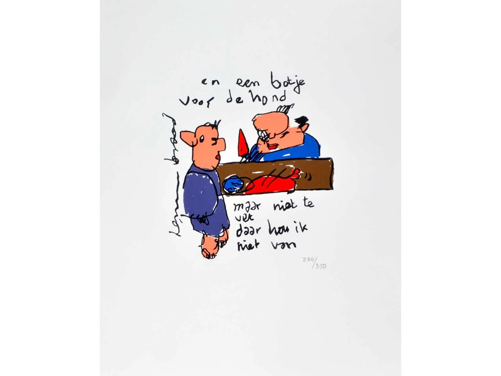 Kleurenzeefdruk - Botje voor de hond - in druk gesigneerd Nee Kunstenaar: Herman Brood (Zwolle 1946 - 2001) Titel van werk: Botje voor de hond Techniek: Zeefdruk Oplage: 350 exemplaren Hoogte: 30cm Breedte: 24cm