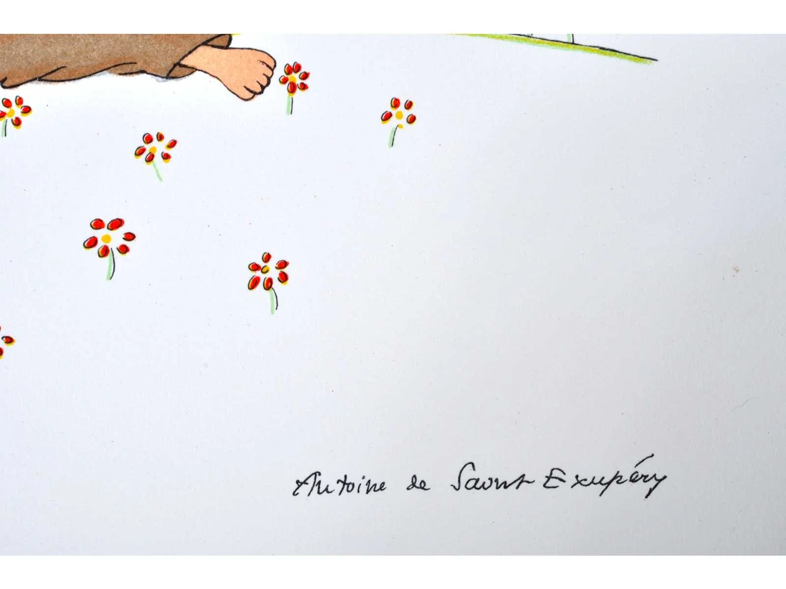 Lithografie naar de originele aquarellen , getekend in de plaat - Met achteraan ‘ Justification de tirage’ + Met stempel van de Succession Saint Exupery Nee Kunstenaar: Antoine de Saint Exupery (1900 – 1944) Titel van werk: Le petit prince Periode: 2010 Techniek: Kleurenlithografie Hoogte: 20,5cm Breedte: 30cm
