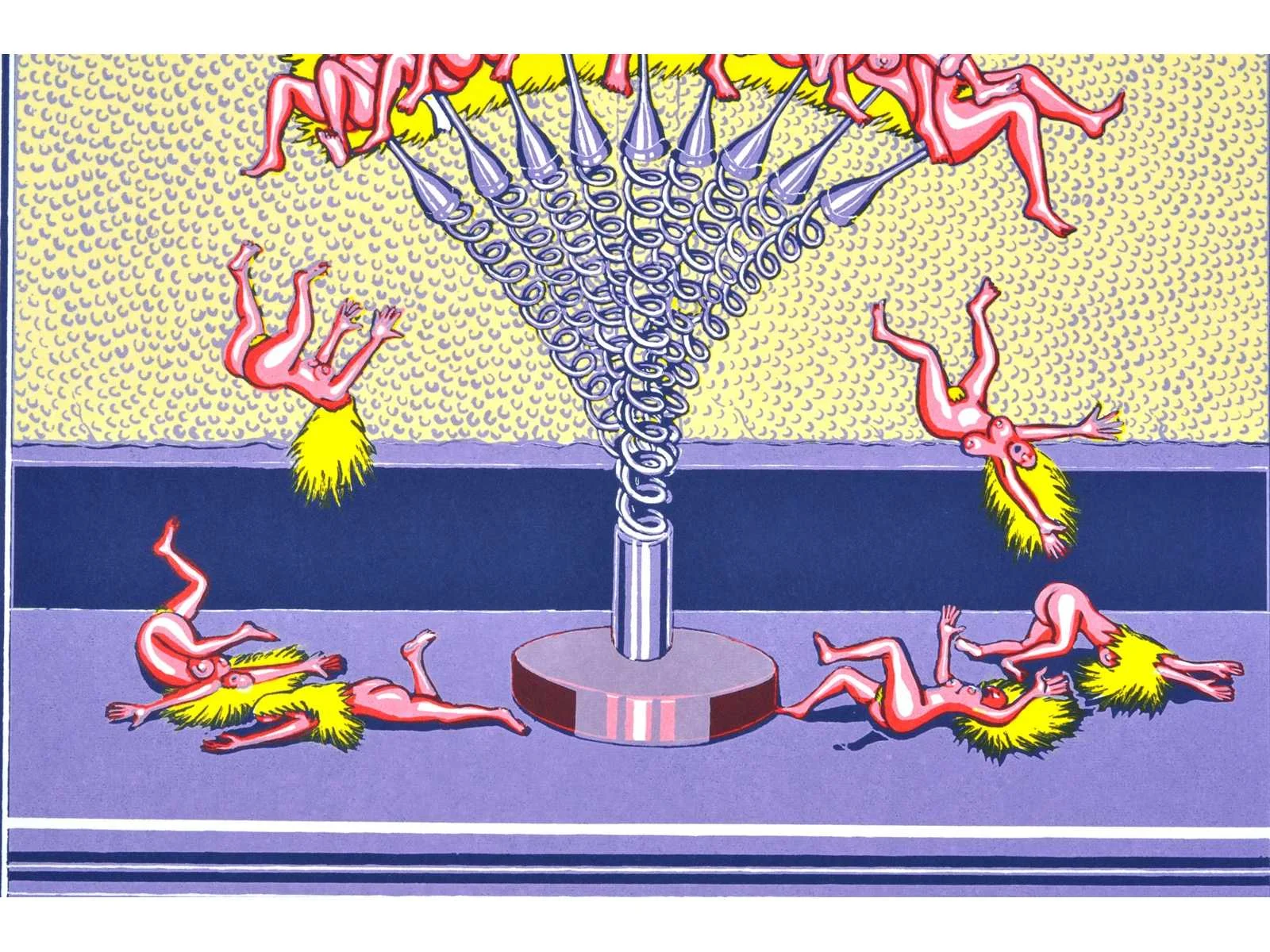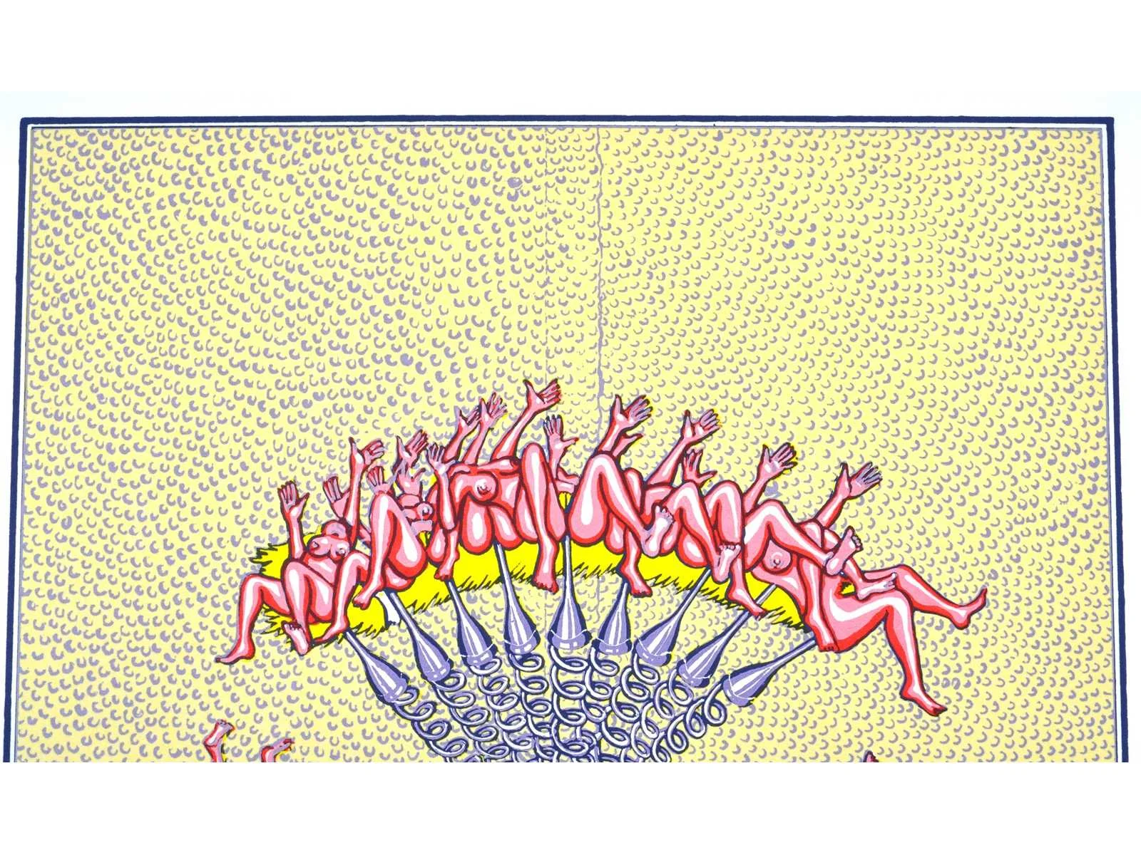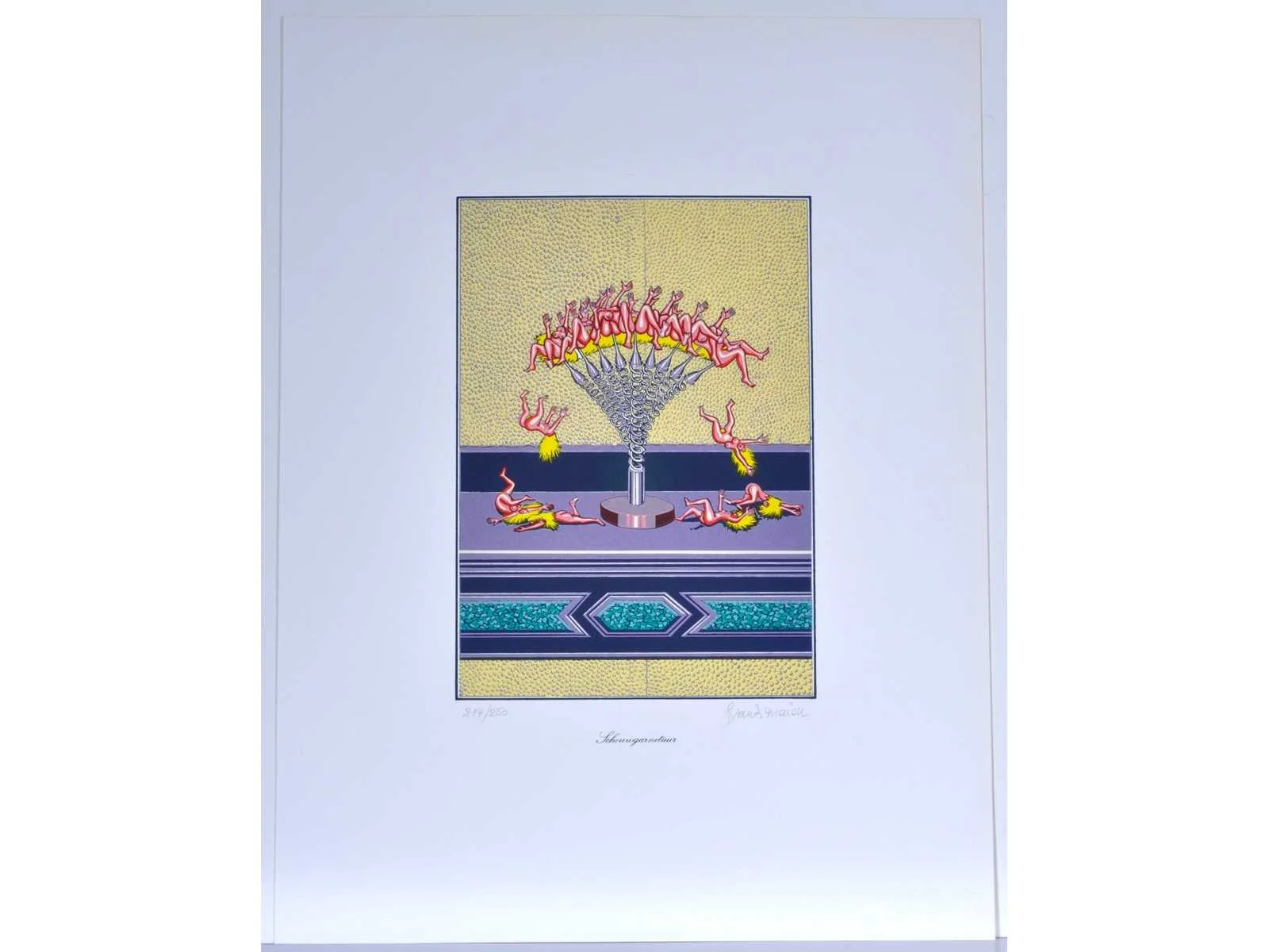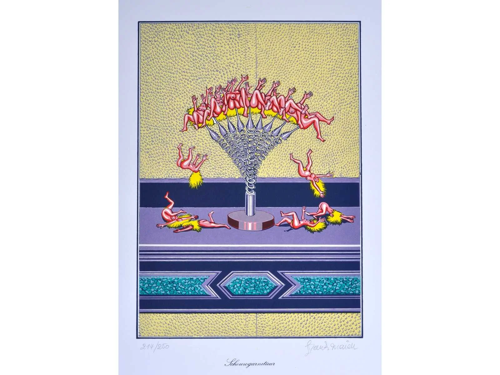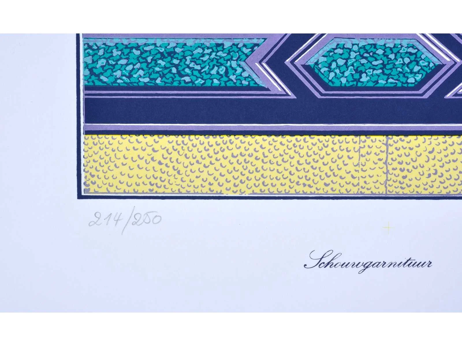 Drukatelier: Beca-Screen, Ekeren - Uitgever: Peter Bekart, Ekeren - puntgaaf exemplaar Nee Kunstenaar: Frank Maieu (Wilrijk, 1952) Titel van werk: Schouwgarnituur Materiaal: Kleurenzeefdruk Handtekening/oplage: true Oplage: 214/250 Gesigneerd: Gesigneerd en genummerd Hoogte: 55cm Breedte: 42cm