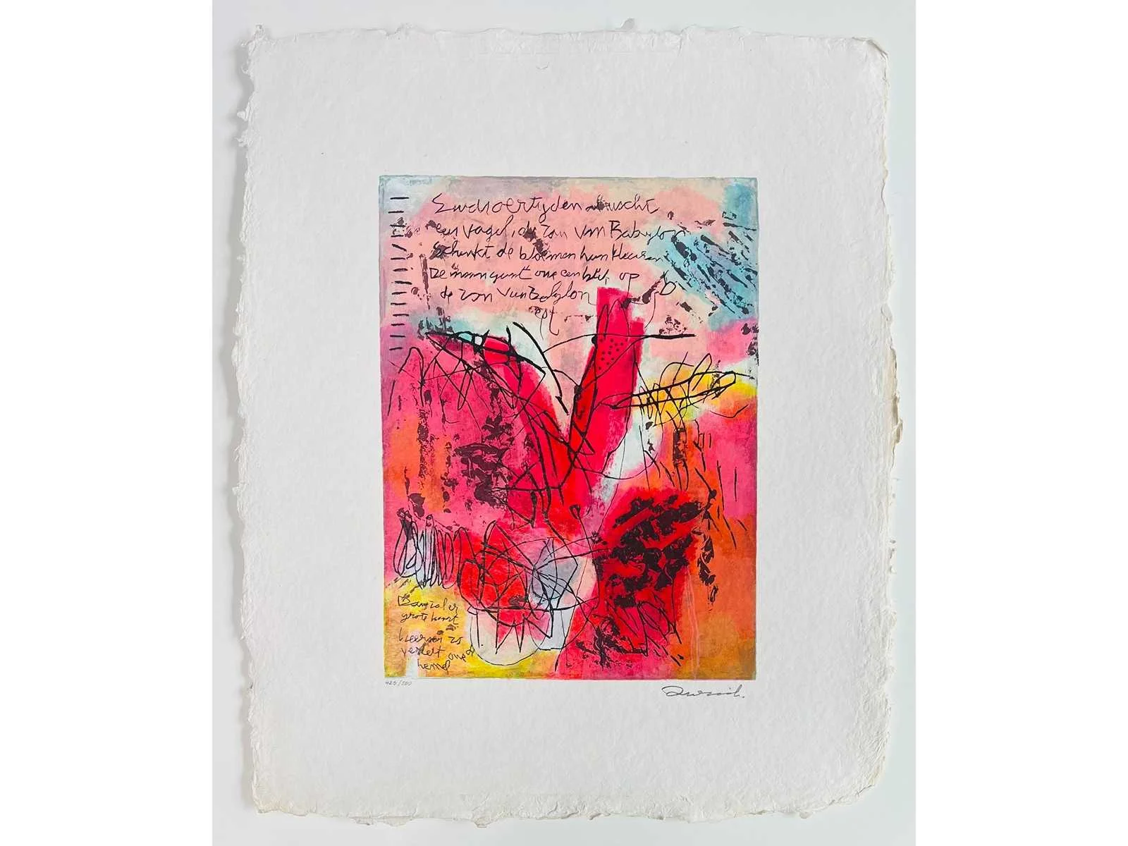 Kleurenzeefdruk op stevig handgeschept papier No Kunstenaar: Mohammed Quraish (Bagdad 1965) Techniek: kleurenzeefdruk Handtekening/oplage: true Oplage: 500 Gesigneerd: getekend Hoogte: 60cm Breedte: 50cm