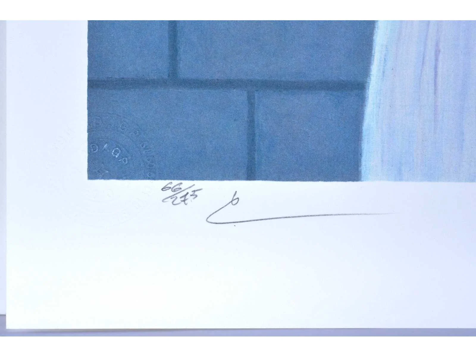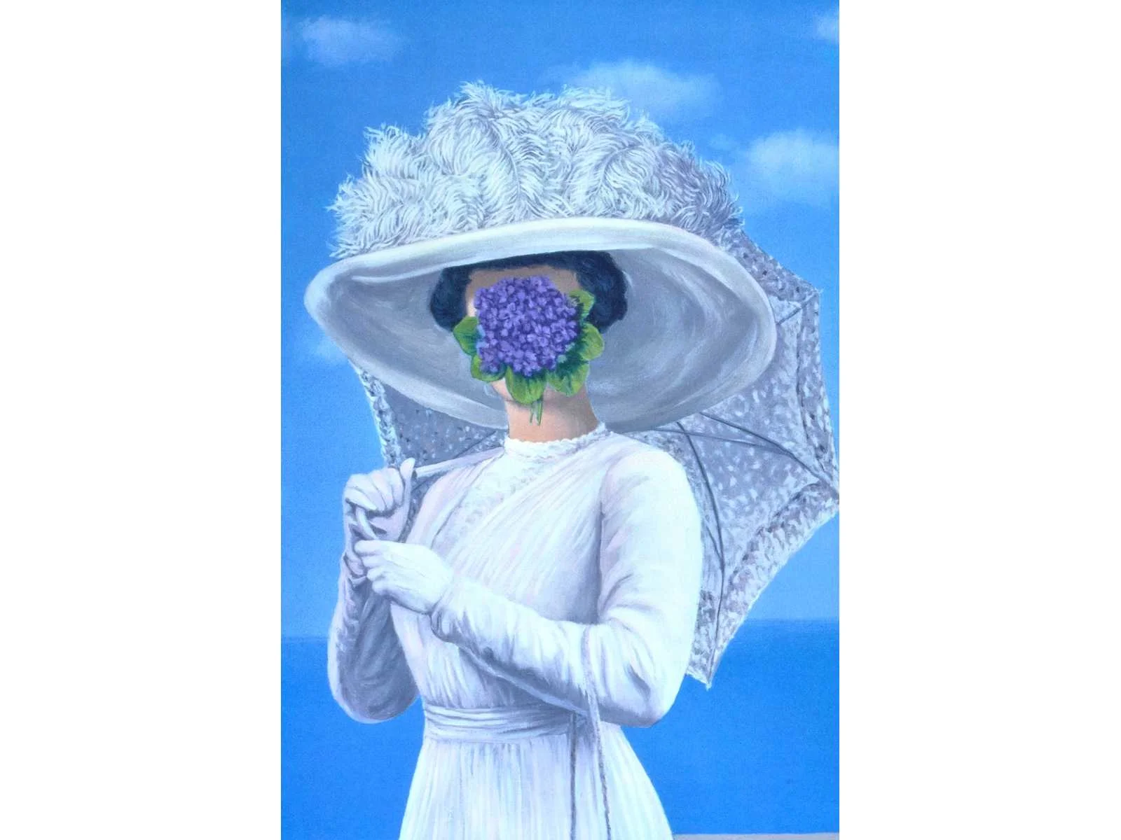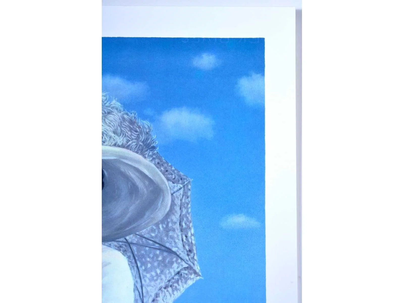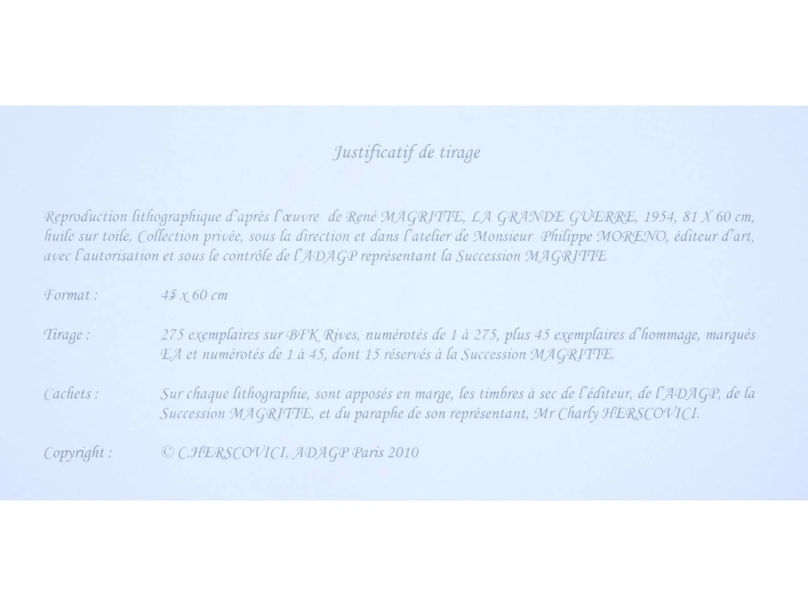 Lithografie naar werk van René Magritte, Voorzien van de droogsptempel van ADAGP en van de Succession Magritte alsook de paraf van Charly Herscovice Nee Kunstenaar: René Magritte (1898 – 1967) Titel van werk: La grande guerre (1954) Oplage: 66/275 Hoogte: 60cm Breedte: 45cm