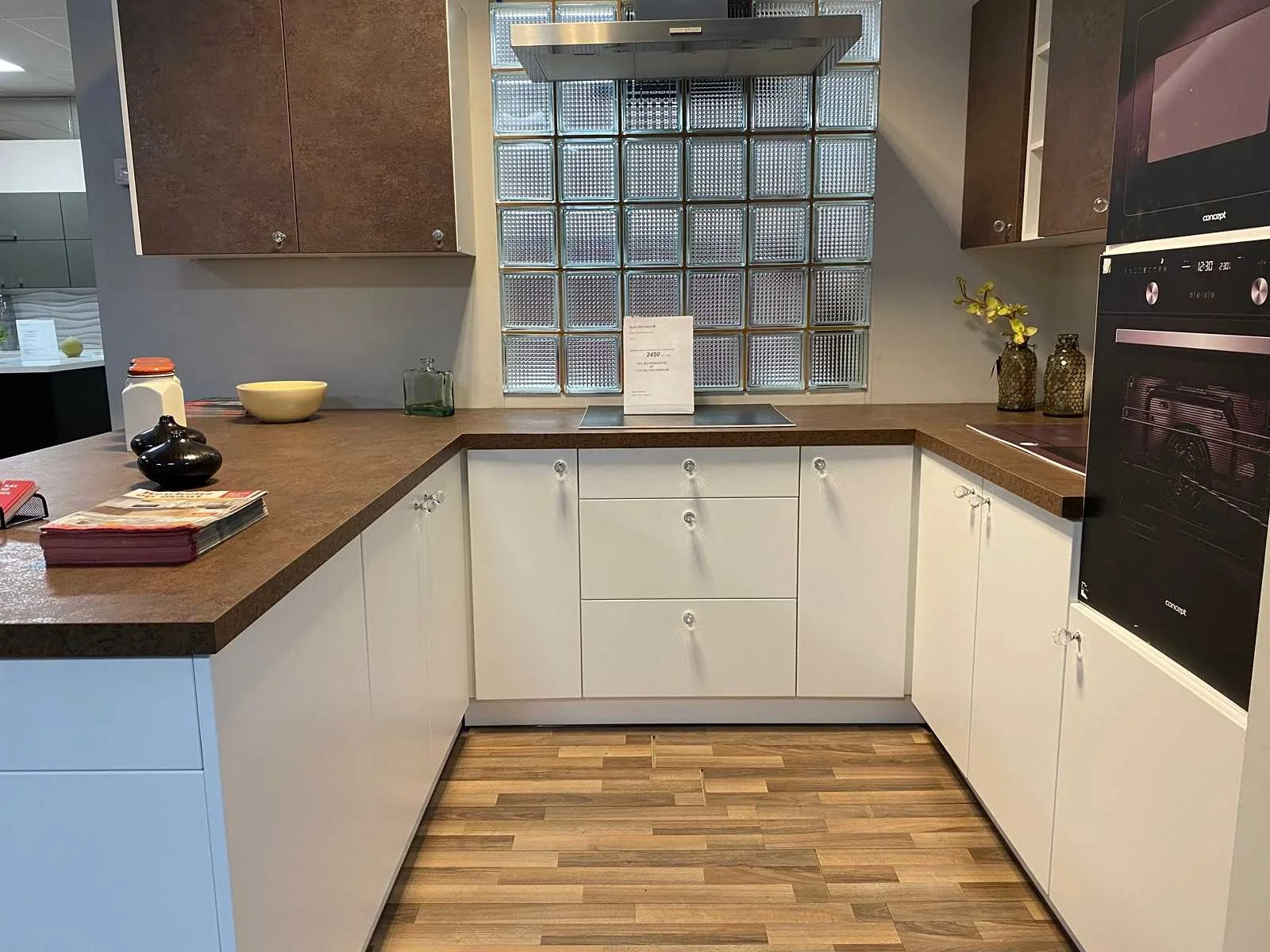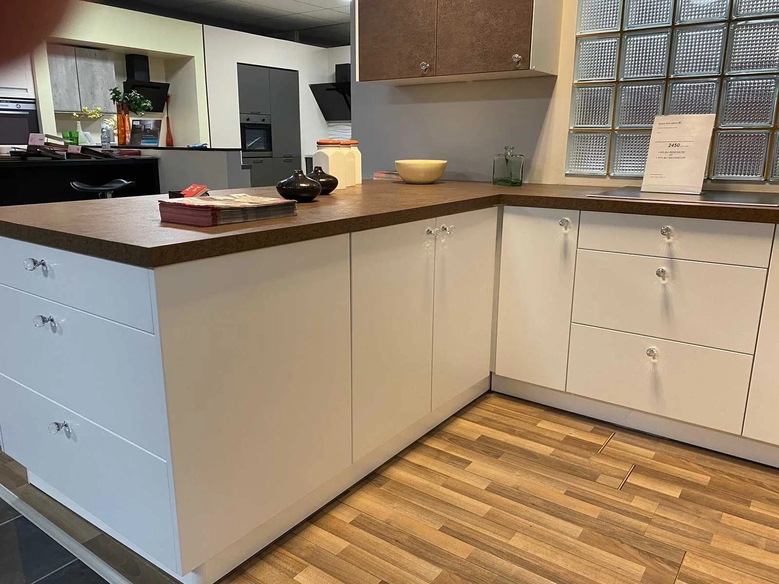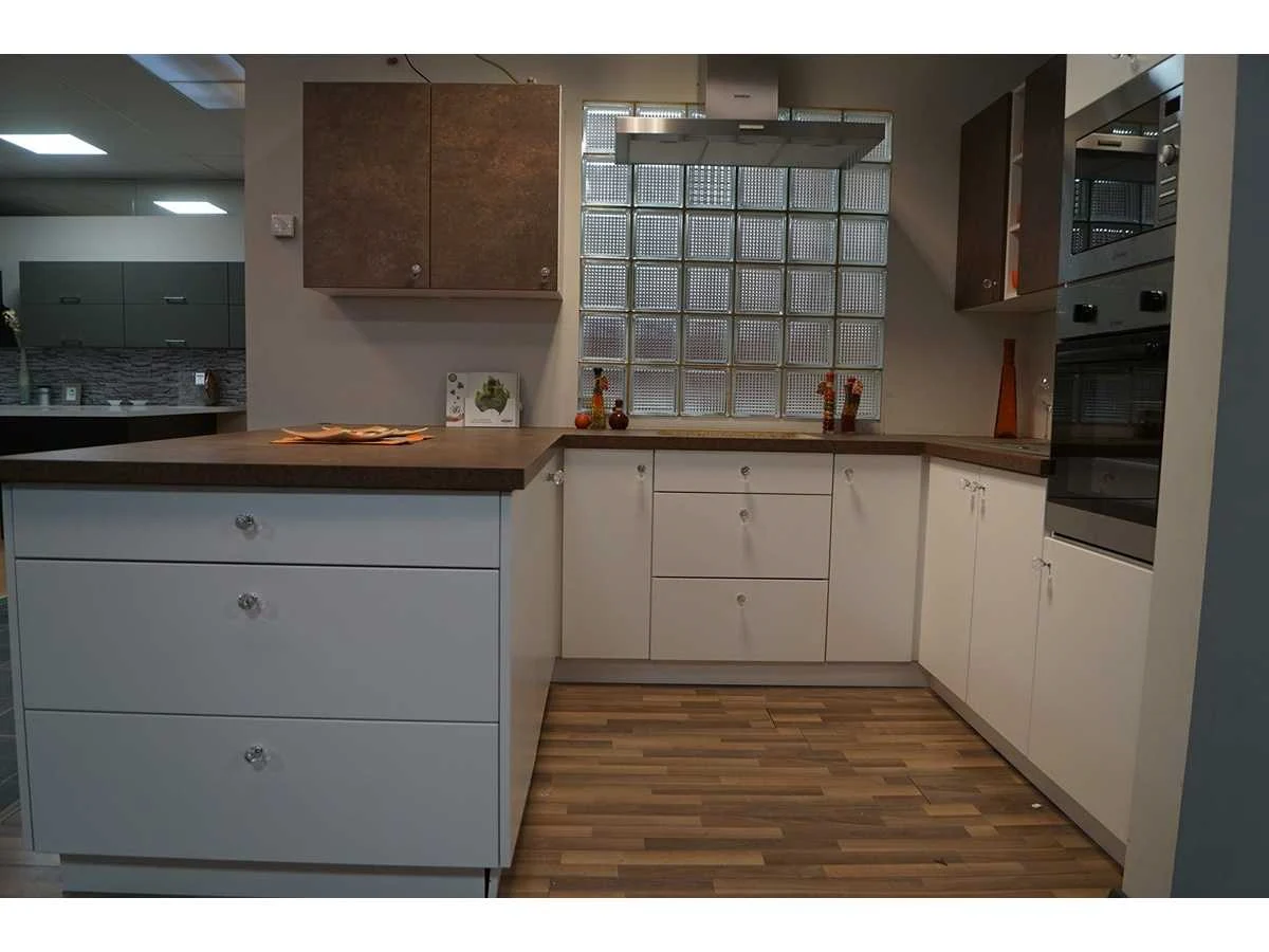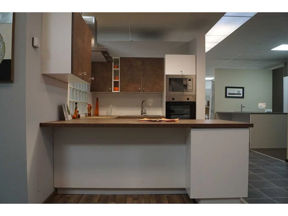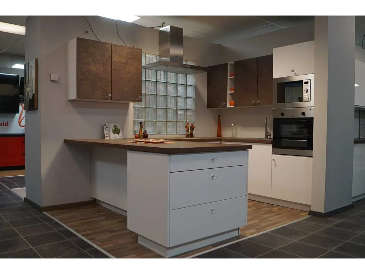 Toonzaalkeuken expo 17: Bestaande uit U-vormige kook/-werk-/eetzone, 2 hangkastjes voorzien van gemelkt glazen deuren. Voorzien van: - Formica werkblad, dikte 38 mm, - Deuren en laden in melanine, 19 mm - Soft close Totale afmetingen: - 2785 x 2140 x 2100 mm . Zonder keukentoestellen, decoratie, verlichting, barstoelen en kookgerei. Inclusief: plinten, plinthouders, verstelbare pootjes, softclose SAMET scharnieren, deurtjes 19mm, kasten 16mm, werkblad 38mm, roestvrijstaal/kunstof handvaten. Elke kast is apart dus de opstelling kan gemakkelijk aangepast worden, werkblad is niet uitgezaagd dus de koper kan zelf bepalen waar de kookplaat en spoelbak wordt geplatst. De keukens zijn eenvoudig zelf te monteren. Hier vind je links naar korte instructievideo’s: https://www.youtube.com/shorts/NmspbV-G1Lc https://www.youtube.com/watch?v=BRwDgCH20cs https://www.youtube.com/watch?v=E2Invr5EQtY Je kan de modellen bekijken tijdens de kijkdag of 24/7 in onze kleine showroom met camerabewaking: Rode Akkers 4, 2460 Kasterlee (laatste gebouw links, eerste verdieping). Nee