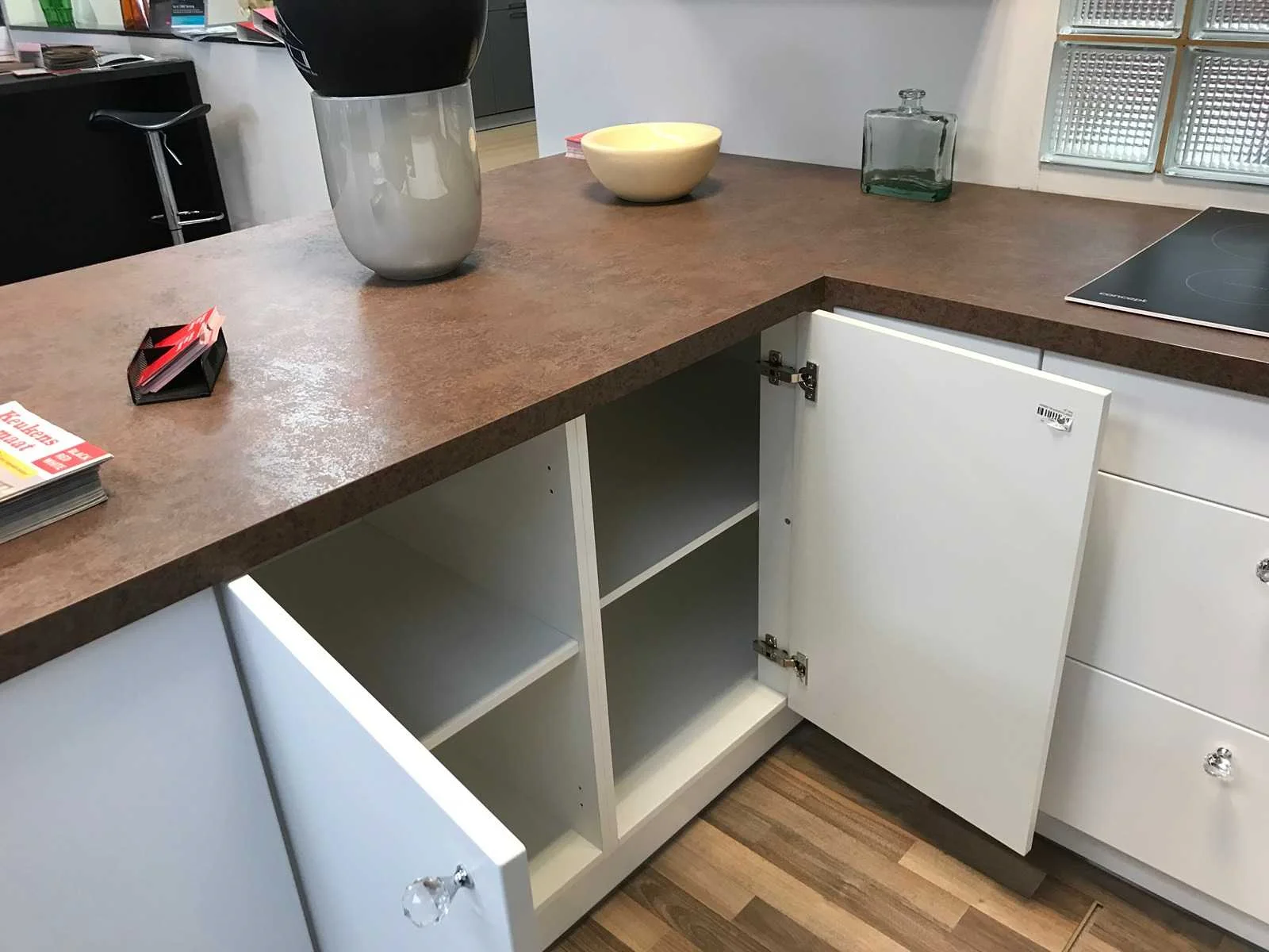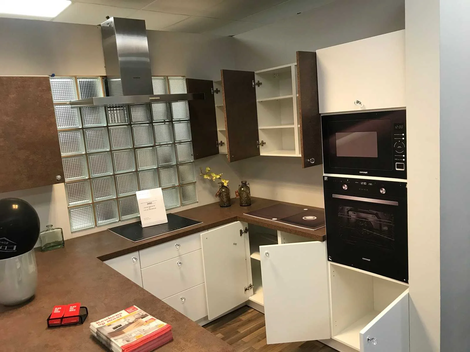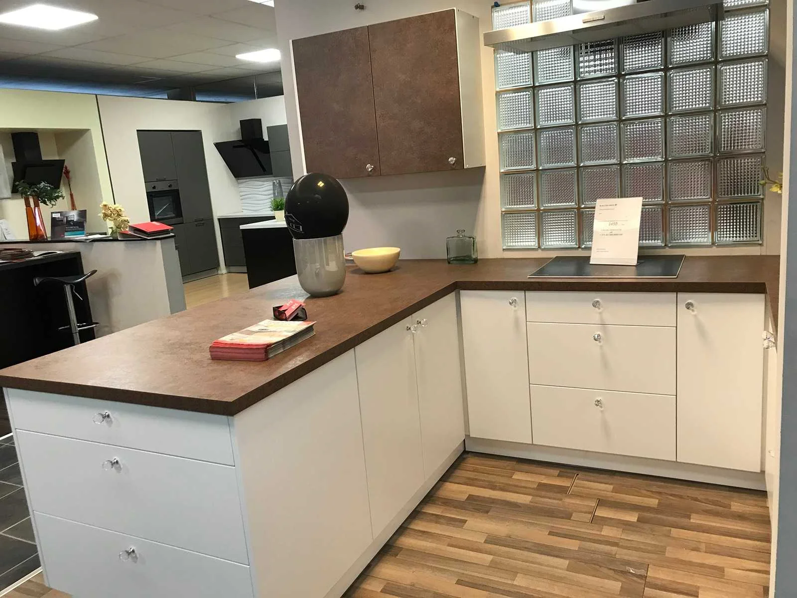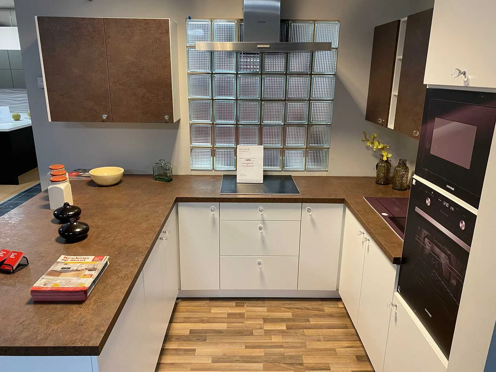 Toonzaalkeuken expo 17: Bestaande uit U-vormige kook/-werk-/eetzone, 2 hangkastjes voorzien van gemelkt glazen deuren. Voorzien van: - Formica werkblad, dikte 38 mm, - Deuren en laden in melanine, 19 mm - Soft close Totale afmetingen: - 2785 x 2140 x 2100 mm . Zonder keukentoestellen, decoratie, verlichting, barstoelen en kookgerei. Inclusief: plinten, plinthouders, verstelbare pootjes, softclose SAMET scharnieren, deurtjes 19mm, kasten 16mm, werkblad 38mm, roestvrijstaal/kunstof handvaten. Elke kast is apart dus de opstelling kan gemakkelijk aangepast worden, werkblad is niet uitgezaagd dus de koper kan zelf bepalen waar de kookplaat en spoelbak wordt geplatst. De keukens zijn eenvoudig zelf te monteren. Hier vind je links naar korte instructievideo’s: https://www.youtube.com/shorts/NmspbV-G1Lc https://www.youtube.com/watch?v=BRwDgCH20cs https://www.youtube.com/watch?v=E2Invr5EQtY Je kan de modellen bekijken tijdens de kijkdag of 24/7 in onze kleine showroom met camerabewaking: Rode Akkers 4, 2460 Kasterlee (laatste gebouw links, eerste verdieping). Nee