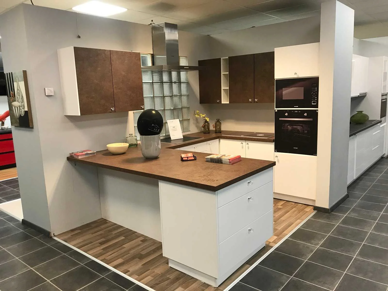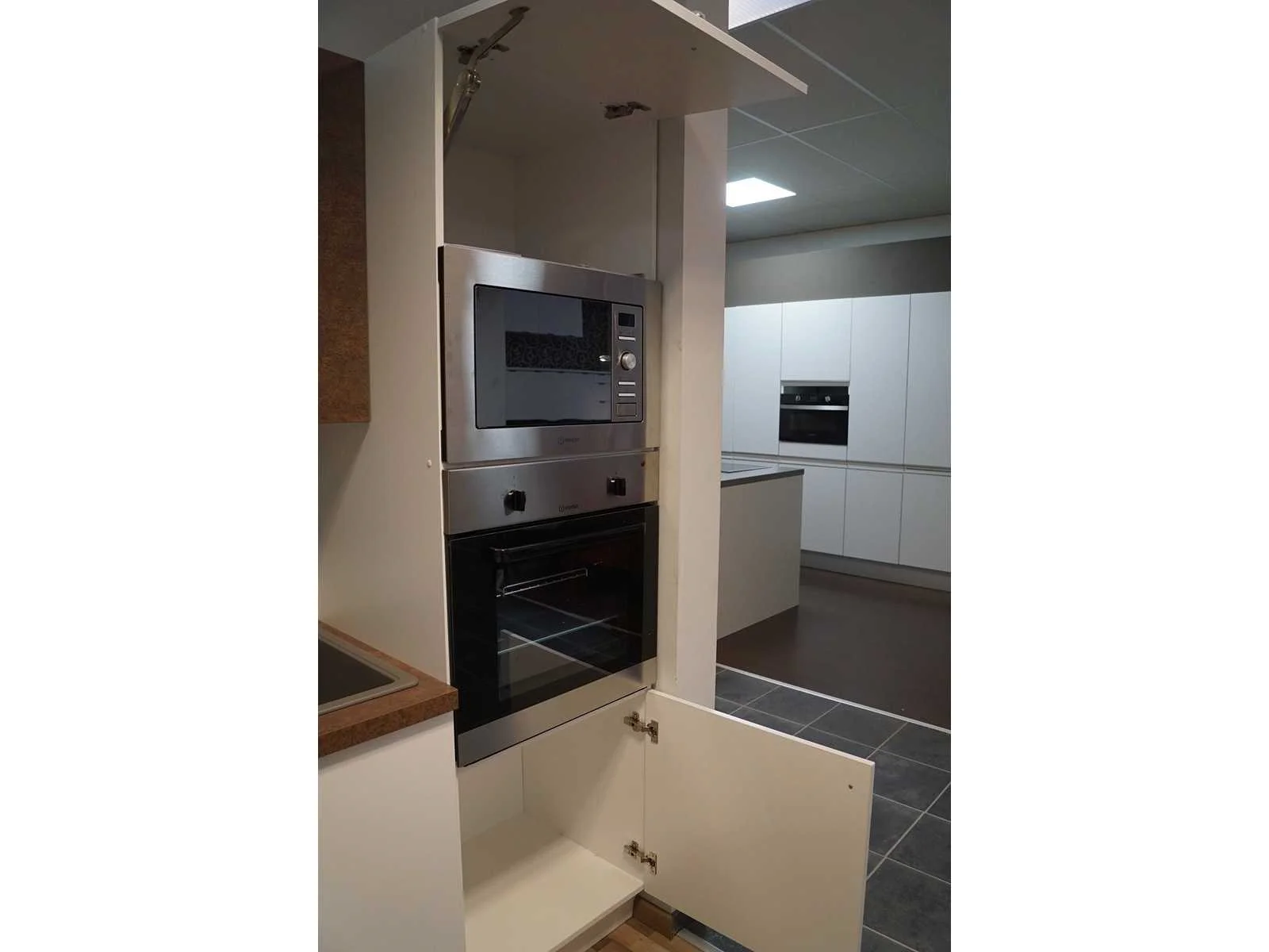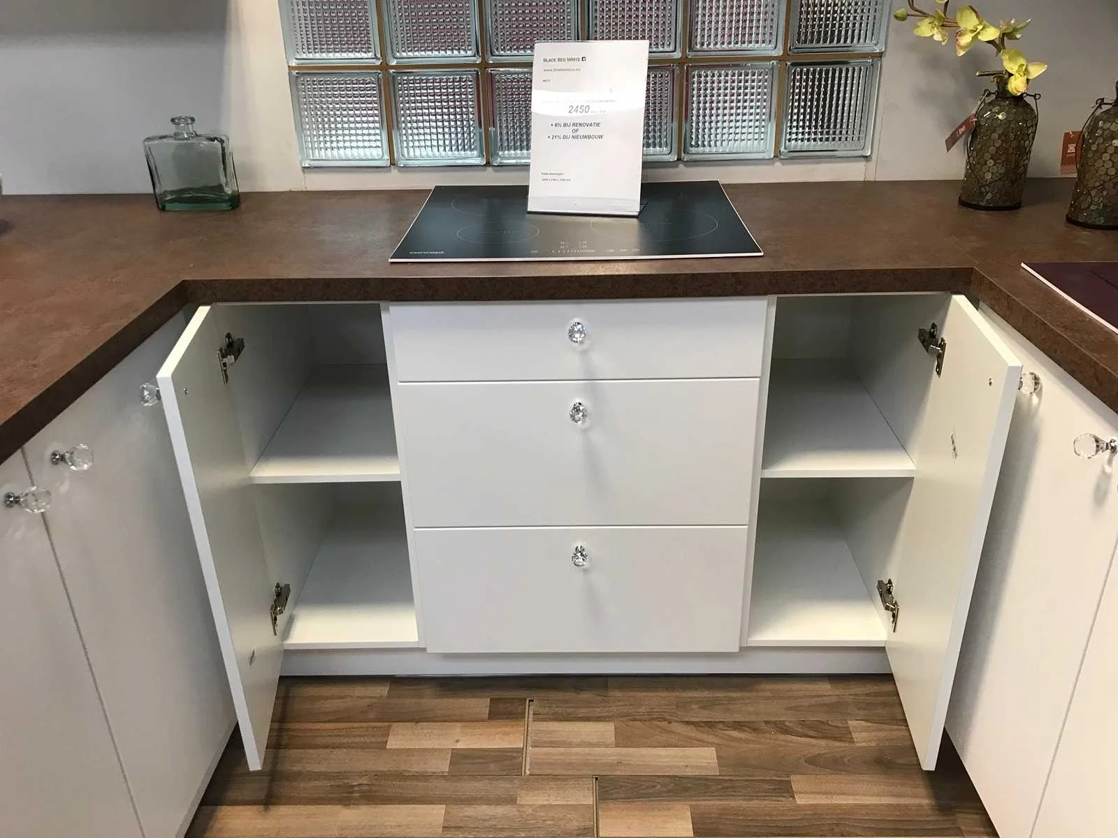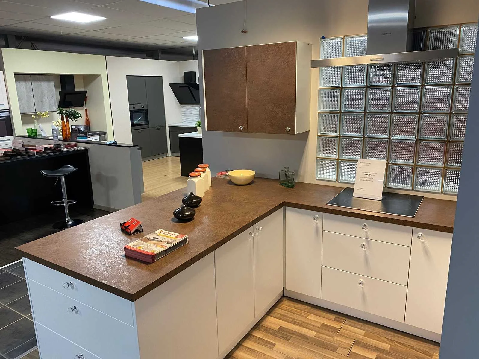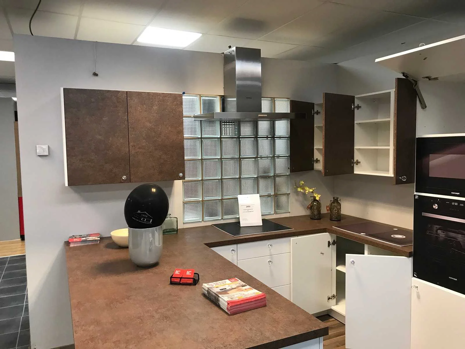 Toonzaalkeuken expo 17: Bestaande uit U-vormige kook/-werk-/eetzone, 2 hangkastjes voorzien van gemelkt glazen deuren. Voorzien van: - Formica werkblad, dikte 38 mm, - Deuren en laden in melanine, 19 mm - Soft close Totale afmetingen: - 2785 x 2140 x 2100 mm . Zonder keukentoestellen, decoratie, verlichting, barstoelen en kookgerei. Inclusief: plinten, plinthouders, verstelbare pootjes, softclose SAMET scharnieren, deurtjes 19mm, kasten 16mm, werkblad 38mm, roestvrijstaal/kunstof handvaten. Elke kast is apart dus de opstelling kan gemakkelijk aangepast worden, werkblad is niet uitgezaagd dus de koper kan zelf bepalen waar de kookplaat en spoelbak wordt geplatst. De keukens zijn eenvoudig zelf te monteren. Hier vind je links naar korte instructievideo’s: https://www.youtube.com/shorts/NmspbV-G1Lc https://www.youtube.com/watch?v=BRwDgCH20cs https://www.youtube.com/watch?v=E2Invr5EQtY Je kan de modellen bekijken tijdens de kijkdag of 24/7 in onze kleine showroom met camerabewaking: Rode Akkers 4, 2460 Kasterlee (laatste gebouw links, eerste verdieping). Nee