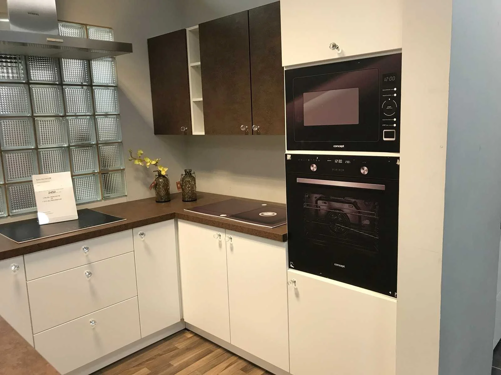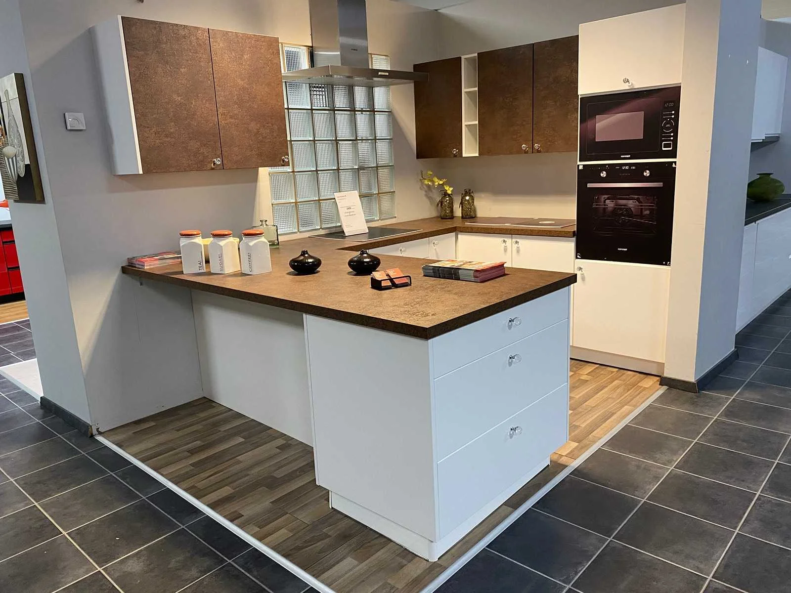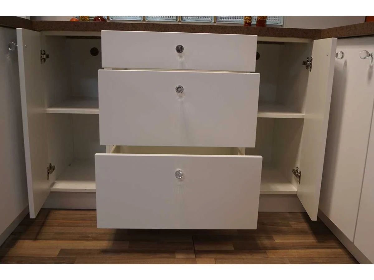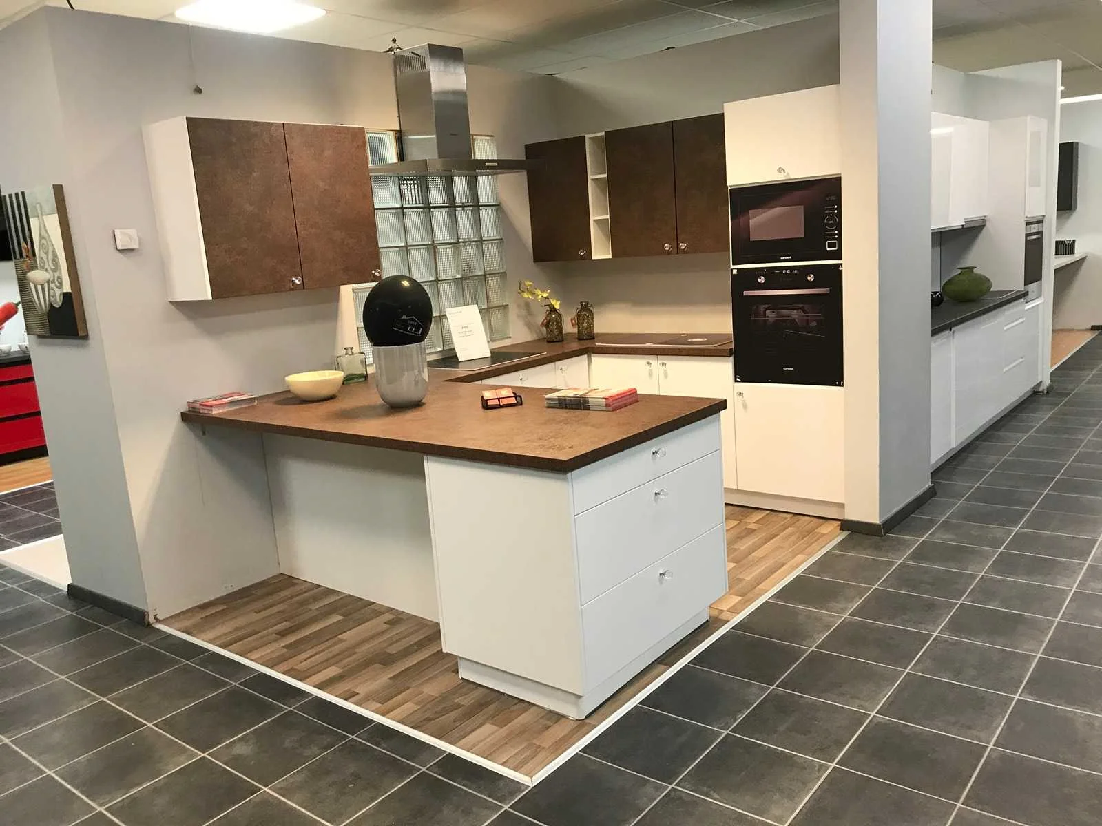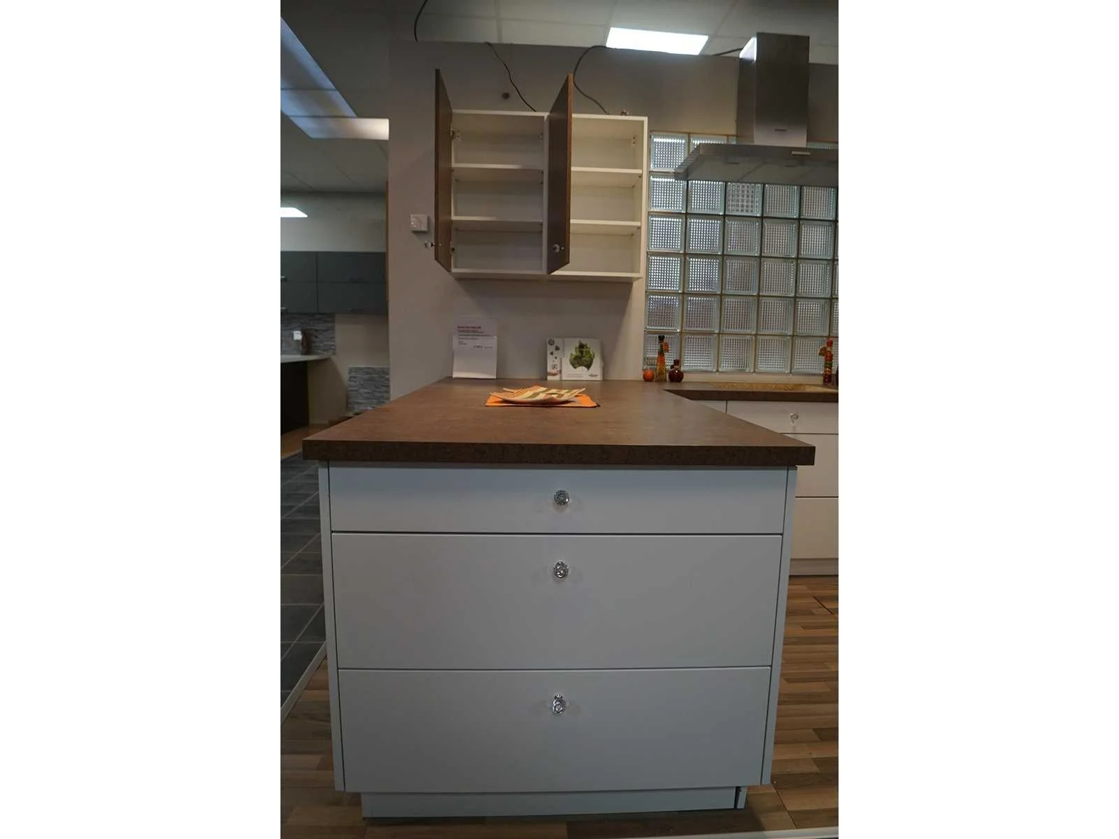 Toonzaalkeuken expo 17: Bestaande uit U-vormige kook/-werk-/eetzone, 2 hangkastjes voorzien van gemelkt glazen deuren. Voorzien van: - Formica werkblad, dikte 38 mm, - Deuren en laden in melanine, 19 mm - Soft close Totale afmetingen: - 2785 x 2140 x 2100 mm . Zonder keukentoestellen, decoratie, verlichting, barstoelen en kookgerei. Inclusief: plinten, plinthouders, verstelbare pootjes, softclose SAMET scharnieren, deurtjes 19mm, kasten 16mm, werkblad 38mm, roestvrijstaal/kunstof handvaten. Elke kast is apart dus de opstelling kan gemakkelijk aangepast worden, werkblad is niet uitgezaagd dus de koper kan zelf bepalen waar de kookplaat en spoelbak wordt geplatst. De keukens zijn eenvoudig zelf te monteren. Hier vind je links naar korte instructievideo’s: https://www.youtube.com/shorts/NmspbV-G1Lc https://www.youtube.com/watch?v=BRwDgCH20cs https://www.youtube.com/watch?v=E2Invr5EQtY Je kan de modellen bekijken tijdens de kijkdag of 24/7 in onze kleine showroom met camerabewaking: Rode Akkers 4, 2460 Kasterlee (laatste gebouw links, eerste verdieping). Nee