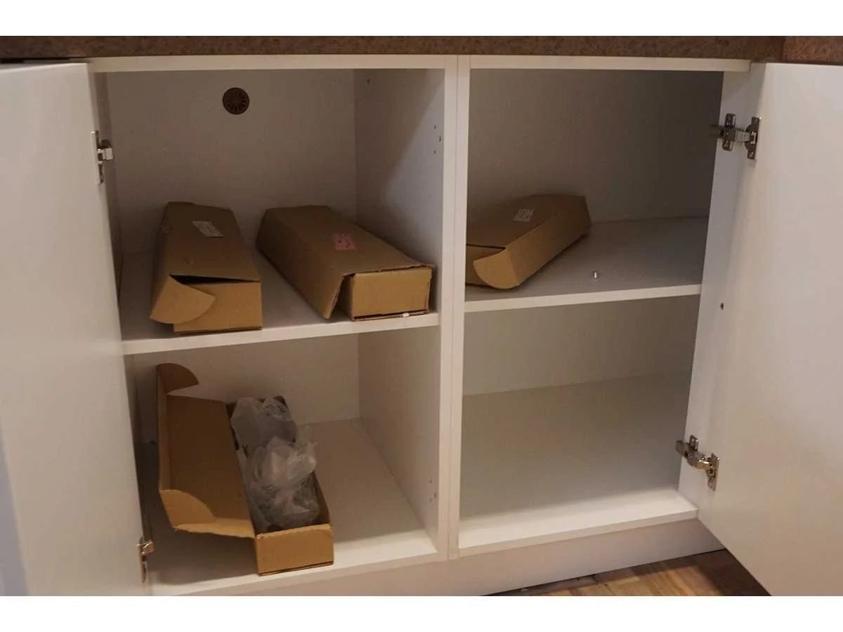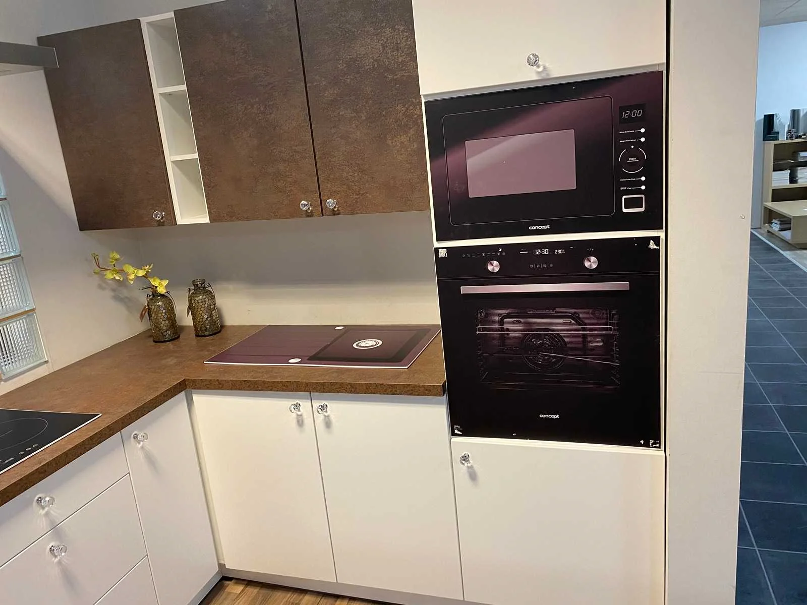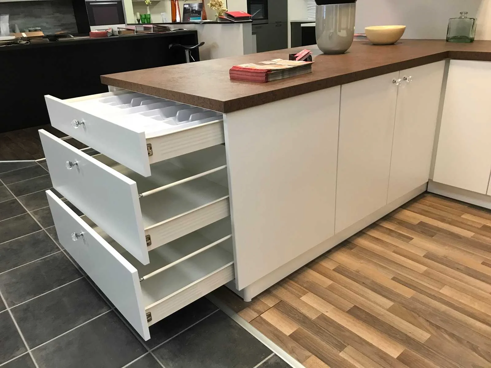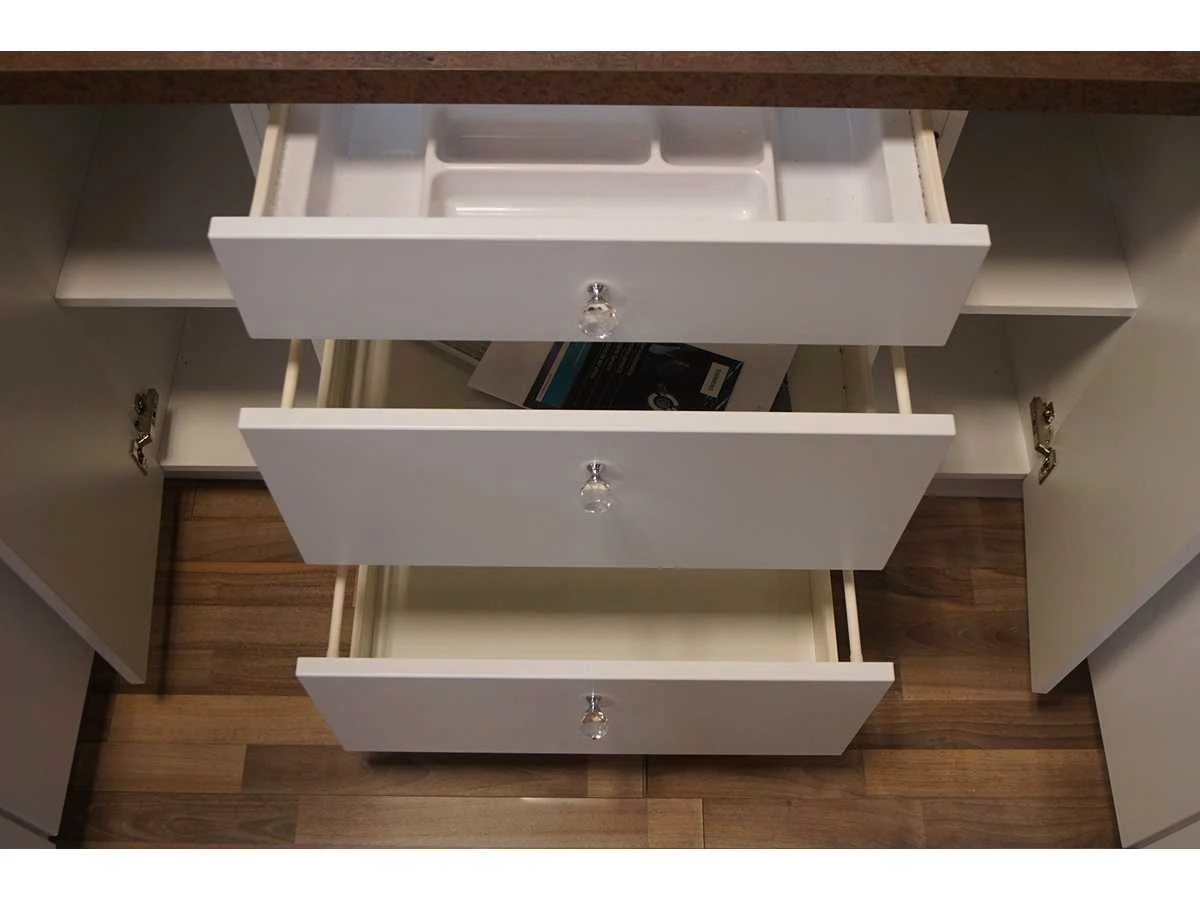 Toonzaalkeuken expo 17: Bestaande uit U-vormige kook/-werk-/eetzone, 2 hangkastjes voorzien van gemelkt glazen deuren. Voorzien van: - Formica werkblad, dikte 38 mm, - Deuren en laden in melanine, 19 mm - Soft close Totale afmetingen: - 2785 x 2140 x 2100 mm . Zonder keukentoestellen, decoratie, verlichting, barstoelen en kookgerei. Inclusief: plinten, plinthouders, verstelbare pootjes, softclose SAMET scharnieren, deurtjes 19mm, kasten 16mm, werkblad 38mm, roestvrijstaal/kunstof handvaten. Elke kast is apart dus de opstelling kan gemakkelijk aangepast worden, werkblad is niet uitgezaagd dus de koper kan zelf bepalen waar de kookplaat en spoelbak wordt geplatst. De keukens zijn eenvoudig zelf te monteren. Hier vind je links naar korte instructievideo’s: https://www.youtube.com/shorts/NmspbV-G1Lc https://www.youtube.com/watch?v=BRwDgCH20cs https://www.youtube.com/watch?v=E2Invr5EQtY Je kan de modellen bekijken tijdens de kijkdag of 24/7 in onze kleine showroom met camerabewaking: Rode Akkers 4, 2460 Kasterlee (laatste gebouw links, eerste verdieping). Nee
