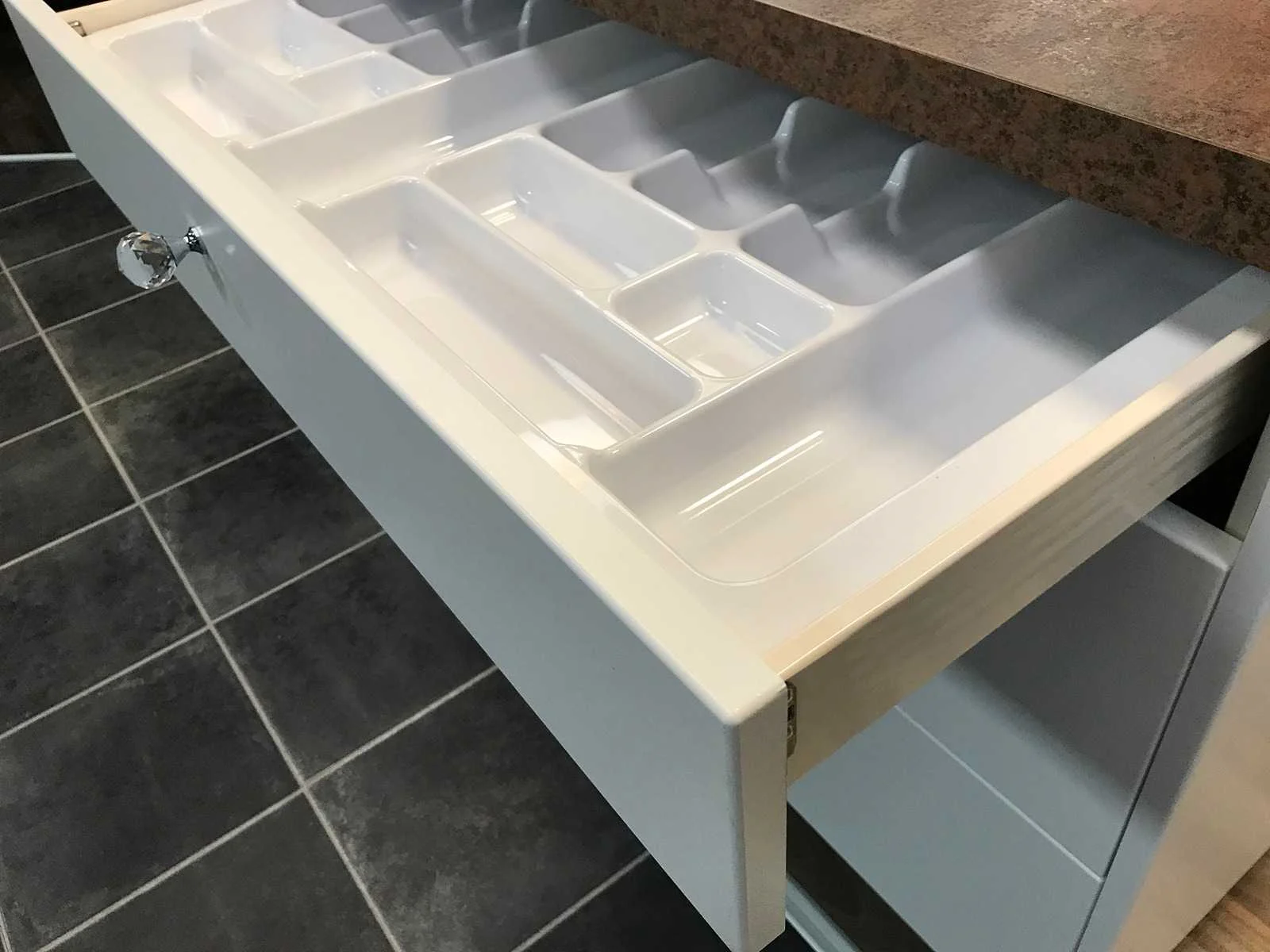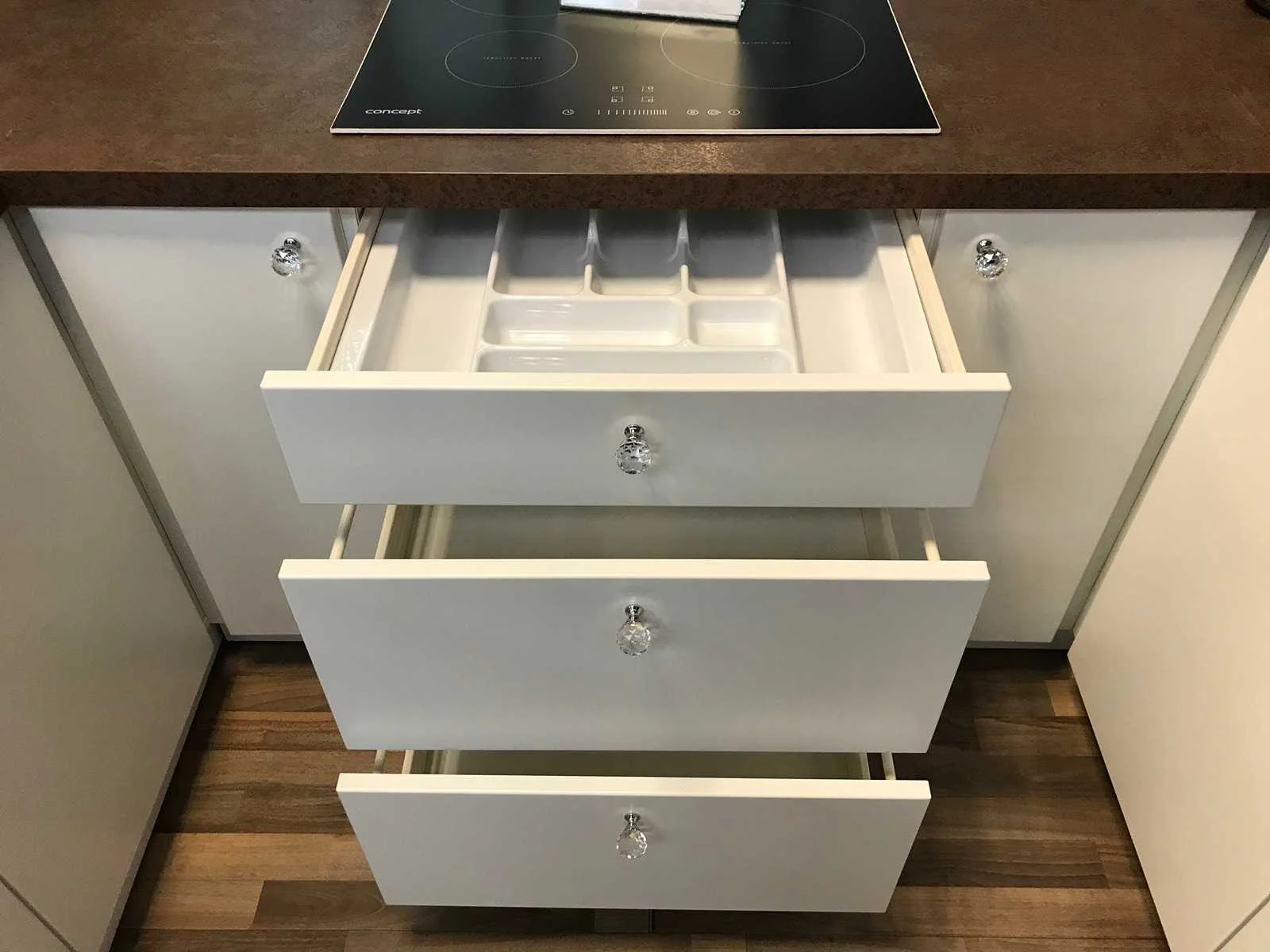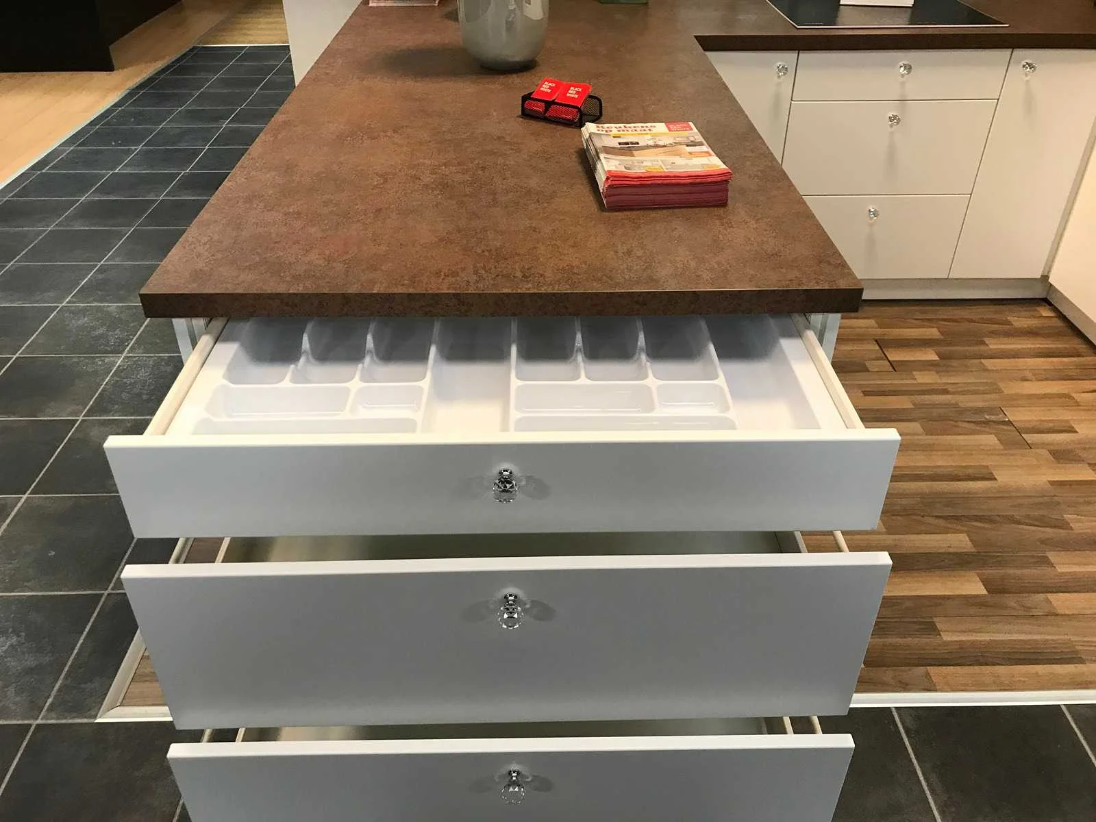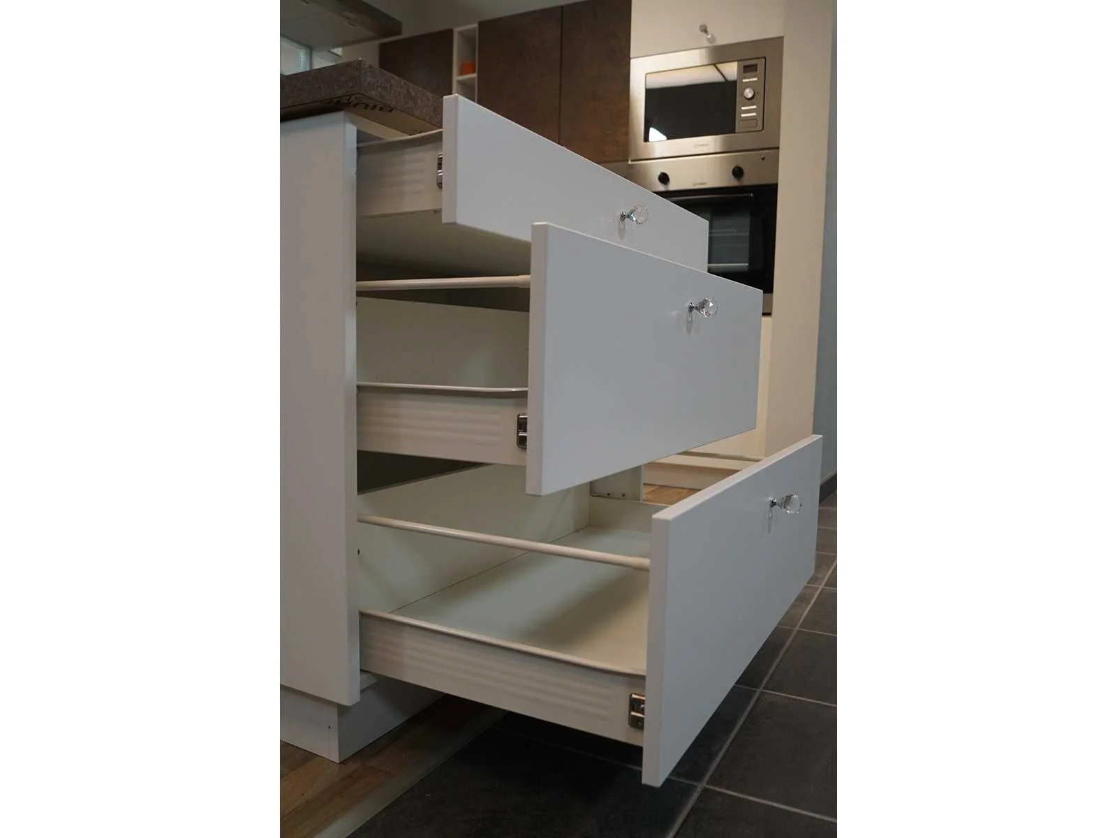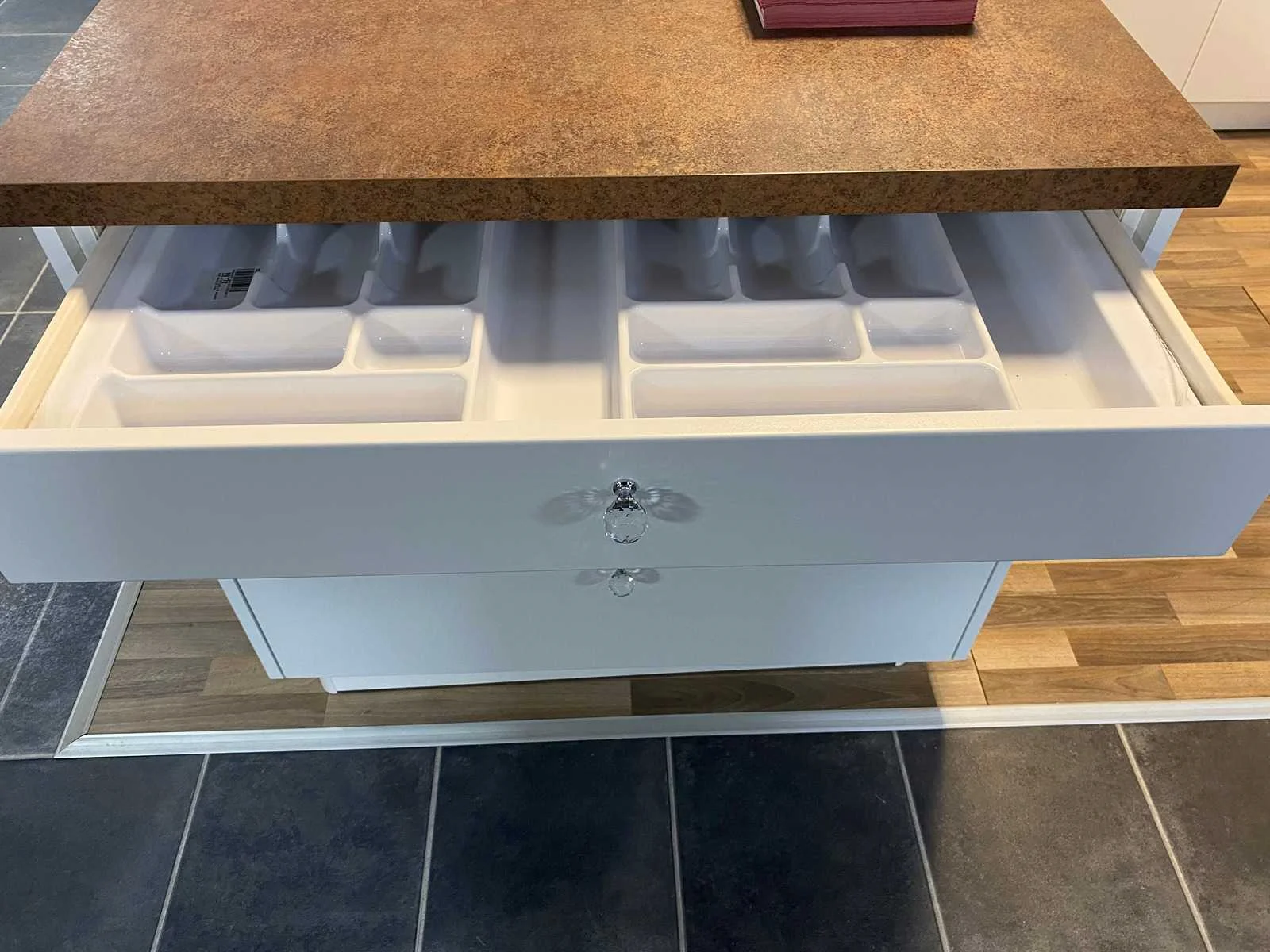Toonzaalkeuken expo 17: Bestaande uit U-vormige kook/-werk-/eetzone, 2 hangkastjes voorzien van gemelkt glazen deuren. Voorzien van: - Formica werkblad, dikte 38 mm, - Deuren en laden in melanine, 19 mm - Soft close Totale afmetingen: - 2785 x 2140 x 2100 mm . Zonder keukentoestellen, decoratie, verlichting, barstoelen en kookgerei. Inclusief: plinten, plinthouders, verstelbare pootjes, softclose SAMET scharnieren, deurtjes 19mm, kasten 16mm, werkblad 38mm, roestvrijstaal/kunstof handvaten. Elke kast is apart dus de opstelling kan gemakkelijk aangepast worden, werkblad is niet uitgezaagd dus de koper kan zelf bepalen waar de kookplaat en spoelbak wordt geplatst. De keukens zijn eenvoudig zelf te monteren. Hier vind je links naar korte instructievideo’s: https://www.youtube.com/shorts/NmspbV-G1Lc https://www.youtube.com/watch?v=BRwDgCH20cs https://www.youtube.com/watch?v=E2Invr5EQtY Je kan de modellen bekijken tijdens de kijkdag of 24/7 in onze kleine showroom met camerabewaking: Rode Akkers 4, 2460 Kasterlee (laatste gebouw links, eerste verdieping). Nee