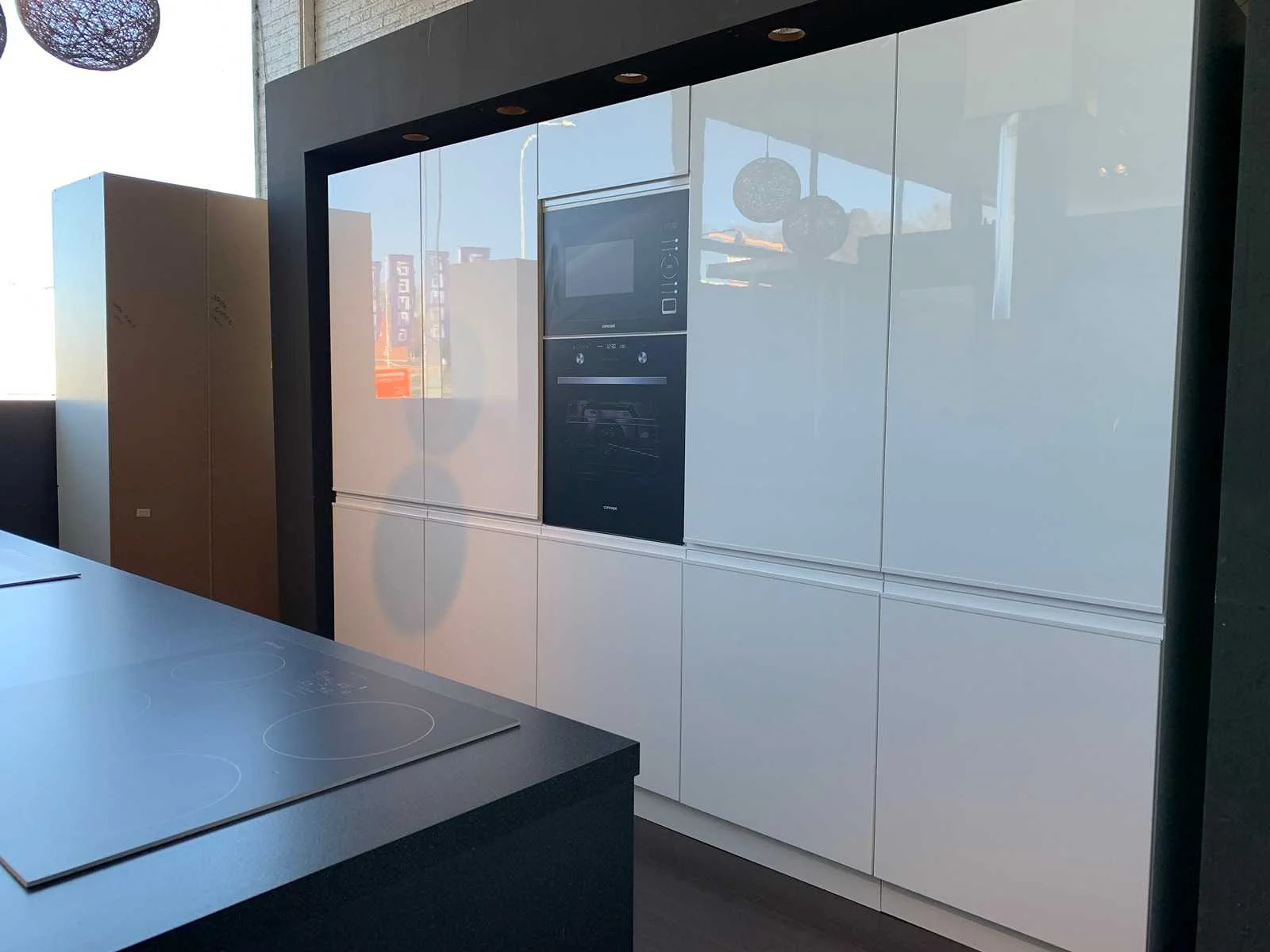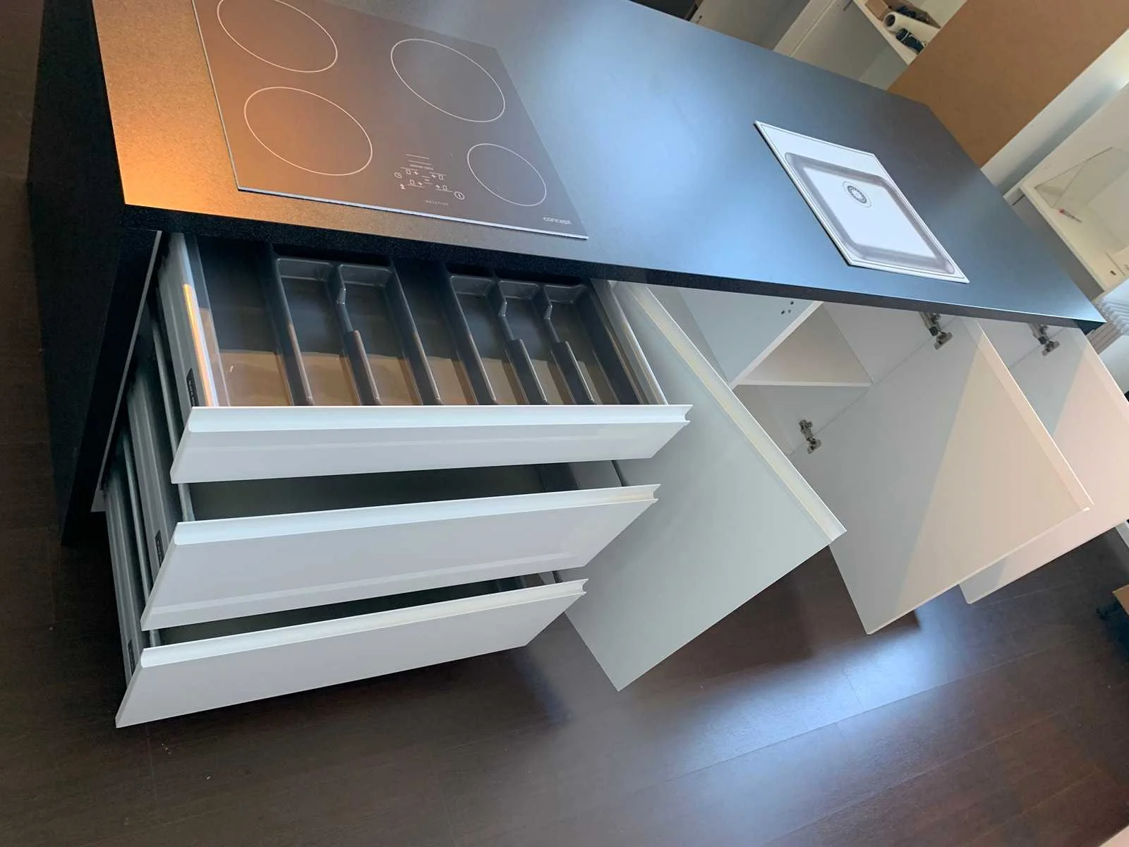 Toonzaalkeuken expo 42 sole white IN BOUWPAKKET: Bestaande uit kook-/werkeiland, ingemaakte kast. Voorzien van: - Formica werkblad, dikte 38 mm, - Deuren en laden in MDF met afgerond laminaat 19mm, - Soft close sluitingen, Totale afmetingen: - Eiland: 1000 x 2648 mm, - Inbouwkast: 3000 x H 2066 mm, Zonder keukentoestellen, decoratie, verlichting, barstoelen en kookgerei. Inclusief: plinten, plinthouders, verstelbare pootjes, softclose SAMET scharnieren, deurtjes 19mm, kasten 16mm, werkblad 38mm, roestvrijstaal handvaten. Elke kast is apart dus de opstelling kan gemakkelijk aangepast worden, werkblad is niet uitgezaagd dus de koper kan zelf bepalen waar de kookplaat en spoelbak wordt geplatst. De keukens zijn eenvoudig zelf te monteren. Hier vind je links naar korte instructievideo’s: https://www.youtube.com/shorts/NmspbV-G1Lc https://www.youtube.com/watch?v=BRwDgCH20cs https://www.youtube.com/watch?v=E2Invr5EQtY Je kan de modellen bekijken tijdens de kijkdag of 24/7 in onze kleine showroom met camerabewaking: Rode Akkers 4, 2460 Kasterlee (laatste gebouw links, eerste verdieping). Nee