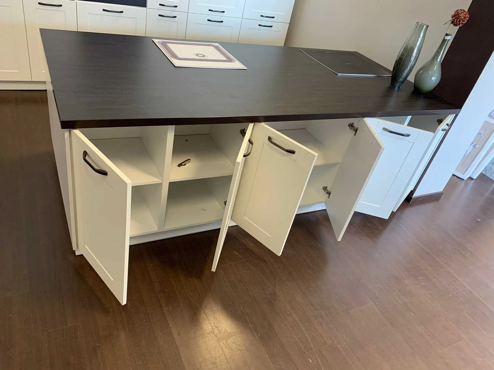 Toonzaalkeuken EXPO 30 WIT in BOUWPAKKET: Bestaande uit kook-/werkeiland, ingemaakte kast. Voorzien van: - Formica werkblad, dikte 38 mm, - Deuren en laden in MDF met afgerond laminaat 19mm, - Soft close sluitingen, Totale afmetingen: - Eiland: 1200 x 2648 mm, - Inbouwkast: 3815 x H 2066 mm, Zonder keukentoestellen, decoratie, verlichting, barstoelen en kookgerei. Inclusief: plinten, plinthouders, verstelbare pootjes, softclose SAMET scharnieren, deurtjes 19mm, kasten 16mm, werkblad 38mm, handvaten. Elke kast is apart dus de opstelling kan gemakkelijk aangepast worden, werkblad is niet uitgezaagd dus de koper kan zelf bepalen waar de kookplaat en spoelbak wordt geplatst. Gemakelijk om te monteren met montage-instructies De keukens zijn eenvoudig zelf te monteren. Hier vind je links naar korte instructievideo’s: https://www.youtube.com/shorts/NmspbV-G1Lc https://www.youtube.com/watch?v=BRwDgCH20cs https://www.youtube.com/watch?v=E2Invr5EQtY Je kan de modellen bekijken tijdens de kijkdag of 24/7 in onze kleine showroom met camerabewaking: Rode Akkers 4, 2460 Kasterlee (laatste gebouw links, eerste verdieping). Nee