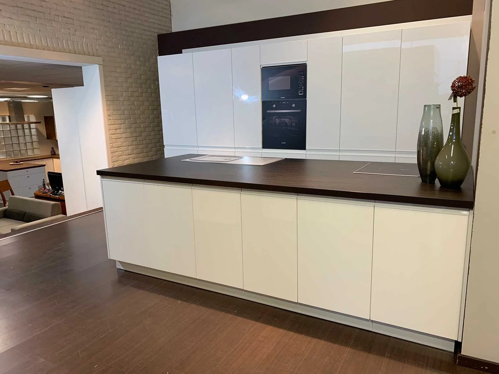 Toonzaalkeuken EXPO 3 WIT Hoogglans in BOUWPAKKET: Bestaande uit kook-/werkeiland, ingemaakte kast. Voorzien van: - Formica werkblad, dikte 38 mm, - Deuren en laden in MDF met afgerond laminaat 19mm, - Soft close sluitingen, Totale afmetingen: - Eiland: 1200 x 2648 mm, - Inbouwkast: 3815 x H 2066 mm, Zonder keukentoestellen, decoratie, verlichting, barstoelen en kookgerei. Inclusief: plinten, plinthouders, verstelbare pootjes, softclose SAMET scharnieren, deurtjes 19mm, kasten 16mm, werkblad 38mm, handvaten. Elke kast is apart dus de opstelling kan gemakkelijk aangepast worden, werkblad is niet uitgezaagd dus de koper kan zelf bepalen waar de kookplaat en spoelbak wordt geplatst. Gemakelijk om te monteren met montage-instructies De keukens zijn eenvoudig zelf te monteren. Hier vind je links naar korte instructievideo’s: https://www.youtube.com/shorts/NmspbV-G1Lc https://www.youtube.com/watch?v=BRwDgCH20cs https://www.youtube.com/watch?v=E2Invr5EQtY Je kan de modellen bekijken tijdens de kijkdag of 24/7 in onze kleine showroom met camerabewaking: Rode Akkers 4, 2460 Kasterlee (laatste gebouw links, eerste verdieping). Nee