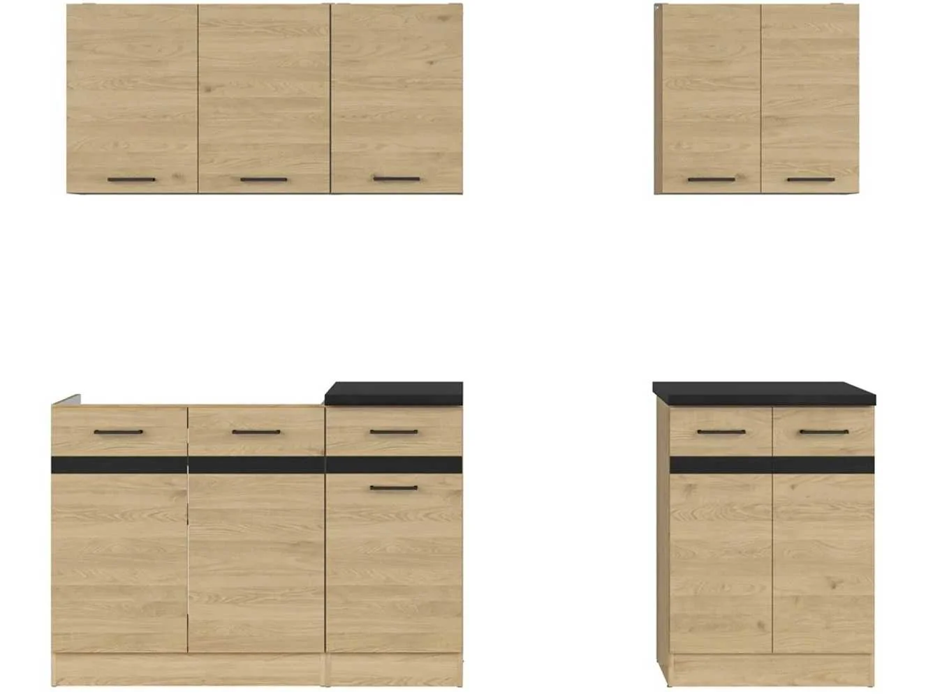 Complete keuken van 180cm(met plaats voor fornuis)=240 cm met spoelbak 80cm. Zonder fornuis, dampkap en kraan K24-JUNONA_WER_2/180A_ZBL-DBT/LMC Deze keukencombinatie met een breedte van 180 cm biedt de mogelijkheid om een schoorsteenkap, een vrijstaand fornuis met oven en kookplaat, en een dubbele spoelbak (inbegrepen) te plaatsen. Dankzij de afmetingen kan dit zowel de enige keukenopstelling in een kleine ruimte zijn, als onderdeel van een grotere keukeninstallatie. De stijlvolle kleurstelling in eiken Bernstein voor de corpus en fronten benadrukt het moderne karakter van het meubel. Het geheel wordt afgewerkt met strakke geïntegreerde handgrepen in grafietkleur en een werkblad in de tint zwart-goud metallic leisteen. De keuken Junona Line 180 bestaat uit zowel boven- als onderkasten – essentieel voor een goede organisatie van de bergruimte. Zo krijgen kookaccessoires, servies, bestek en andere keukenspullen hun vaste plek. In de bovenkasten kunnen borden, glazen en kruiden netjes worden opgeborgen, terwijl de onderkasten ruimte bieden voor een afvalbak, potten en pannen. Afmetingen Breedte: 180 cm Gewicht: 100,42 kg Dikte werkblad: 3,2 / 1,6 cm Diepte onderkasten: 47 cm Diepte bovenkasten: 30,5 cm Hoogte onderkasten: 85,7 cm Hoogte bovenkasten: 57,5 cm Materiaal Spaanplaat, MDF Inbegrepen in de set Werkblad Productkenmerken Frontgroep: Junona Line Kleur: bruin Opbouwspoelbak 60x80 cm – Black Red White Deze opbouwspoelbak met een afmeting van 60 x 80 cm kan eenvoudig worden gemonteerd op een brede onderkast. De keukens zijn eenvoudig zelf te monteren. Hier vind je links naar korte instructievideo’s: https://www.youtube.com/shorts/NmspbV-G1Lc https://www.youtube.com/watch?v=BRwDgCH20cs https://www.youtube.com/watch?v=E2Invr5EQtY Je kan de modellen bekijken tijdens de kijkdag of 24/7 in onze kleine showroom met camerabewaking: Rode Akkers 4, 2460 Kasterlee (laatste gebouw links, eerste verdieping). Nee