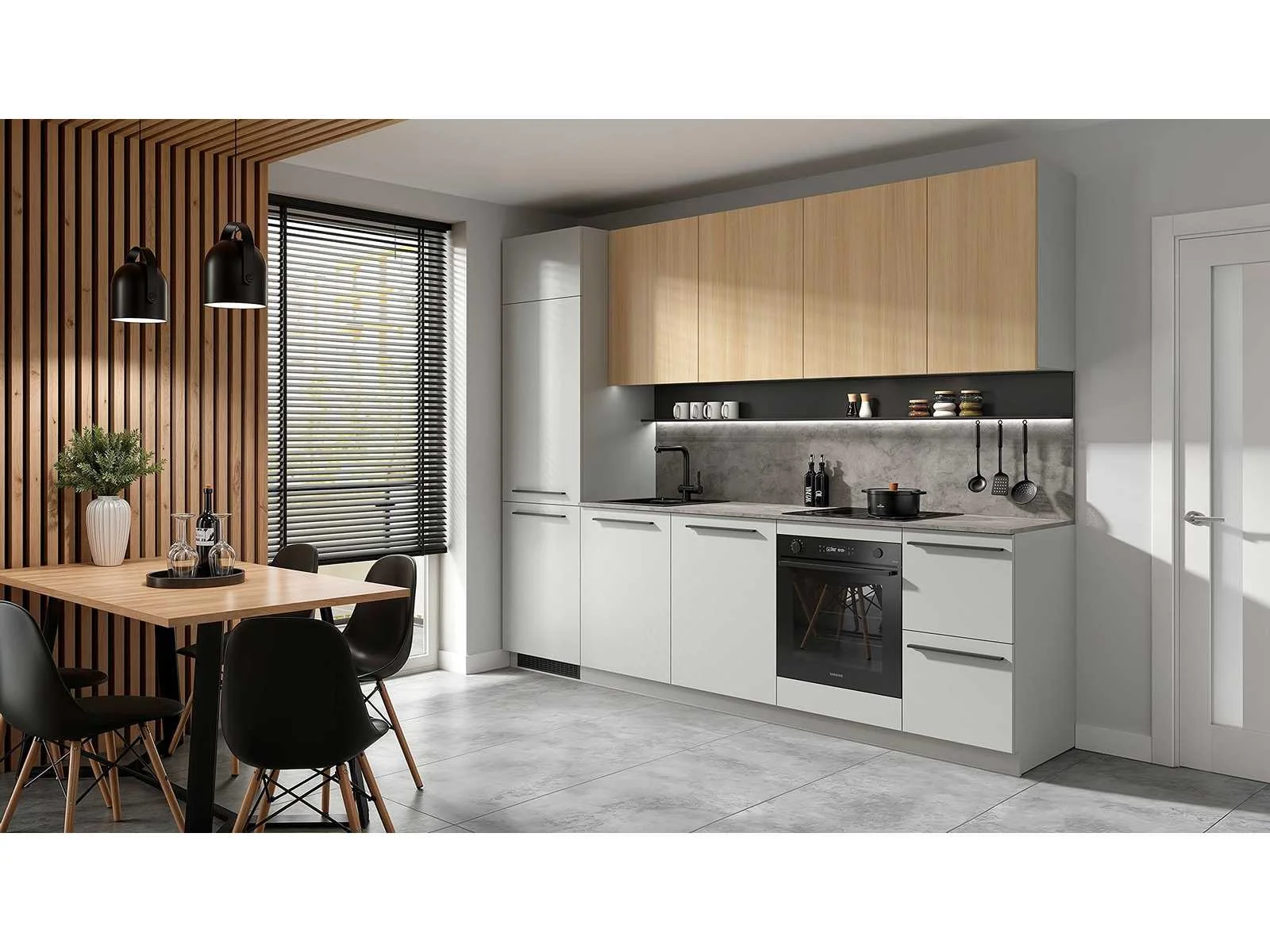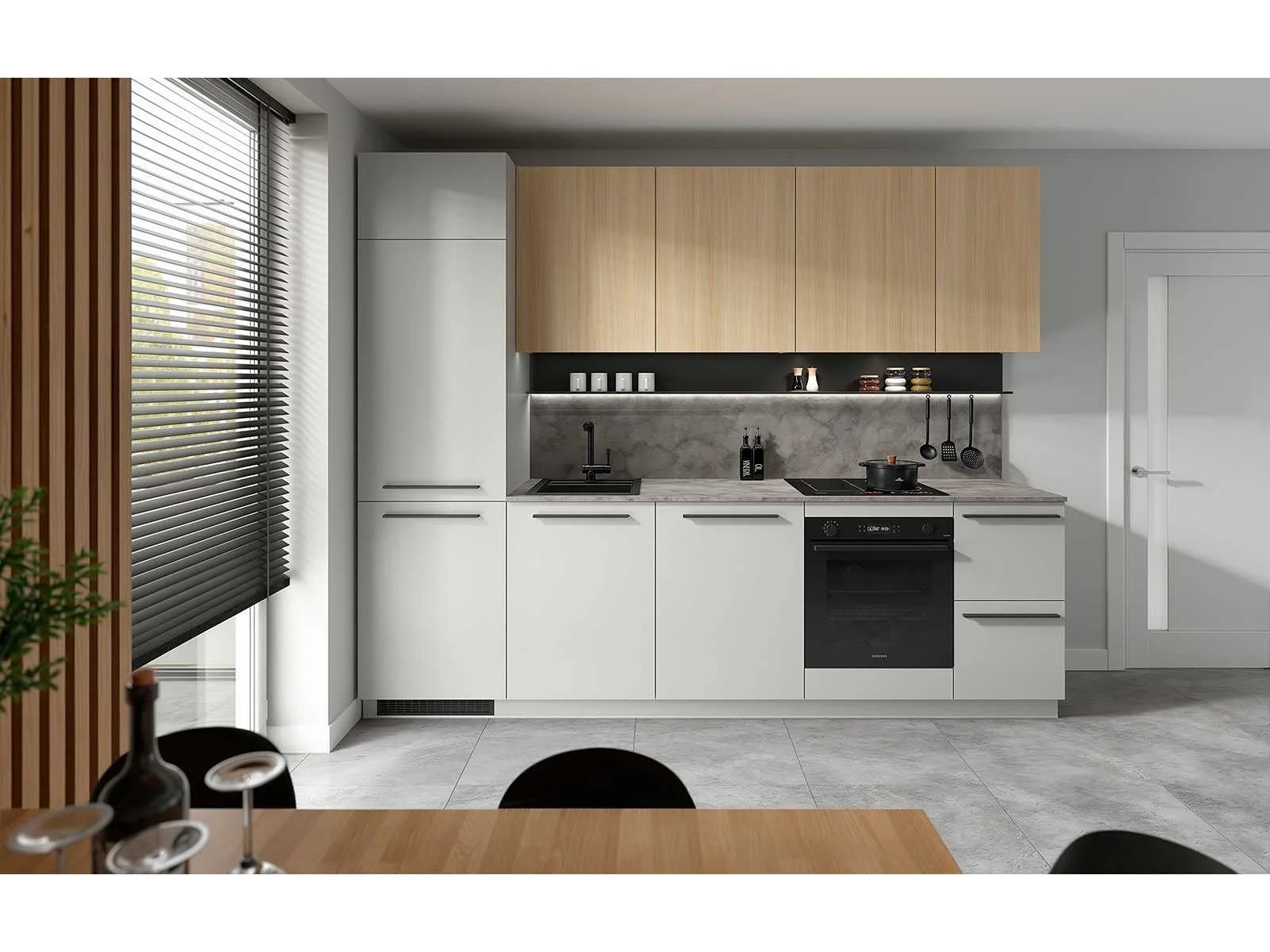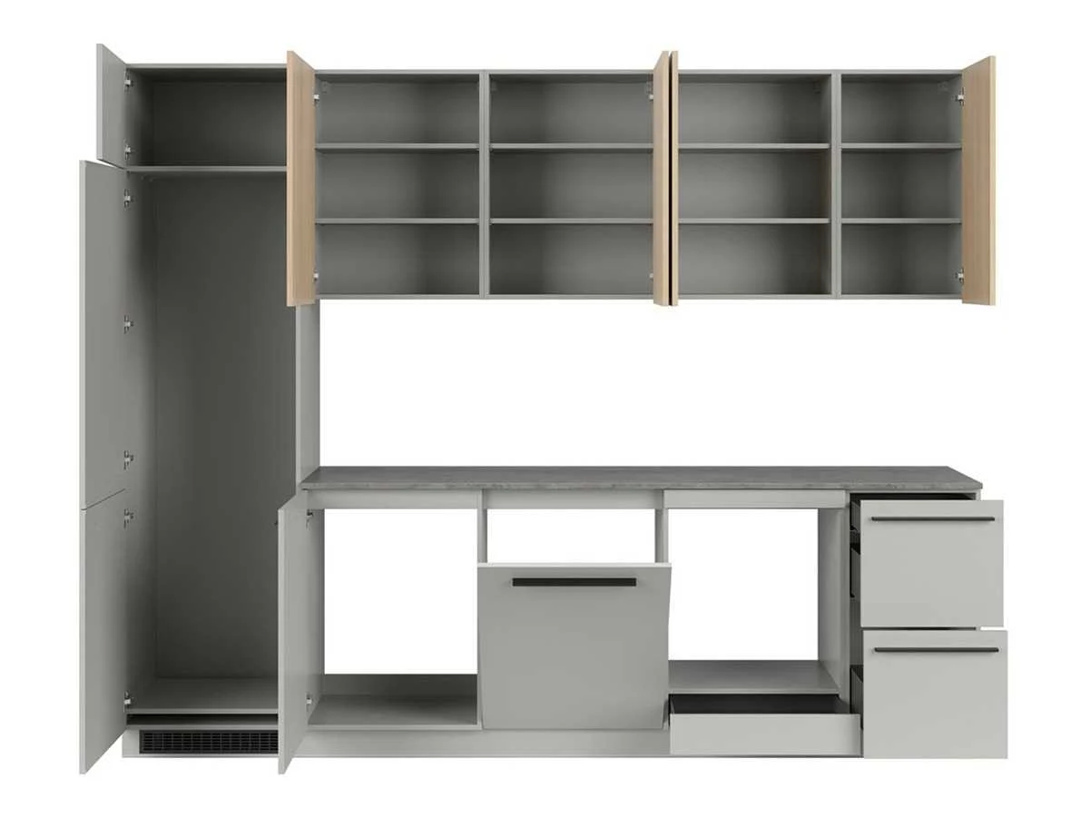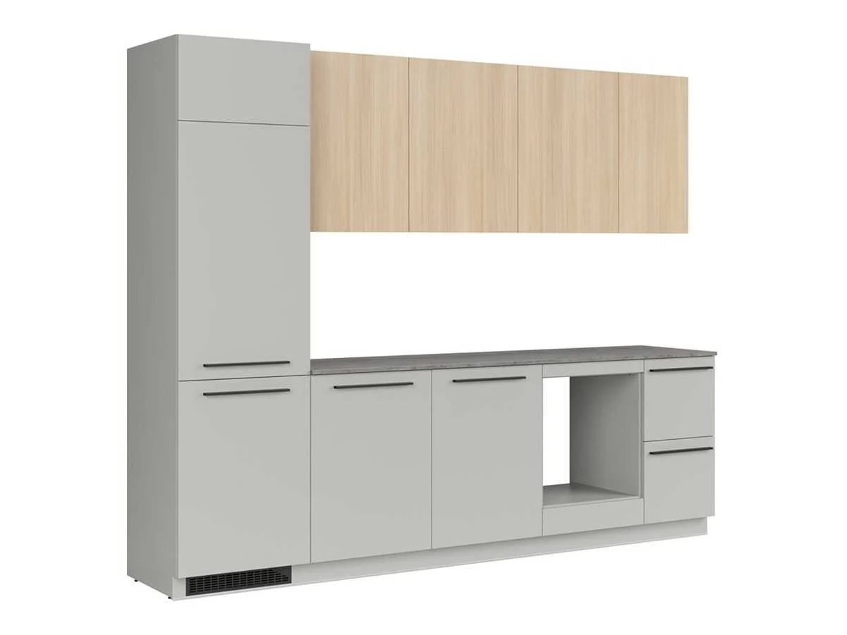 Complete keuken Milino Medium A 285 cm grijs/eik met werkblad – modern en functioneel Met een breedte van 285 cm biedt deze set voldoende werkruimte en opbergruimte, inclusief plaats voor een inbouwkoelkast, vaatwasser, oven en spoelbak. De onderkasten in grijs Chinchilla geven een moderne uitstraling, terwijl de bovenkasten in eik Barberà zand de keuken een warme, natuurlijke toets geven. Het werkblad in donkere leisteenstructuur vormt een mooi contrast. Dankzij de hoge koelkastkast (230,6 cm) vormt dit een volledige keukenwand. Werkblad en plint zijn inbegrepen, je hoeft ze niet apart te bestellen. De lades en scharnieren van Häfele zijn standaard uitgerust met soft-close, en een besteklade in antracietkleur zit ook in het pakket. Belangrijkste kenmerken: Afmetingen set: 285 cm breed Fronten onderkasten: grijs Chinchilla Fronten bovenkasten: eik Barberà zand Korpus: grijs Chinchilla Werkblad: Arosa donker leisteen (18 mm dik) Materiaal: gelamineerde plaat met PVC-randen Systeem: Häfele soft-close Bovenkasten: greeploos met TIP-ON Functies: plaats voor vaatwasser, oven, koelkast, spoelbak, veel bergruimte Inbegrepen: werkblad, plint, bestekindeling Basisversie: zonder wandpaneel en metalen plank (optie) Afmetingen en gewicht: Breedte: 285 cm Diepte onderkasten: 58,5 cm Diepte bovenkasten: 38,5 cm Hoogte onderkasten: 90 cm Hoogte bovenkasten: 80 cm Gewicht totaal: 276,45 kg Merk: Black Red White – Milino Kleurcombinatie: grijs Chinchilla / eik Barberà zand / werkblad Arosa donker leisteen De keukens zijn eenvoudig zelf te monteren. Hier vind je links naar korte instructievideo’s: https://www.youtube.com/shorts/NmspbV-G1Lc https://www.youtube.com/watch?v=BRwDgCH20cs https://www.youtube.com/watch?v=E2Invr5EQtY Je kan de modellen bekijken tijdens de kijkdag of 24/7 in onze kleine showroom met camerabewaking: Rode Akkers 4, 2460 Kasterlee (laatste gebouw links, eerste verdieping). Nee