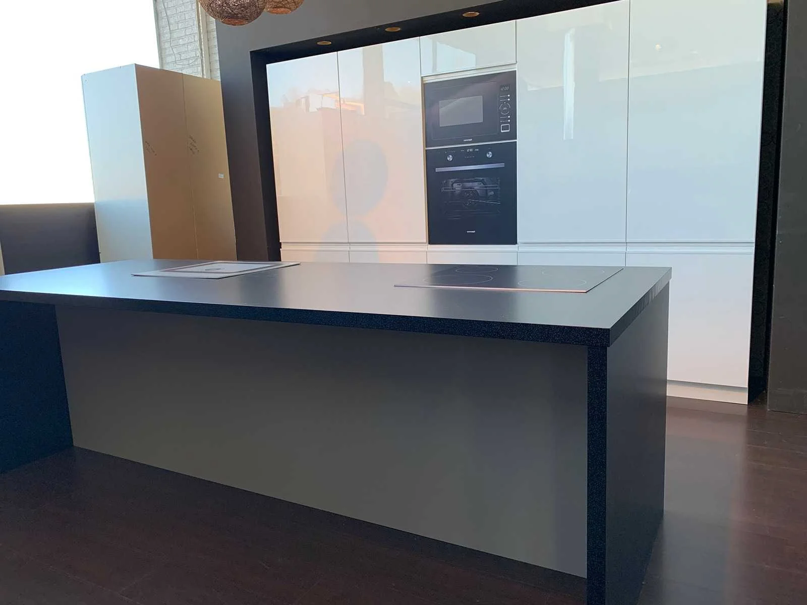 Toonzaalkeuken expo 42 sole white IN BOUWPAKKET: Bestaande uit kook-/werkeiland, ingemaakte kast. Voorzien van: - Formica werkblad, dikte 38 mm, - Deuren en laden in MDF met afgerond laminaat 19mm, - Soft close sluitingen, Totale afmetingen: - Eiland: 1000 x 2648 mm, - Inbouwkast: 3000 x H 2066 mm, Zonder keukentoestellen, decoratie, verlichting, barstoelen en kookgerei. Inclusief: plinten, plinthouders, verstelbare pootjes, softclose SAMET scharnieren, deurtjes 19mm, kasten 16mm, werkblad 38mm, roestvrijstaal handvaten. Elke kast is apart dus de opstelling kan gemakkelijk aangepast worden, werkblad is niet uitgezaagd dus de koper kan zelf bepalen waar de kookplaat en spoelbak wordt geplatst. De keukens zijn eenvoudig zelf te monteren. Hier vind je links naar korte instructievideo’s: https://www.youtube.com/shorts/NmspbV-G1Lc https://www.youtube.com/watch?v=BRwDgCH20cs https://www.youtube.com/watch?v=E2Invr5EQtY Je kan de modellen bekijken tijdens de kijkdag of 24/7 in onze kleine showroom met camerabewaking: Rode Akkers 4, 2460 Kasterlee (laatste gebouw links, eerste verdieping). Nee