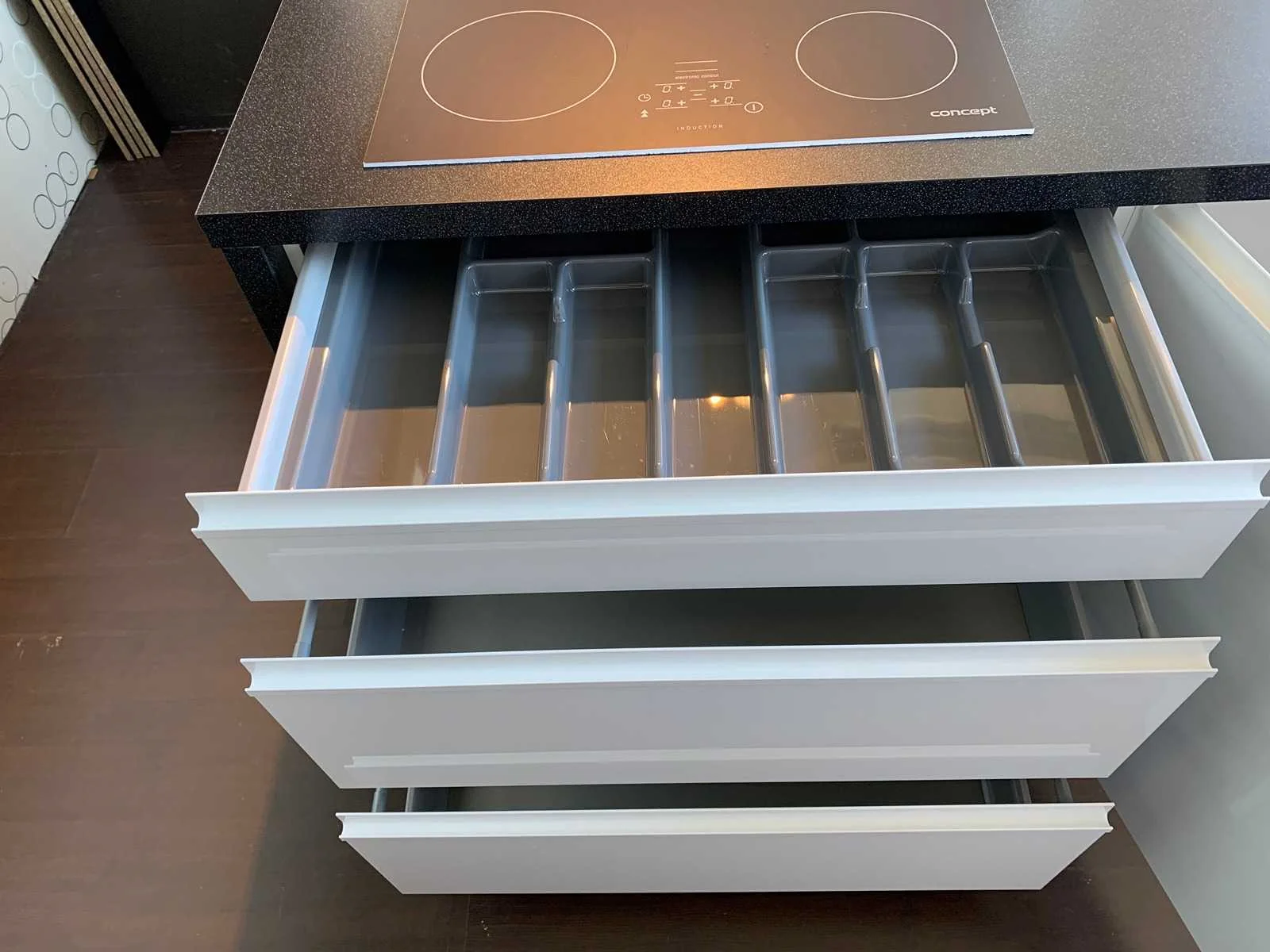 Toonzaalkeuken expo 42 sole white IN BOUWPAKKET: Bestaande uit kook-/werkeiland, ingemaakte kast. Voorzien van: - Formica werkblad, dikte 38 mm, - Deuren en laden in MDF met afgerond laminaat 19mm, - Soft close sluitingen, Totale afmetingen: - Eiland: 1000 x 2648 mm, - Inbouwkast: 3000 x H 2066 mm, Zonder keukentoestellen, decoratie, verlichting, barstoelen en kookgerei. Inclusief: plinten, plinthouders, verstelbare pootjes, softclose SAMET scharnieren, deurtjes 19mm, kasten 16mm, werkblad 38mm, roestvrijstaal handvaten. Elke kast is apart dus de opstelling kan gemakkelijk aangepast worden, werkblad is niet uitgezaagd dus de koper kan zelf bepalen waar de kookplaat en spoelbak wordt geplatst. De keukens zijn eenvoudig zelf te monteren. Hier vind je links naar korte instructievideo’s: https://www.youtube.com/shorts/NmspbV-G1Lc https://www.youtube.com/watch?v=BRwDgCH20cs https://www.youtube.com/watch?v=E2Invr5EQtY Je kan de modellen bekijken tijdens de kijkdag of 24/7 in onze kleine showroom met camerabewaking: Rode Akkers 4, 2460 Kasterlee (laatste gebouw links, eerste verdieping). Nee