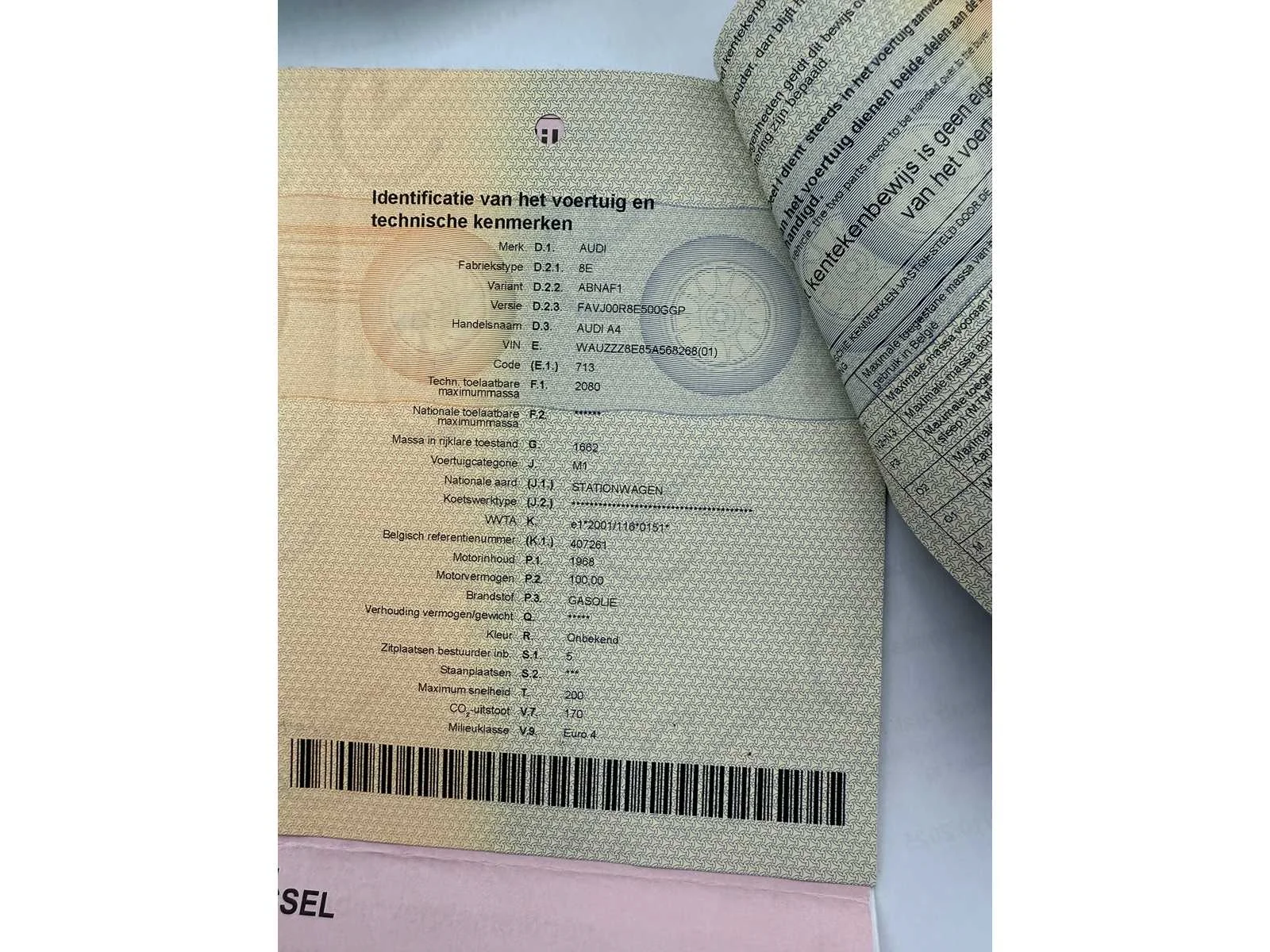 ALLE PAPIEREN AANWEZIG START EN RIJD AUTOMAAT Nee Merk: AUDI Model: A4 Bouwjaar: 2005 Cilinderinhoud: 1998cc Vermogen (kW): 100kW Brandstof: DIESEL Chassisnummer: WAUZZZ8E85A568268 Datum eerste toelating: 03-06-2005 Aantal zitplaatsen: 5 Kleur: GRIJS Transmissie: AUTOMAAT Emissieklasse: 4 Aantal sleutels: 1 Nationaliteit documenten: BELGIE Gelijkvormigheidsattest aanwezig: true Carpass: true Start en rijdt: JA Keuringsrapport geldig tot: 27-02-2026 Andere boorddocumenten: COMPLEET startinformatie : JA Inschrijvingsbewijs - deel 1 : AANWEZIG Inschrijvingsbewijs - deel 2: AANWEZIG