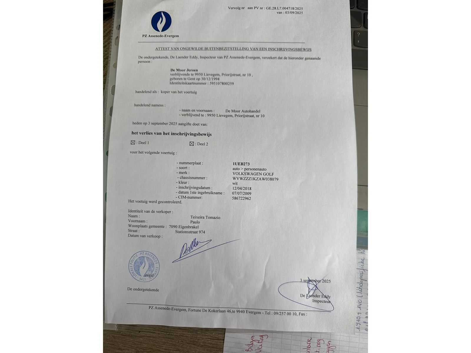 BOORDDOCUMENTEN ATTESTEN VERLIES POLITIE START EN RIJD PERFECT Nee Merk: VOLKSWAGEN Model: GOLF Type: 6 GTI Bouwjaar: 2009 Afgelezen kilometerstand: 212000km Cilinderinhoud: 1999cc Brandstof: BENZINE Chassisnummer: WVWZZZ1KZAW038079 Datum eerste toelating: 07-07-2009 Aantal zitplaatsen: 5 Kleur: WIT Transmissie: MANUEEL Emissieklasse: 5 Aantal deuren: 3 Aantal sleutels: 1 Nationaliteit documenten: BELGIE Carpass: true Start en rijdt: JA Inschrijvingsbewijs - deel 1 : ATTEST VERLIES Inschrijvingsbewijs - deel 2: ATTEST VERLIES