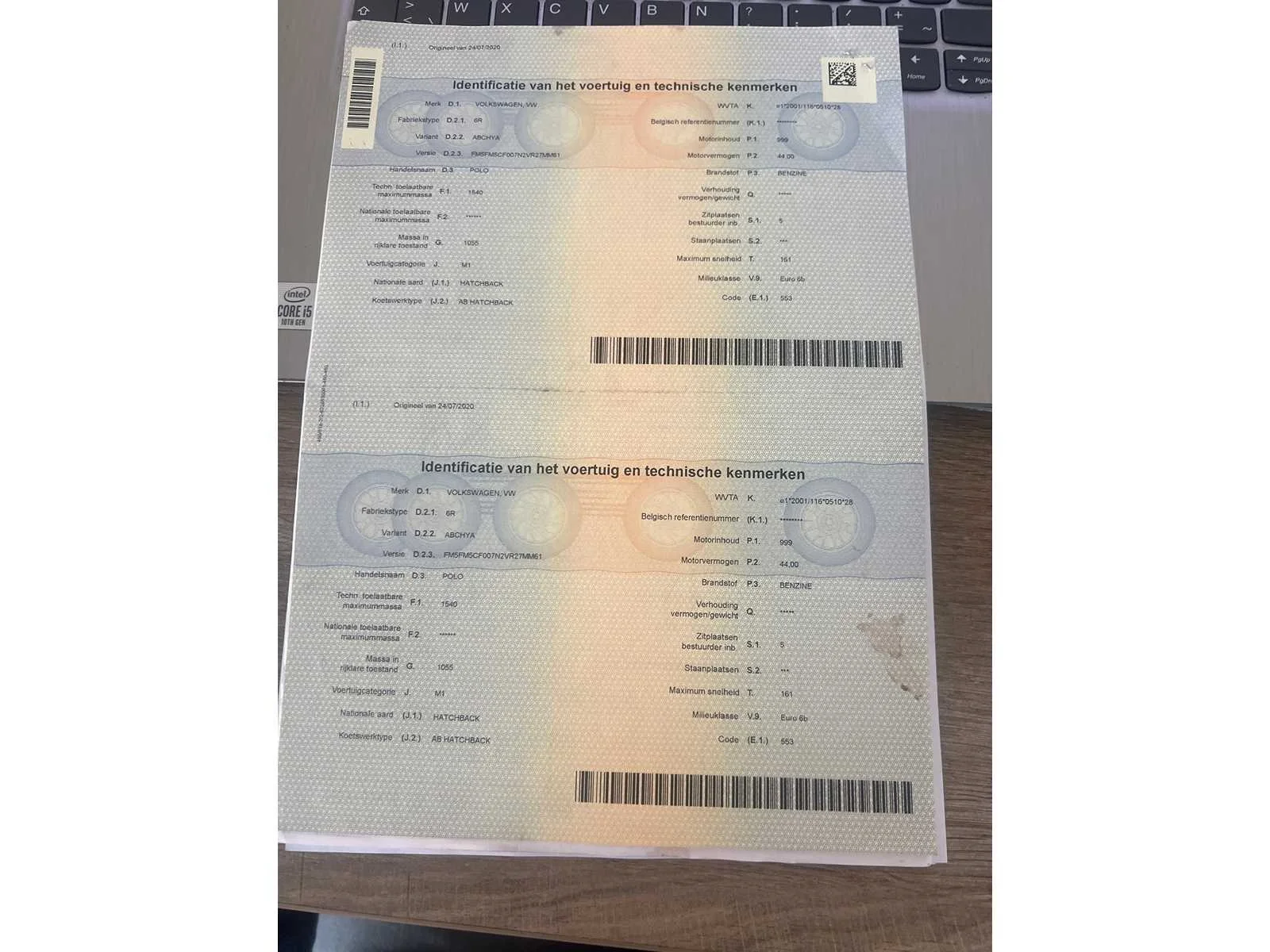 PAPIEREN AANWEZIG SLEUTEL AANWEZIG RIJDT GOED Nee Merk: VOLKSWAGEN Model: POLO Bouwjaar: 2017 Afgelezen kilometerstand: 63000km Cilinderinhoud: 999cc Vermogen (kW): 44kW Brandstof: BENZINE Chassisnummer: WVWZZZ6RZHY008828 Datum eerste toelating: 13-01-2017 Kleur: ZWART Transmissie: MANUEEL Emissieklasse: 6 Aantal deuren: 5 Nationaliteit documenten: BELGIE Gelijkvormigheidsattest aanwezig: true Carpass: true Start en rijdt: JA Andere boorddocumenten: COMPLEET startinformatie : JA Inschrijvingsbewijs - deel 1 : AANWEZIG Inschrijvingsbewijs - deel 2: AANWEZIG