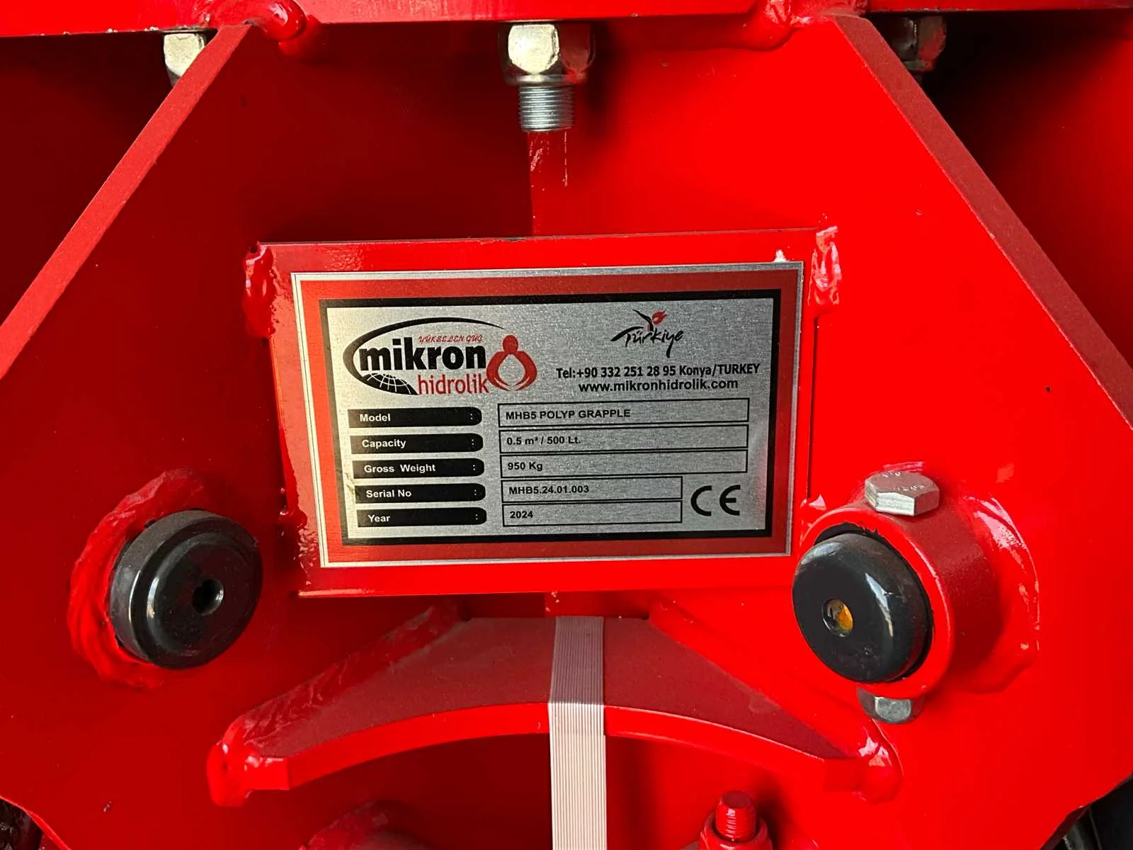 Nee Merk: Mikron Hidrolik Type: MHB5 Polyp Grapple Bouwjaar: 2024 Serienummer: MHB5.24.01.003 Eigen gewicht: 950kg