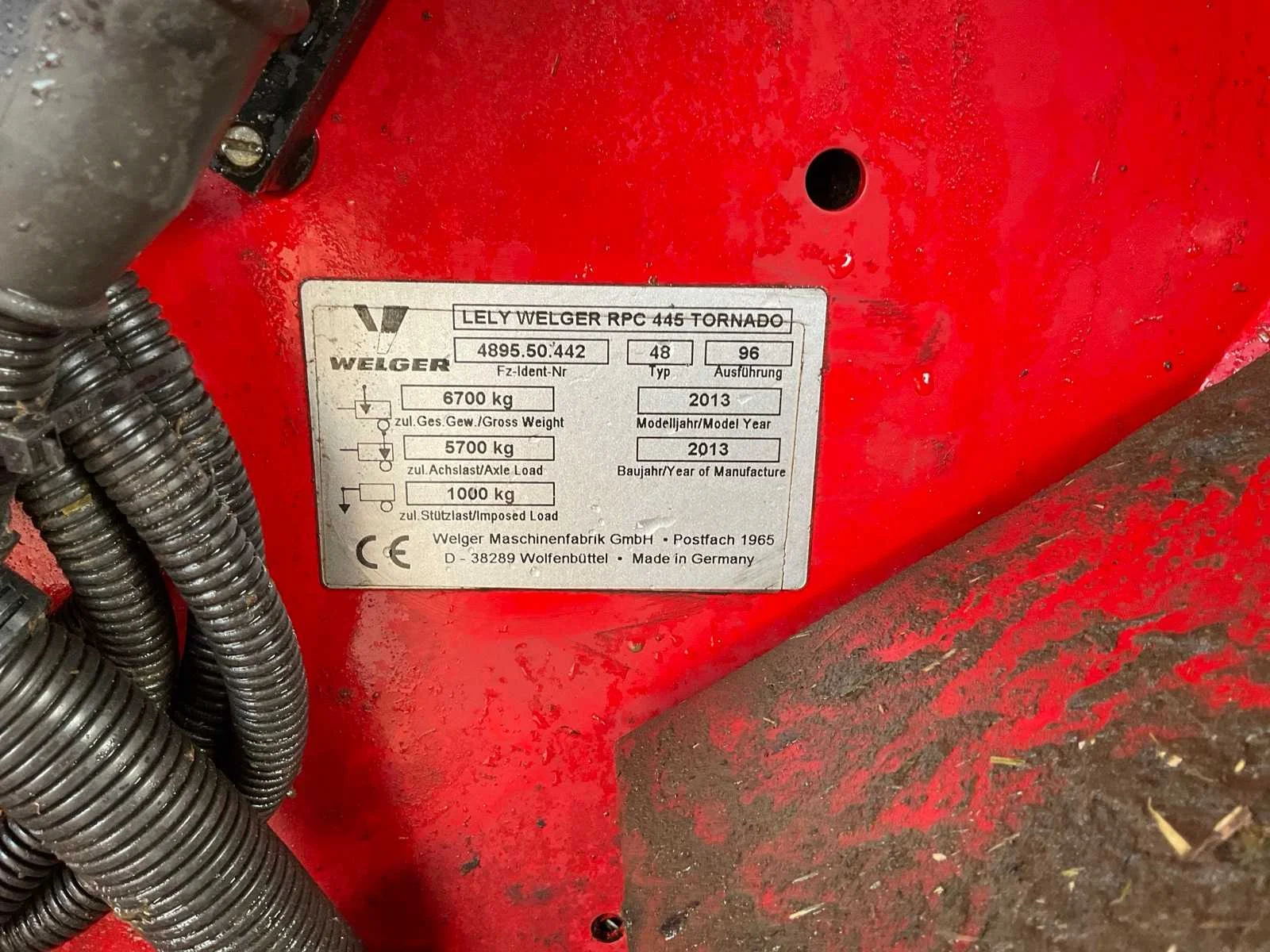 Scherm valt uit na persen van enkele balen . Nazicht vereist. Zowel hydraulisch als pneumatische remmen (combinatie) Variabele kamer van 1m tot 1,6m Aantal balen niet afgelezen. Nee Merk: Lely Type: WELGER RPC 445 TORNADO Bouwjaar: 2013 Werkbreedte pick-up: 2200mm