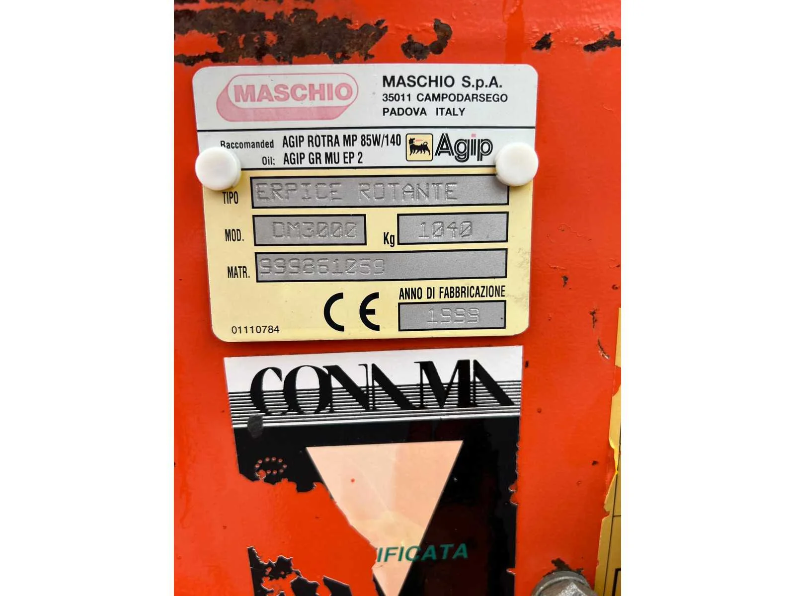 Maschio DM3000 rotorkopeg, bouwjaar 1999, in goed werkende staat. Werkbreedte van 3 meter, met achterpakkerrol en cardanasoverbrenging. Robuuste machine, ideaal voor het voorbereiden van zaaibedden voor het zaaien. Normale slijtage voor zijn leeftijd, gedeeltelijk afbladderende verf, enkele oppervlakkige roestvlekken. Regelmatig onderhoud, klaar voor gebruik. Non Merk: Maschio Type: DM 3000 Bouwjaar: 1999 Serienummer: 999861059 Werkbreedte: 3000mm
