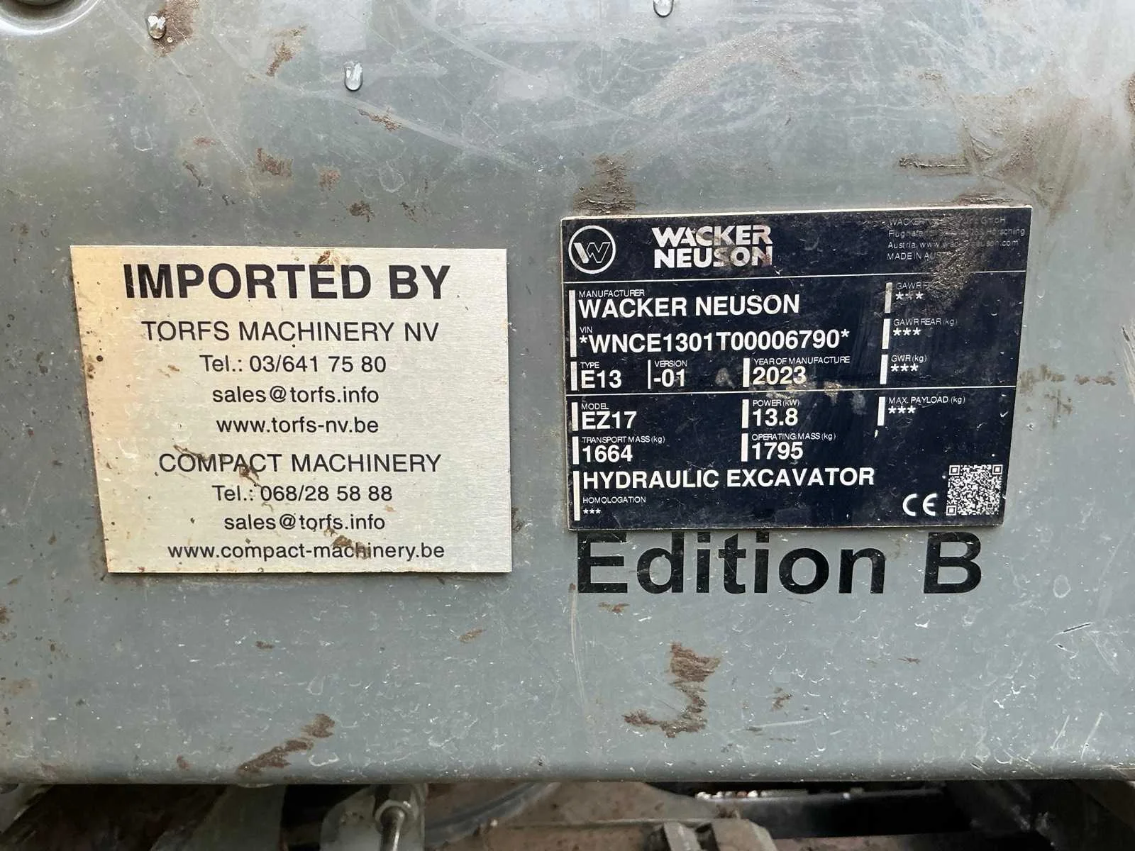Inclusief 200 mm bak en 400 mm bak Non Merk: Wacker Neuson Type: E13 - EZ17 Bouwjaar: 2023 Serienummer: WNCE1301T00006790 Merk motor: Yanmar Motorvermogen (kW): 13.8kW Aantal cilinders: 3 Brandstof: Diesel Bedrijfsgewicht: 1795kg Inclusief graafbak: Ja Graafbak afm. l: 1000mm Graafbak afm. b: 40mm