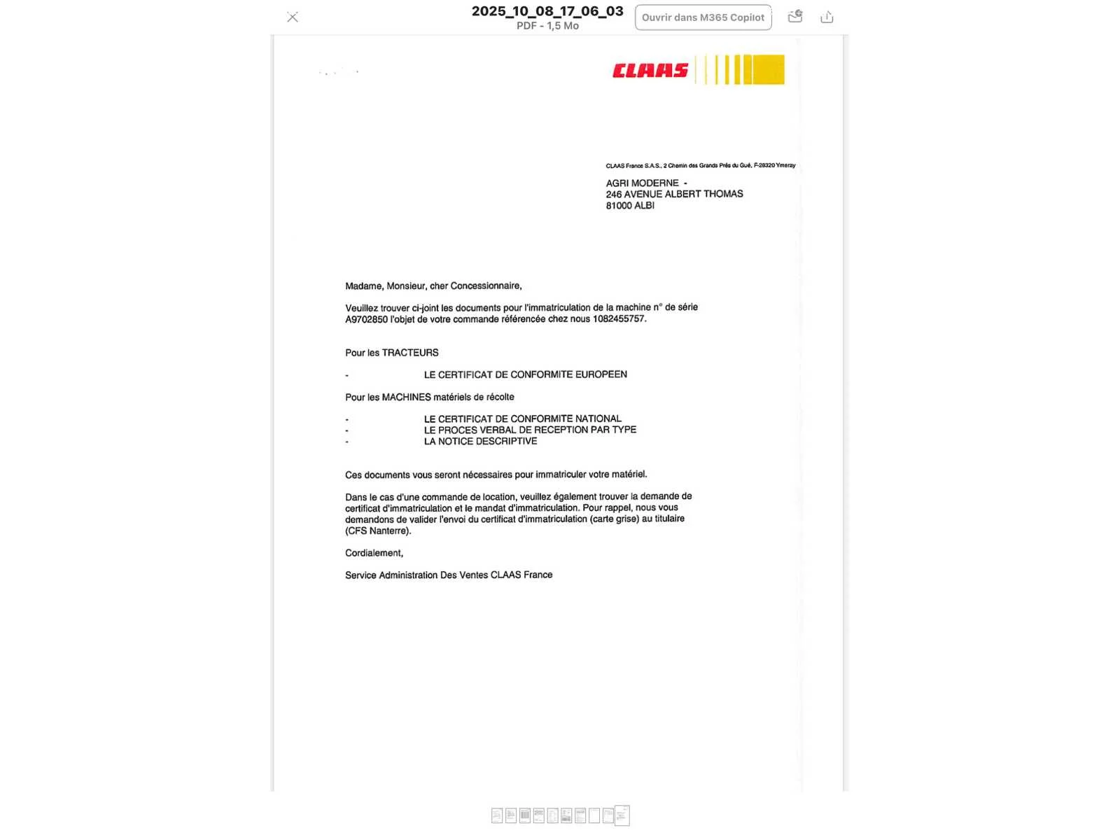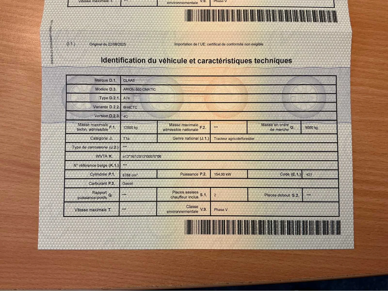 COC en technische informatie zie foto's ⸻ 🚜 TE KOOP – Claas Arion Cmatic tractor (2023) – 1440 h – 210 pk – Uitstekende staat! Ga voor prestaties met deze Claas Arion Cmatic uit 2023. Een moderne, betrouwbare en comfortabele tractor die perfect is voor veeleisende boerderijen. 🔧 Technische kenmerken: • Merk / model: Claas Arion Cmatic • Jaar: 2023 • Chassisnummer: VPKTA7400A9702850 • Draaiuren: 1440 uur • Vermogen: 154 kW / 210 pk • Transmissie: Cmatic (traploos variabel – soepel en efficiënt rijden) • Algemene staat: Zeer goed – Regelmatig onderhoud, klaar voor gebruik • Banden: In goede staat ✅ Uitrusting: ✔️ Comfortabele cabine met airconditioning ✔️ Voorwielophanging ✔️ Hefinrichting voor/achter en aftakas ✔️ Hydraulische verdelers ✔️ CEBIS / CIS-terminal (te specificeren) ✔️ GPS-compatibel (indien aanwezig) met RTK automatische begeleiding Frontlift: Ja 📄 Verstrekte documenten: • Chassisnummer: VPKTA7400A9702850 • Servicehistorie aanwezig • Geen reparaties te verwachten Nee Merk: Claas Type: ARION 660 Bouwjaar: 2023 Serienummer: 6H4CTC Afgelezen urenstand: 1440 Versnellingsbaktype: C Mativ Chassisnummer: VPKTA7400A9702850