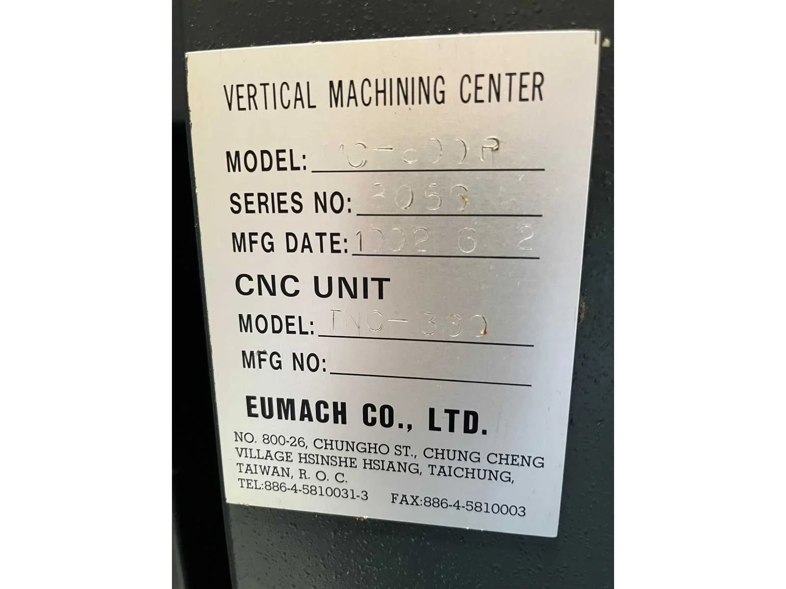 ATC 24 positions No Merk: Eumach Type: MC-800P Serienummer: 8056 Opname iso: 40 Verplaatsing x-as: 760mm Verplaatsing y-as: 460mm Verplaatsing z-as: 460mm Snelheid van n =: 0rpm Snelheid tot n =: 8000rpm CNC-besturing, merk, type: Heidenhain TNC 360 Koelmiddelpomp: true T-gleuf opspantafelafmeting B: 410mm T-gleuf opspantafelafmeting L: 900mm Motorvermogen (kW): 15kW Aansluiting: 400V
