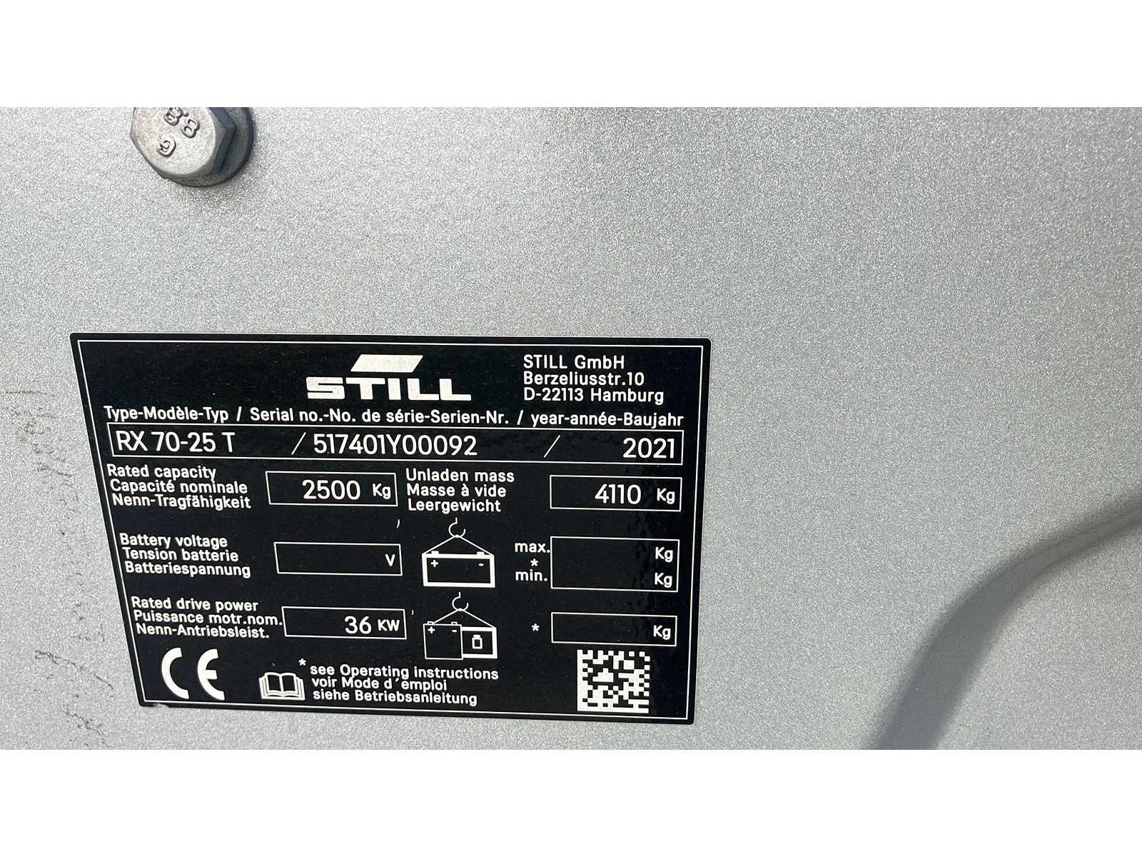 Demo machine No Merk: Still Type: RX 70-25T Bouwjaar: 2021 Serienummer: 517401Y00092 Brandstof: Diesel Afgelezen urenstand: 1217 Free-lift: false Side-shift: true Duplex mast: true Triple mast: false Eigen gewicht: 4110kg Hefvermogen: 2500kg Lepellengte: 1200mm Min. hefhoogte: 0mm Max. hefhoogte: 4000mm Hefhoogte: 4000mm Vol rubber banden: true Totale afmeting L: 2600mm Totale afmeting Breedte: 1200mm Totale afmeting Hoogte: 2300mm Diesel: false LPG: true GS Code: 84272019