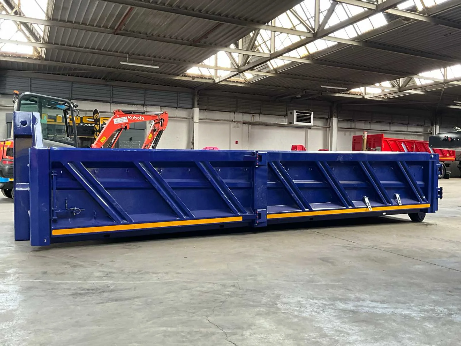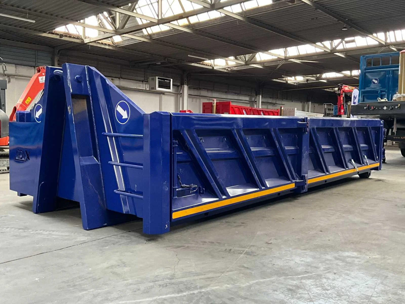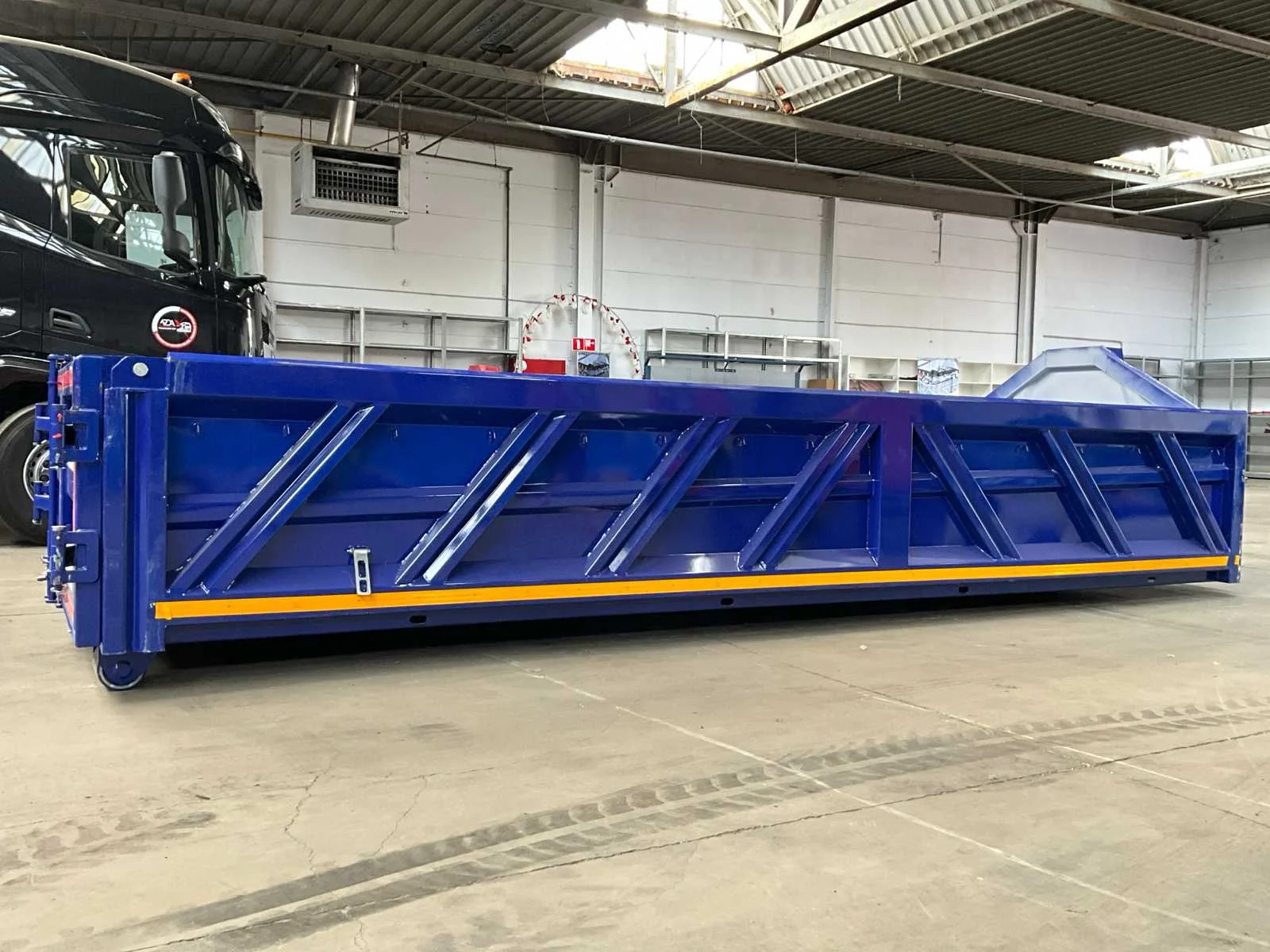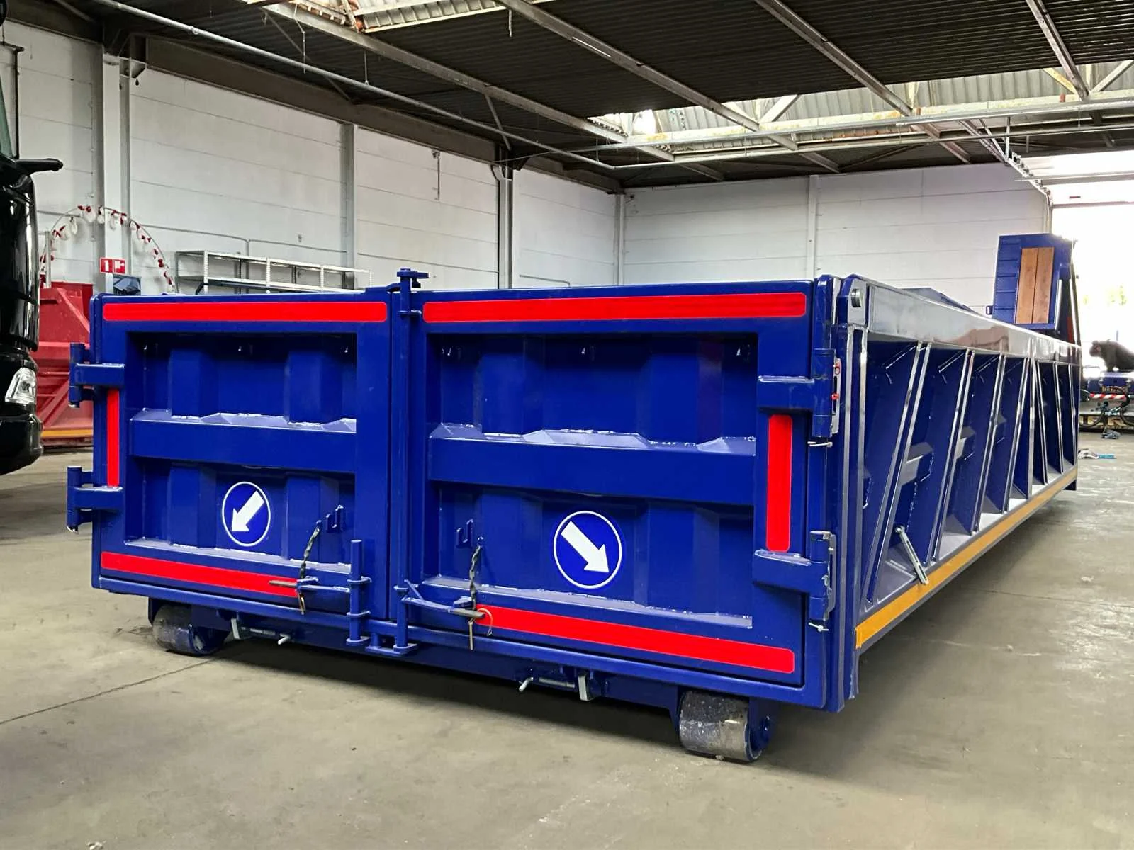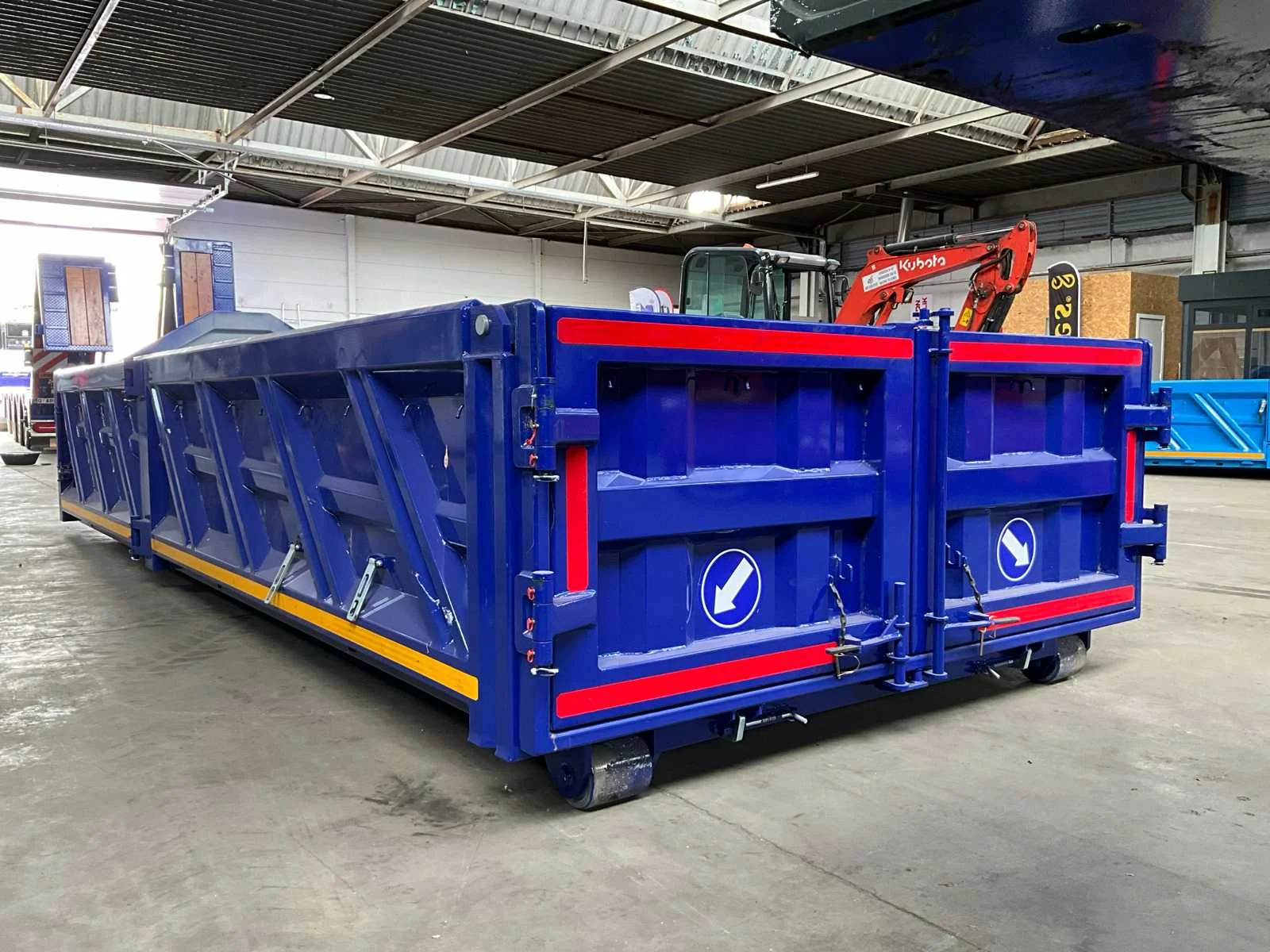 Nieuwe donker blauwe Ardax container met haak en met zijdeur links vooraan. Inclusief franse deur die open gaat. Inclusief haken om netten te bevestigen. Binnenmaat afmetingen 235 cm op 630 cm op 90 cm. Zie foto’s voor details. Nee Merk: Ardax Bouwjaar: 2024 Totale afmeting L: 6300mm Totale afmeting Breedte: 2500mm Totale afmeting Hoogte: 1150mm