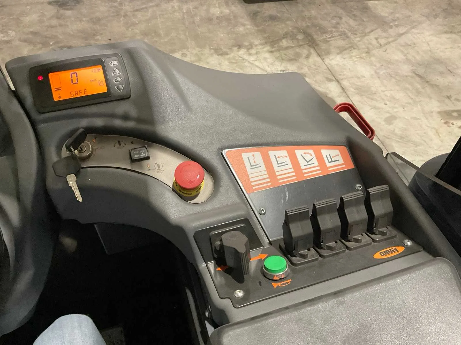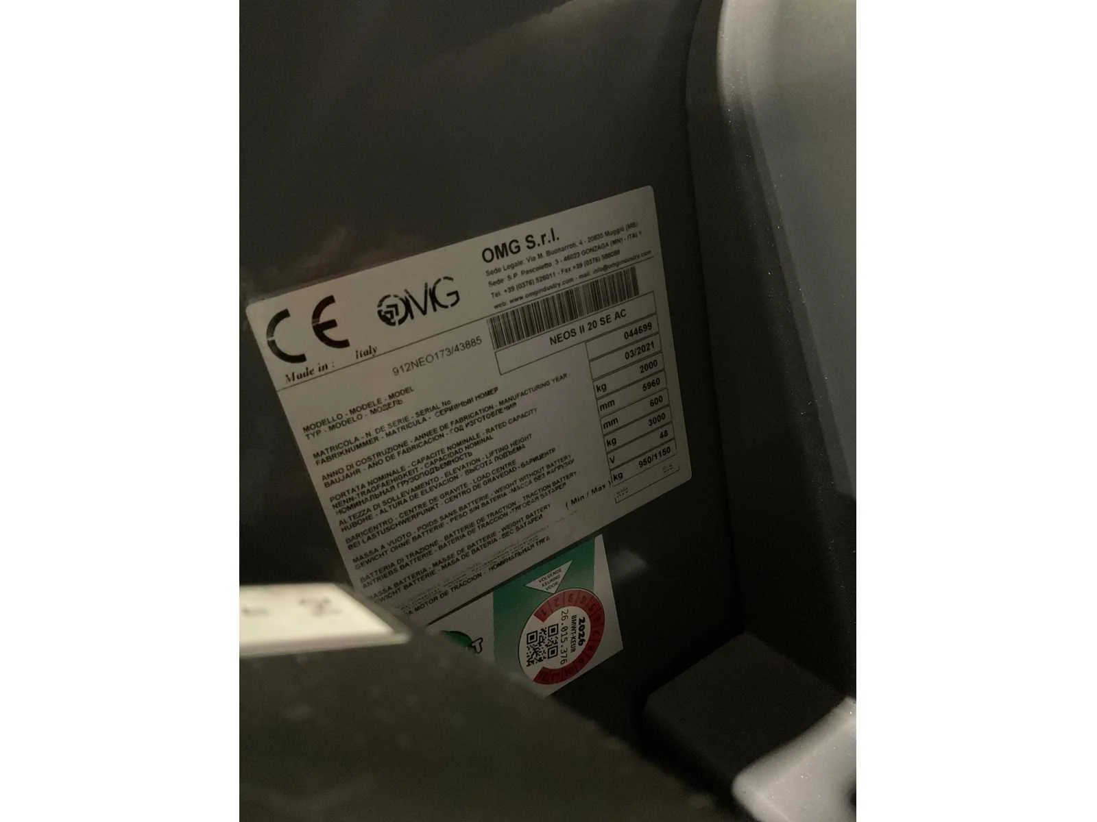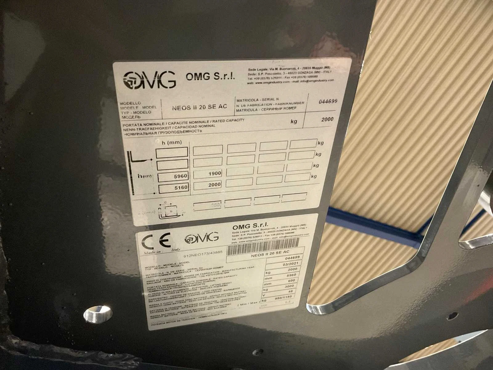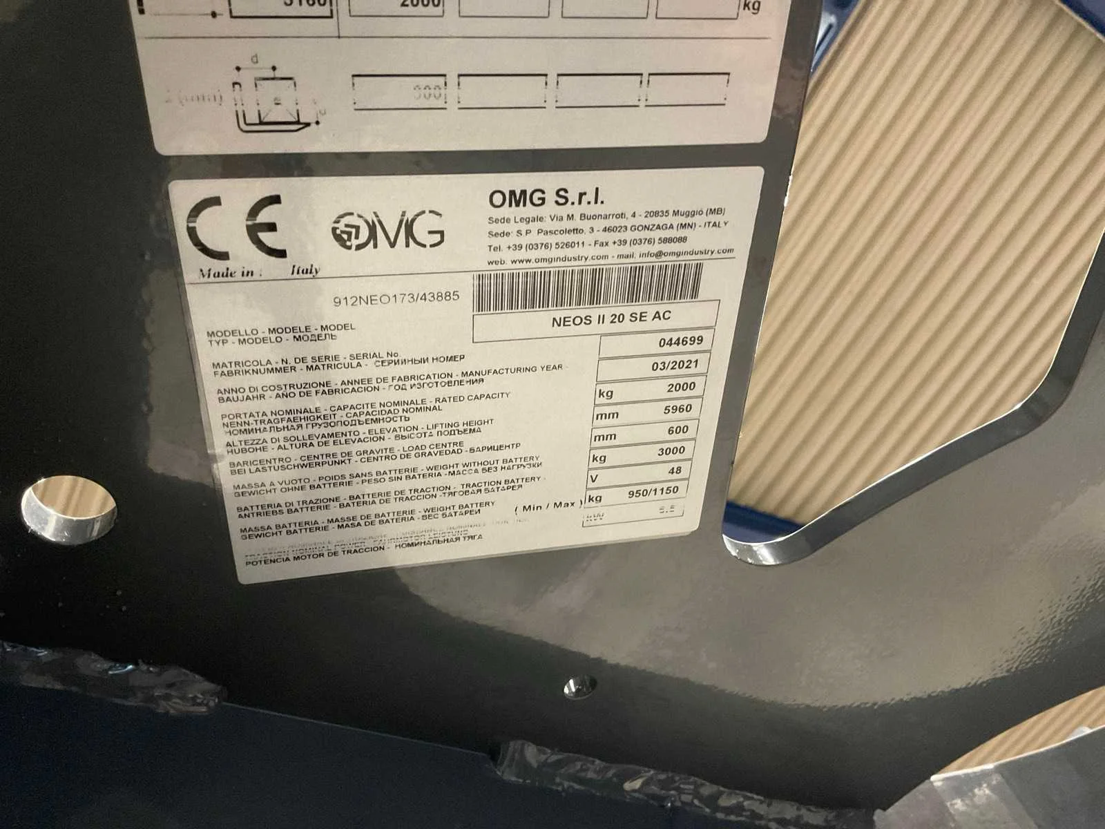Ongebruikt . Voert alle functies uit. Accu 48V620A OCC Banden 18x7-6 Nee Merk: OMG Type: Neos II 20SE AC Bouwjaar: 2021 Serienummer: 44699 Soort band: Rubber Accu lader: true Triple mast: true Hefvermogen: 2000kg Lepellengte: 1150mm Max. hefhoogte: 6000mm Minimale doorrijhoogte: 2665mm Elektrisch: true Vol rubber banden: true