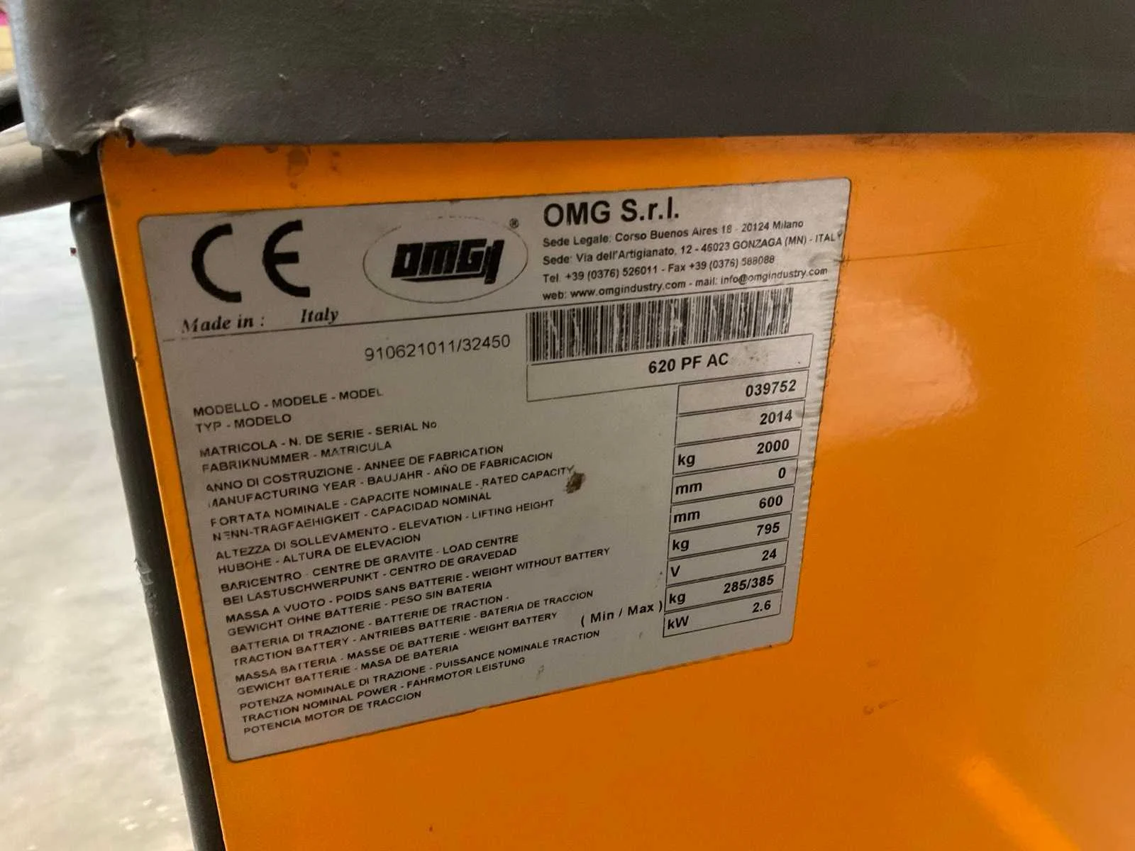 In werkende staat , voert alle functies uit . Acculader inbegrepen . Nee Merk: OMG Type: 620 PF AC Bouwjaar: 2014 Serienummer: 38888 Hefvermogen: 2000kg Hefhoogte: 115mm Lepellengte: 1150mm Accu lader: true Afgelezen urenstand: 1379