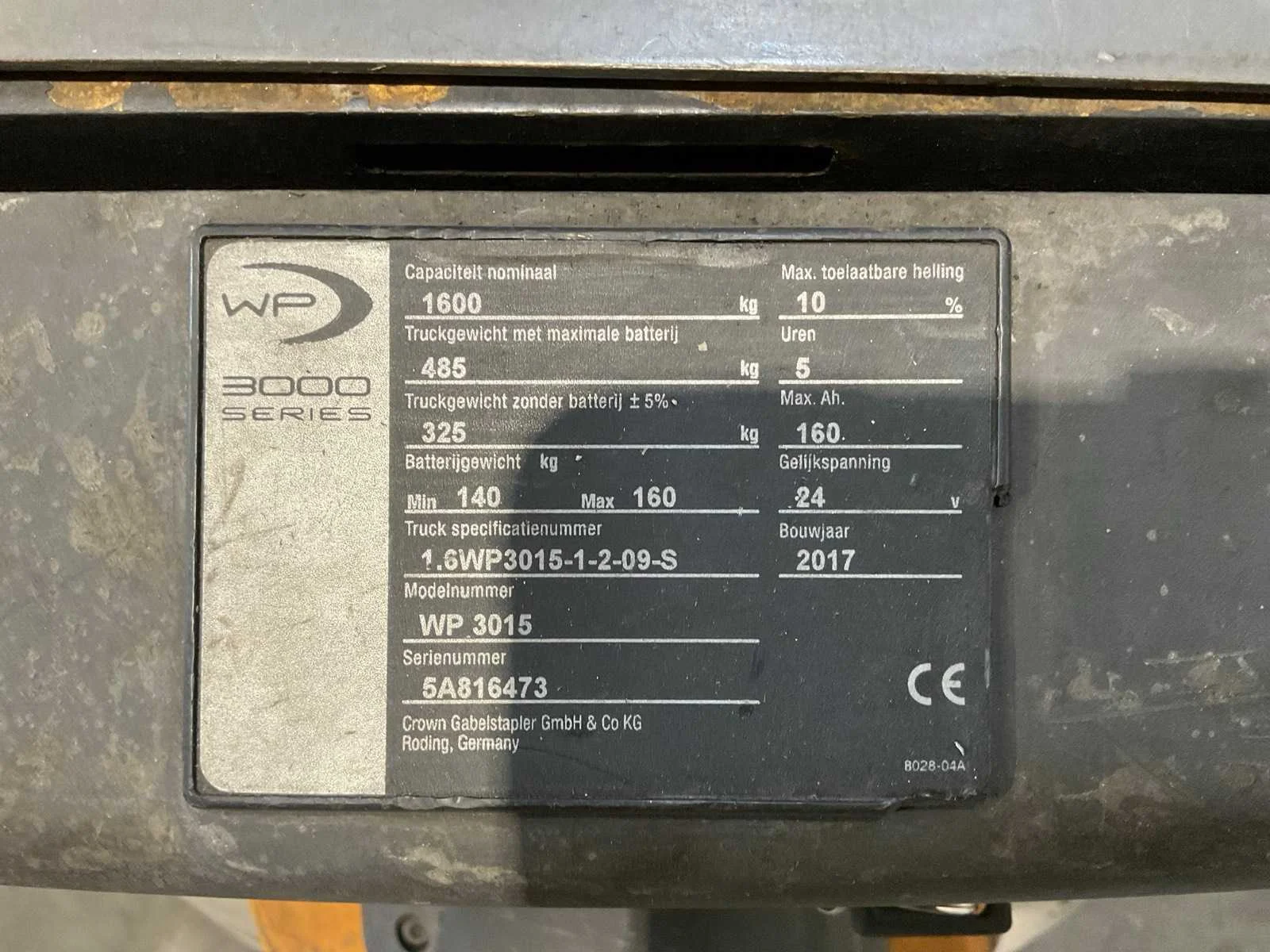 Voert alle functies uit. Nee Merk: Crown Type: WP3015 Bouwjaar: 2017 Serienummer: 5A816473 Hefvermogen: 1600kg Lepellengte: 1150mm Accu lader: true Afgelezen urenstand: 215