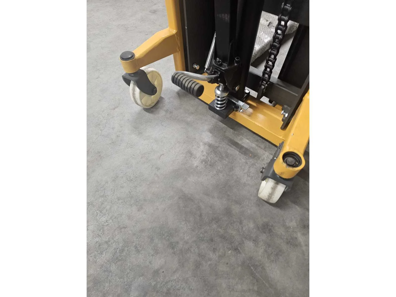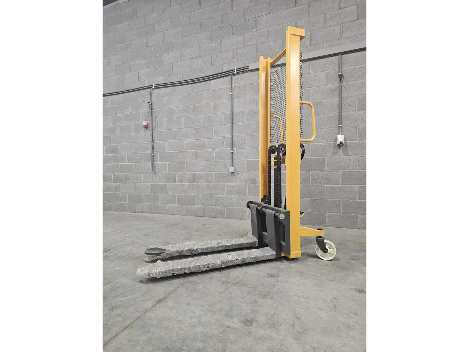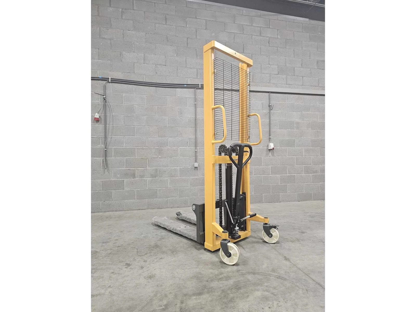 Degelijke en betrouwbare handstapelaar met een hefvermogen van 1000 kg en een hefhoogte tot 1,6 meter - Perfect voor gebruik in magazijnen, werkplaatsen of winkels waar regelmatig pallets of goederen op hoogte geplaatst moeten worden - De stapelaar is handbediend via zowel een handgreep als voetpomp, wat zorgt voor een gecontroleerde en veilige bediening - Dankzij de verstelbare vorkbreedte is hij geschikt voor verschillende soorten pallets - Vorkafmetingen: 60 x 160 x 1150 mm - De stalen constructie en dikke hefketting zorgen voor duurzaamheid en stabiliteit bij dagelijks gebruik - De nylon wielen maken de stapelaar lichtlopend en gemakkelijk te manoeuvreren, ook op gladde vloeren - Machine is ongebruikt, vorken zijn nog voorzien van beschermfolie - verkoper kan laden Nee Hefvermogen: 1000kg Hefhoogte: 1600mm Lepellengte: 1150mm Afgelezen urenstand: 0 Eigen gewicht: 125kg Minimale doorrijhoogte: 0mm Totale afmeting L: 1700mm Totale afmeting Breedte: 950mm Totale afmeting Hoogte: 1950mm