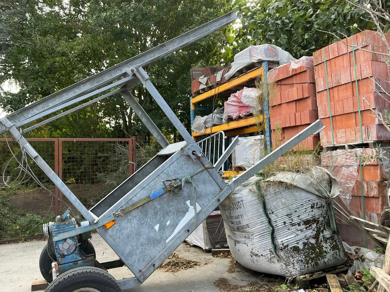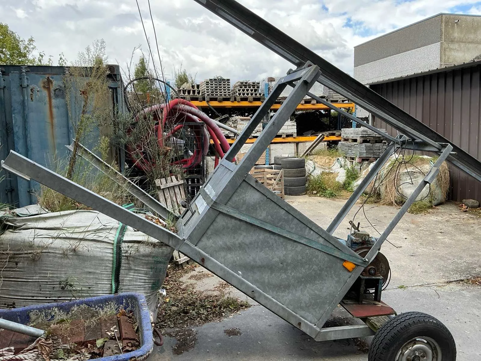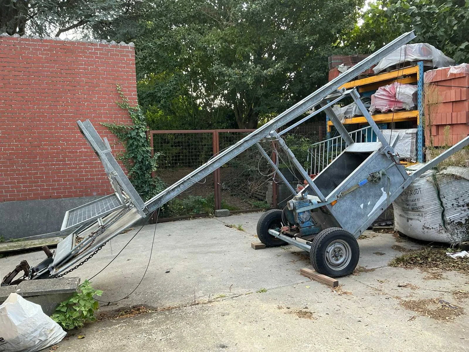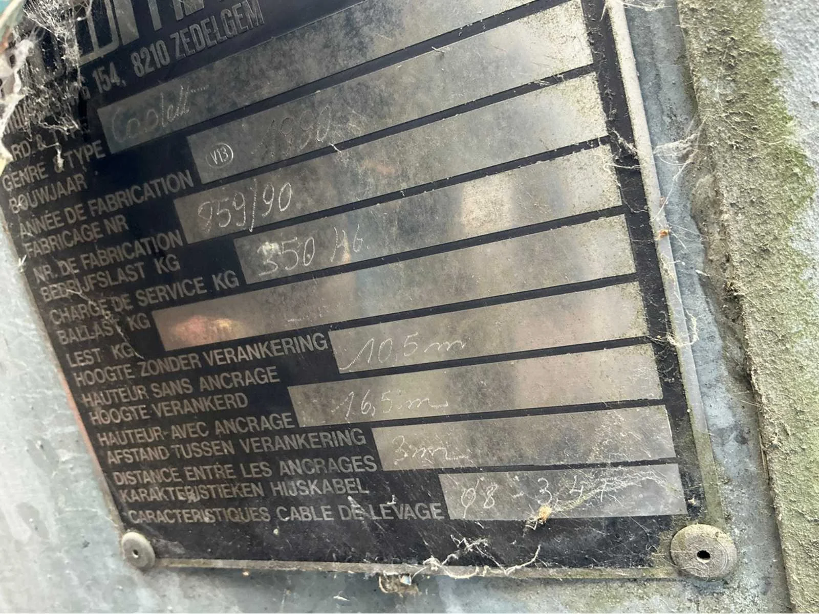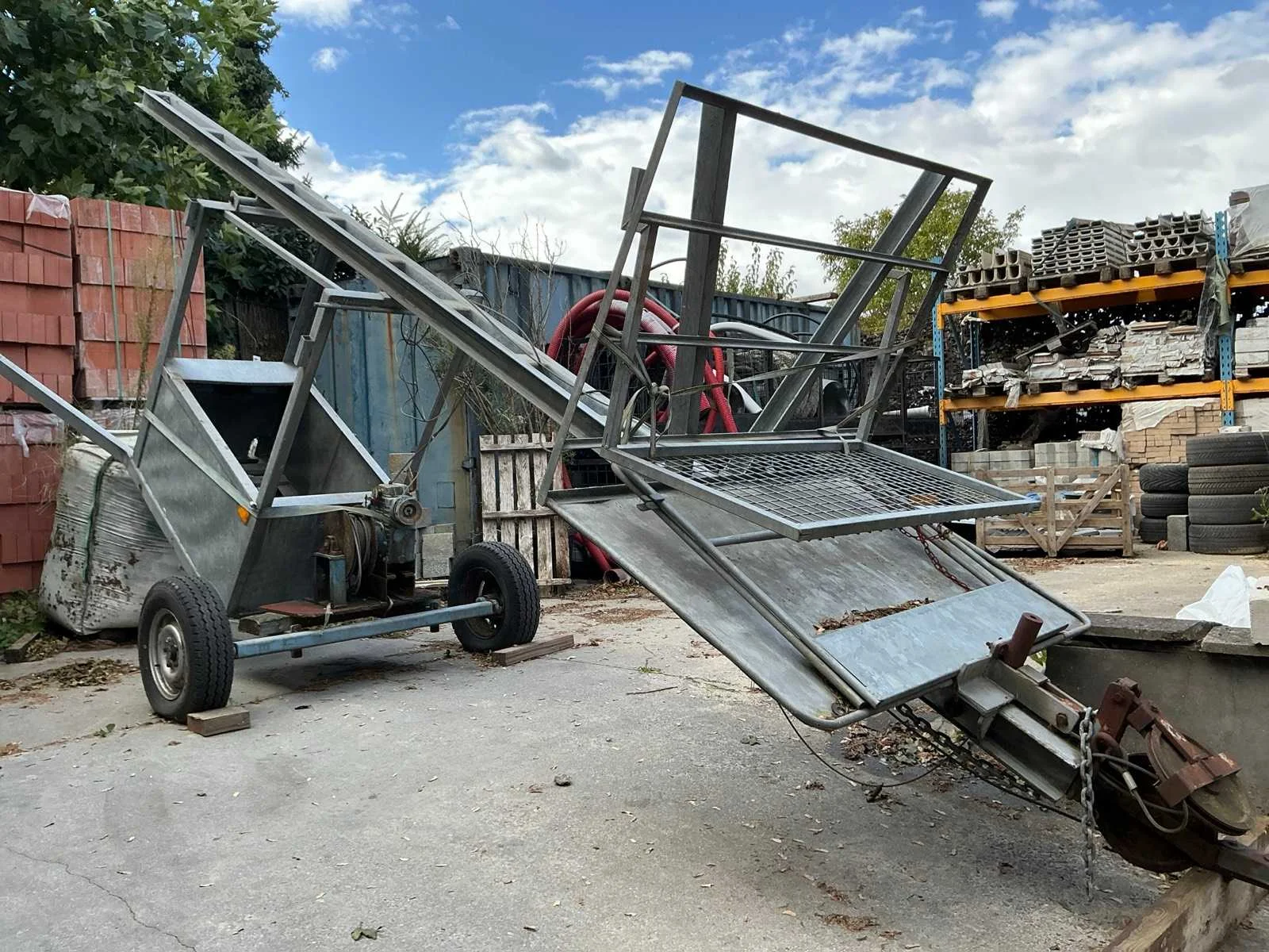 Bouwlift uit gegalvaniseerd staal, kan vervoerd worden, as zit niet geblokkeerd! Verlichting voor transport nog te voorzien! moet door koper opnieuw werkzaam gemaakt worden. Staalkabel en motor aanwezig. Werking onbekend. Typeplaatje spreekt over 10,5m hefhoogte, de mast meet 7 meter. Nee Bouwjaar: 1990 Staalkabel: true Max. belasting: 350kg Hefhoogte: 10m Plateau afm. l: 1100mm Plateau afm. b: 1500mm Aantal mastdelen: 1 Totale afmeting Breedte: 1700mm