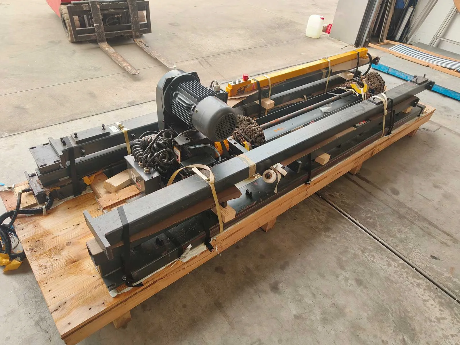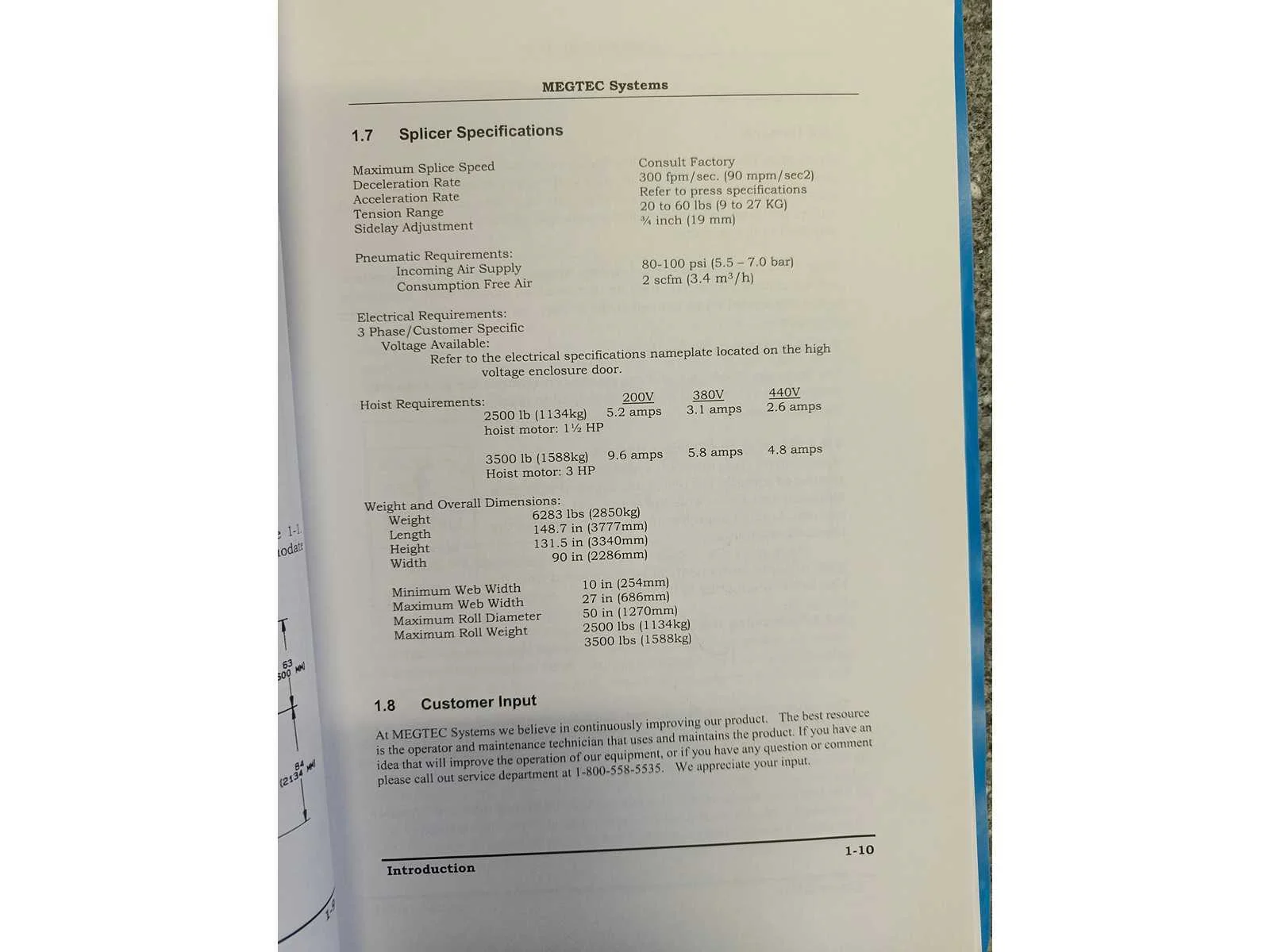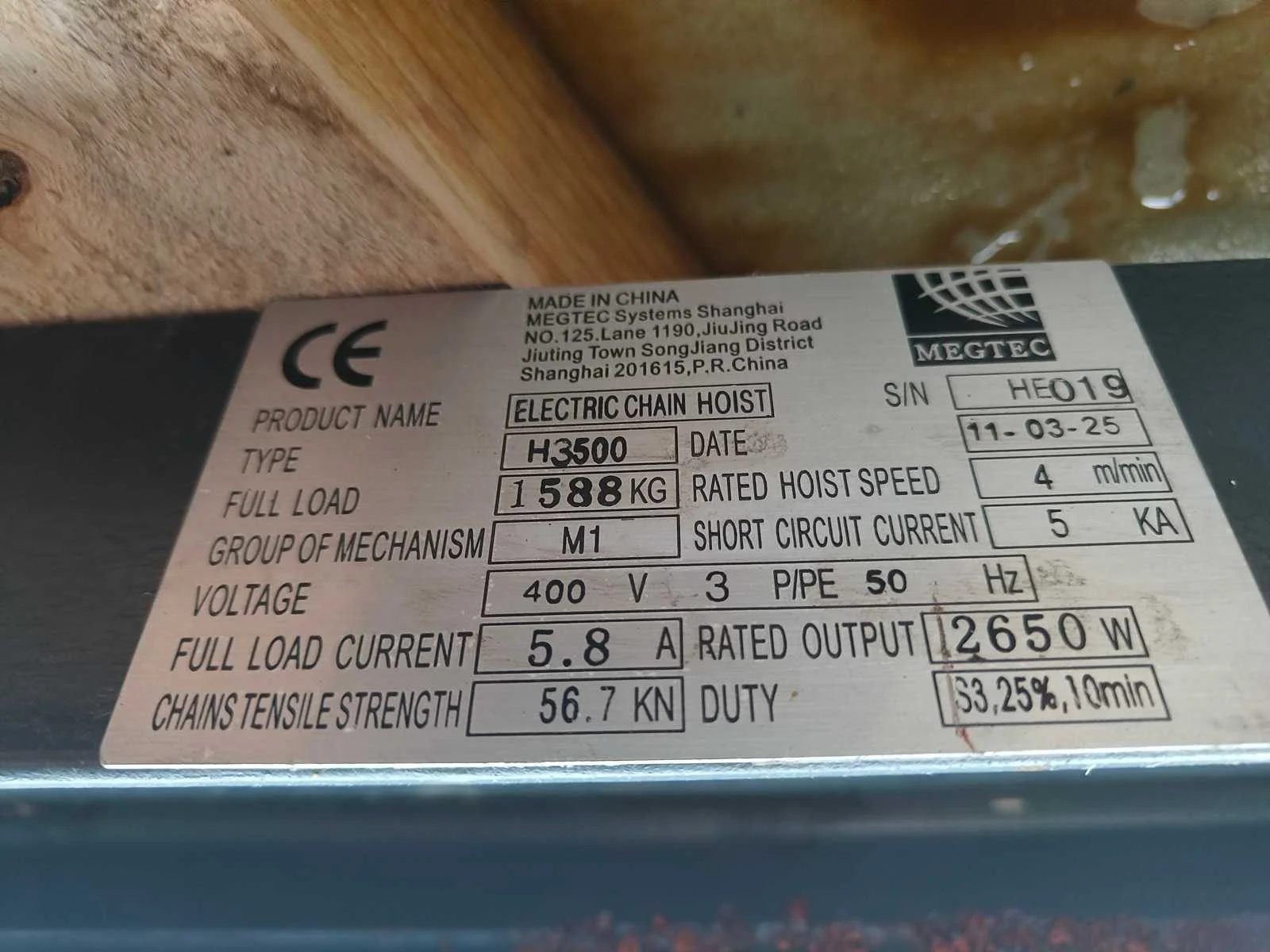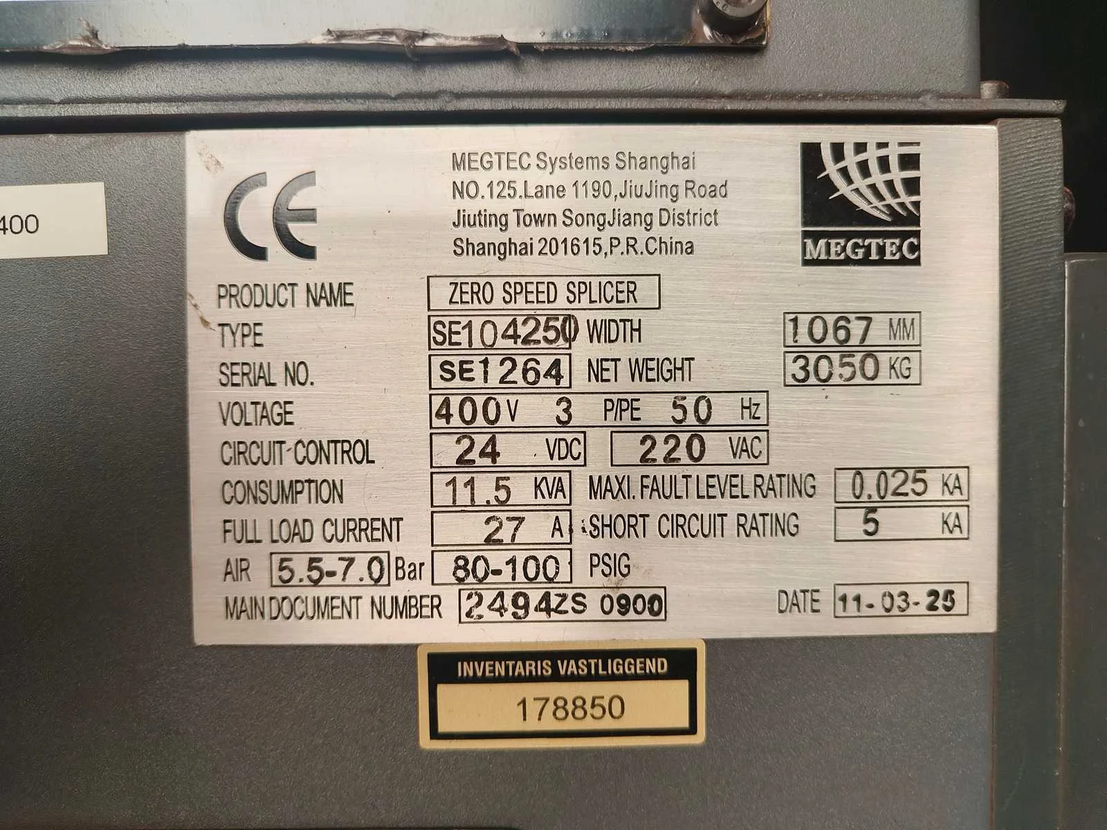 Typeplaatje: Electric Chain Hoist - Type: H3500 - Date: 2025 - SN: HE019 met Owner manual & service manual Klaar voor transport op 3 pallets: 1. Machine: 3360mm x 2320mm x 2330mm 2. Chain Hoist: 3500mm x 1010mm x 940mm 3. Platforms: 2470mm x 900mm x 520mm Nee Merk: Megtec Type: Zero Speed Splicer-SE (SE104250) Serienummer: SE1264 Aansluiting: 400V Machinegewicht: 4638kg Herkomst: USA