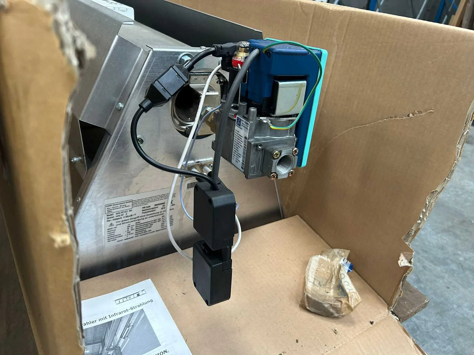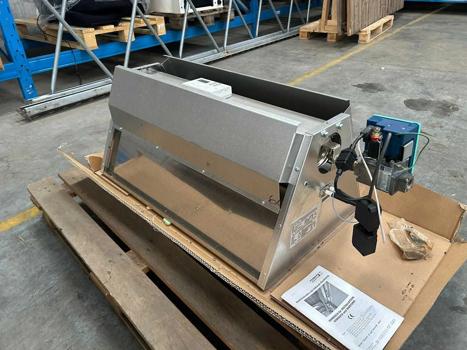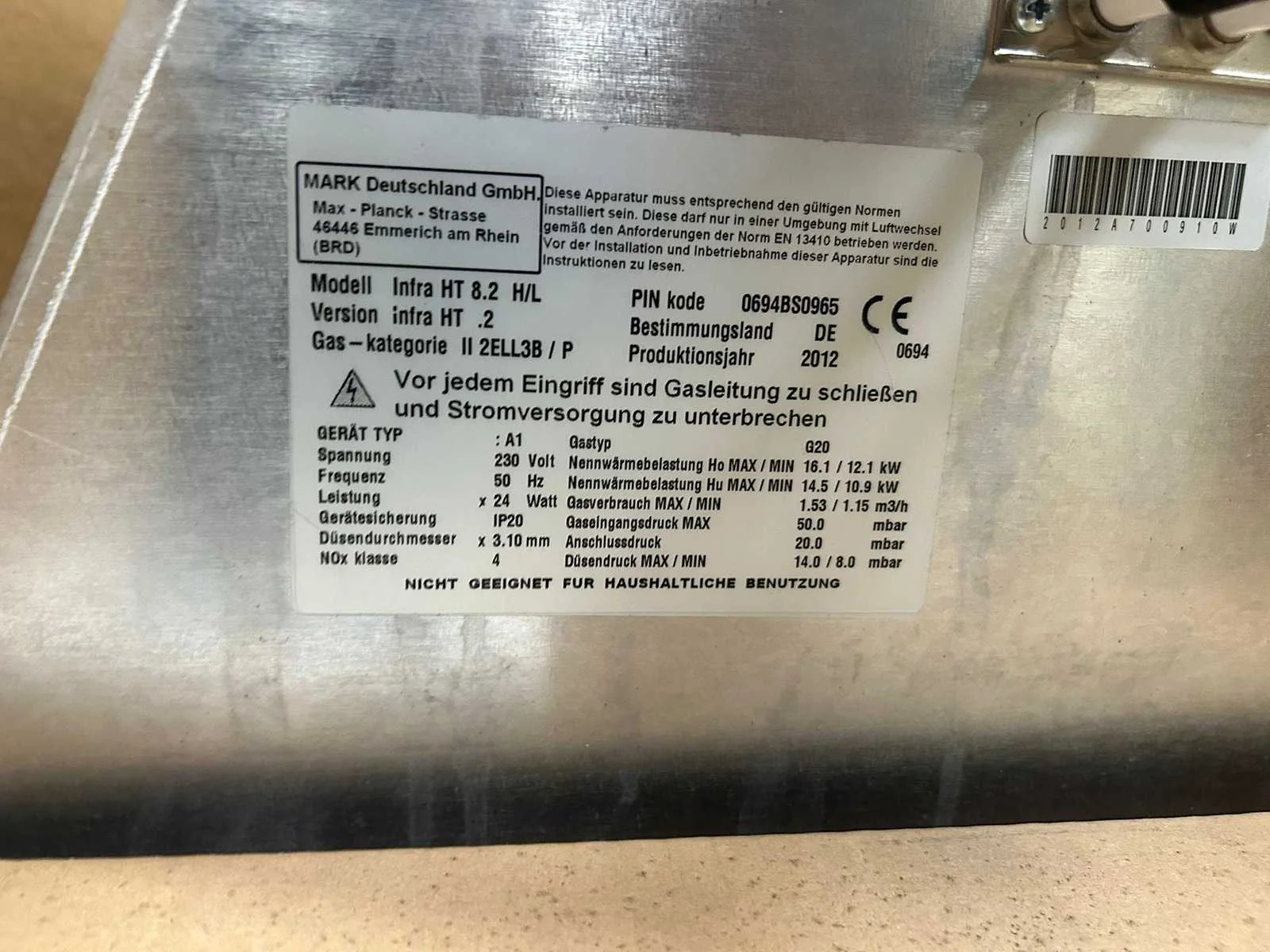 MARK gasgestookte infraroodstraler met krachtige warmteafgifte en robuuste metalen behuizing. No Merk: MARK Type: Infra HT 8.2 Bouwjaar: 2012 Serienummer: 0694BS0965 Vermogen: 24W Aansluiting: 230V Eigen gewicht: 40kg Totale afmeting L: 1000mm Totale afmeting Breedte: 470mm Totale afmeting Hoogte: 40mm
